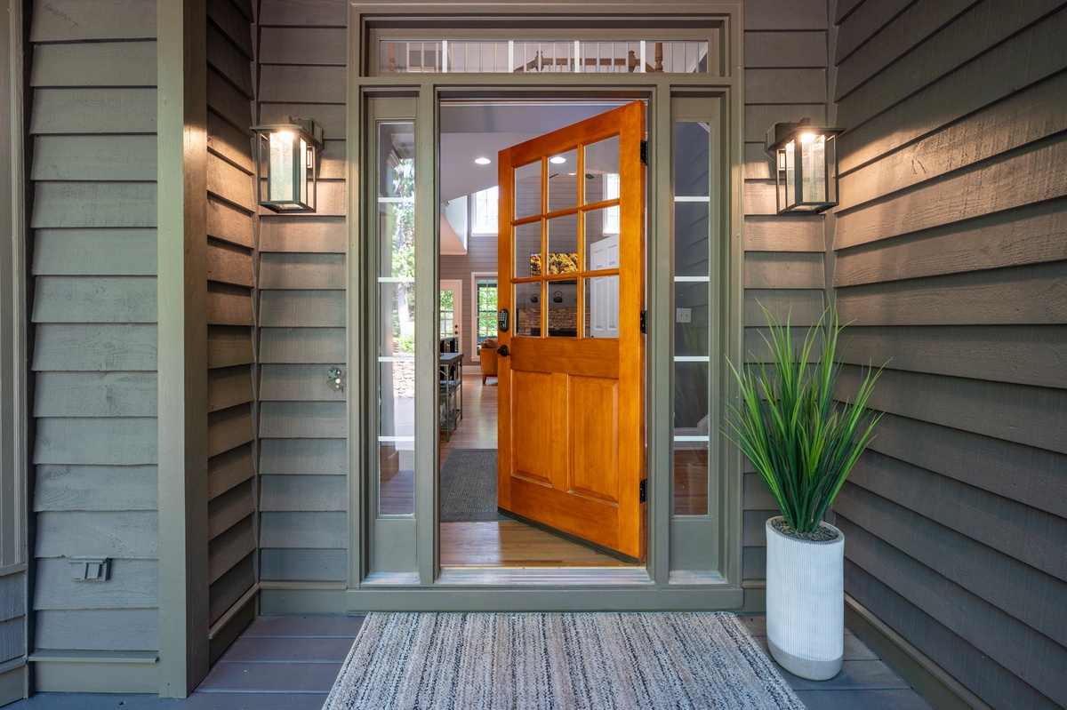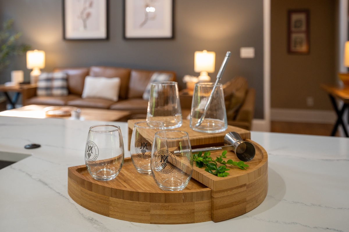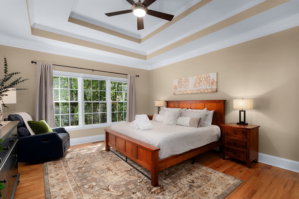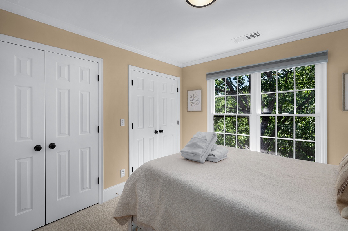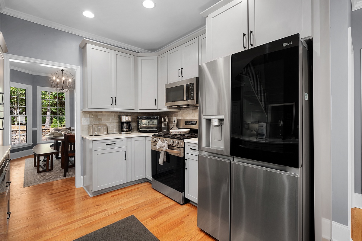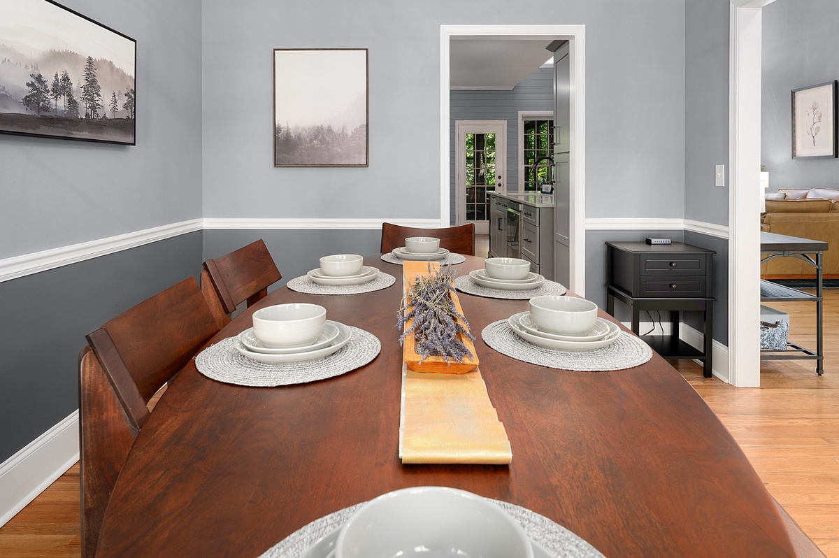 The front entrance opens to a great room with a flat-screen TV and wood-burning stacked stone fireplace, a fully furnished kitchen, and a dining room that seats 6-10. The kitchen boasts new appliances, a large prep area, and a butler's pantry with a sink. The charming breakfast area seats an additional four. Newly renovated spa-like bathrooms are throughout the home.