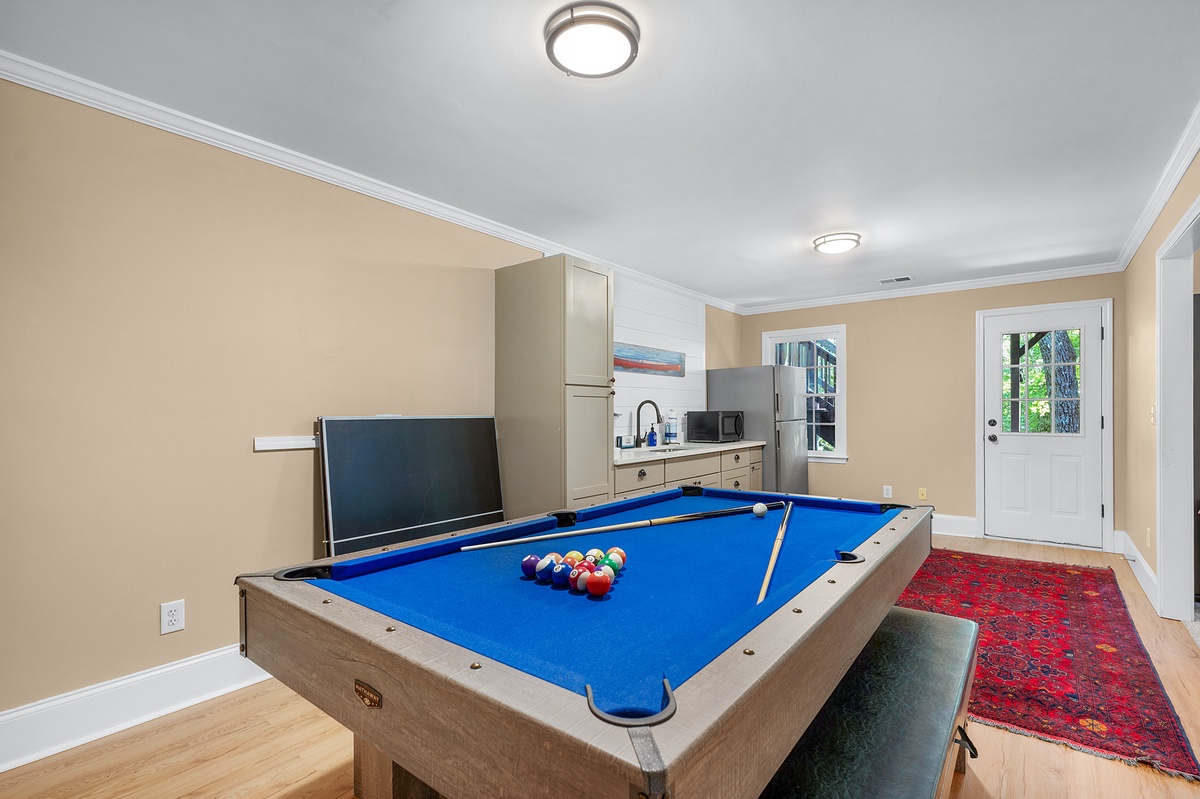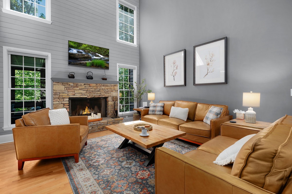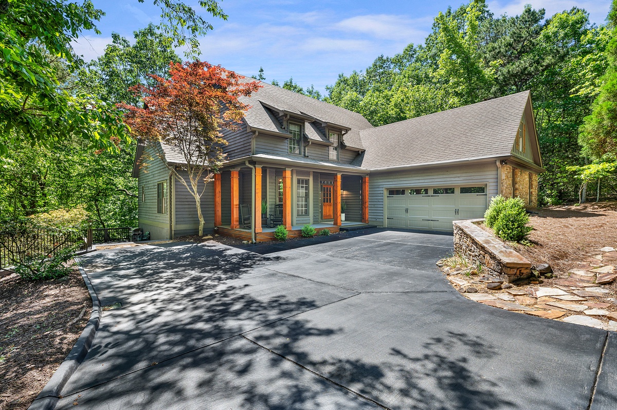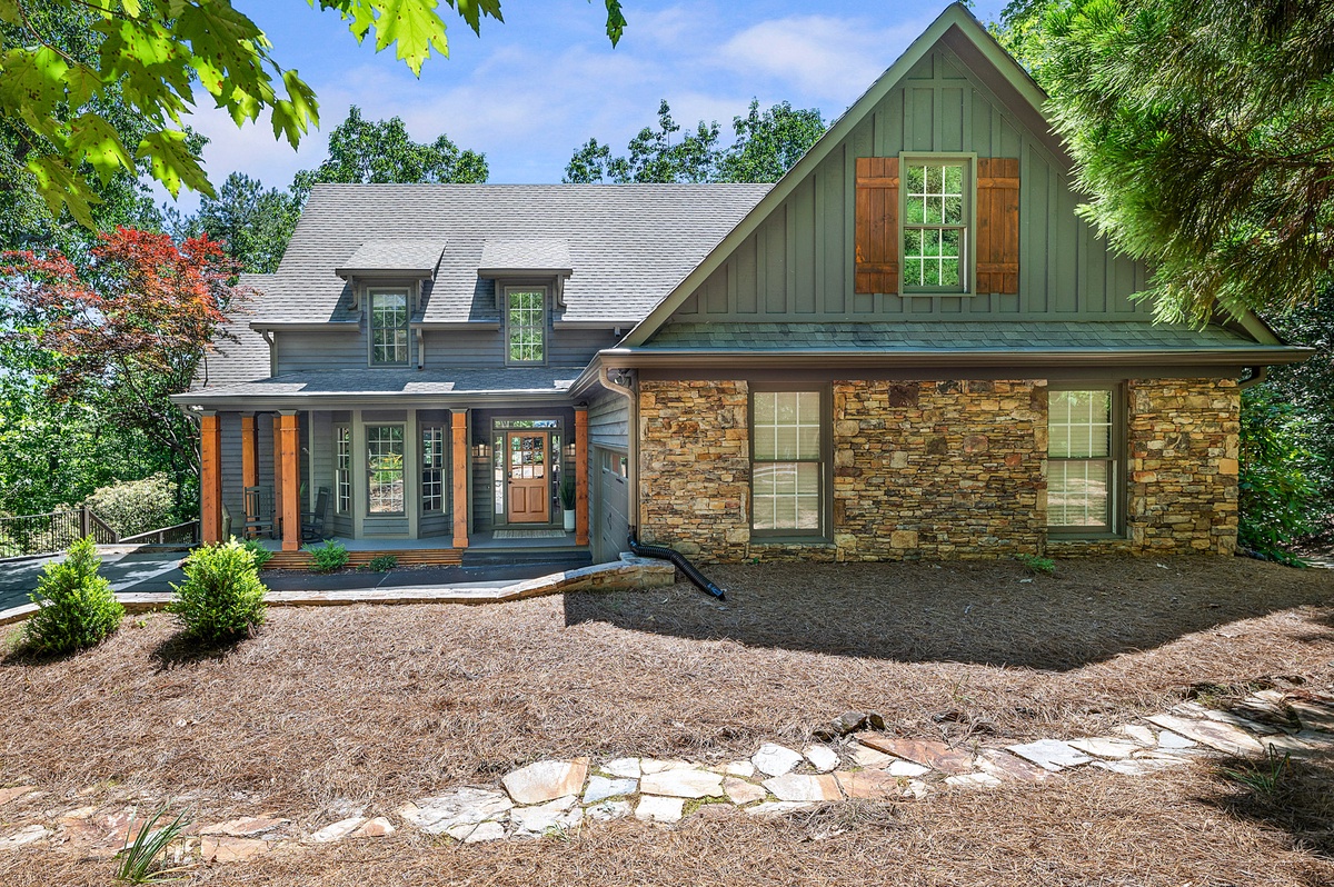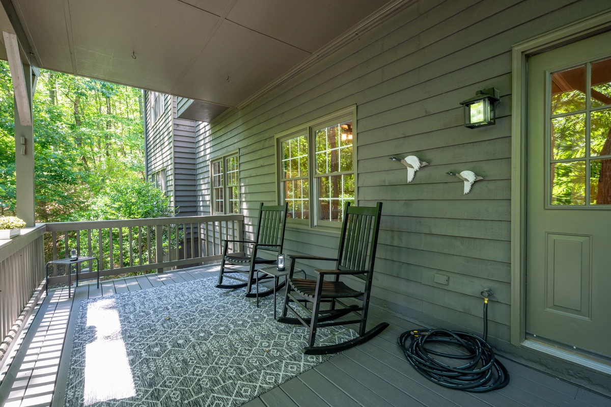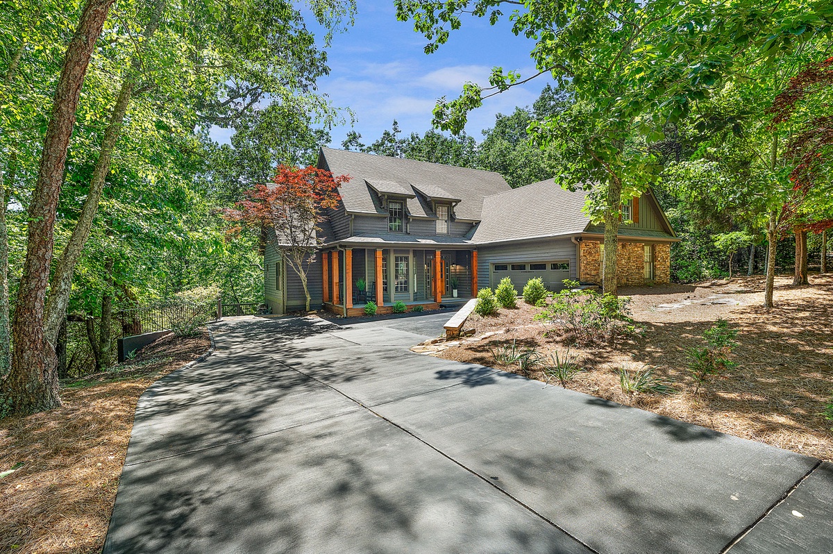 The Great Escape at Big Canoe offers convenient access to the north gate, Wildcat pool, trails, and play fields, all nestled in a serene wooded setting with ample parking. This five-bedroom, four-bath mountain home provides plenty of space to unwind. The main level features a double-height great room, a screened porch with a TV, and comfortable sofas for game or movie night. The terrace level includes a spacious living area with cozy sofas and a TV, and an adjacent game room with a multi use table for billiards, dining, or cards.Â