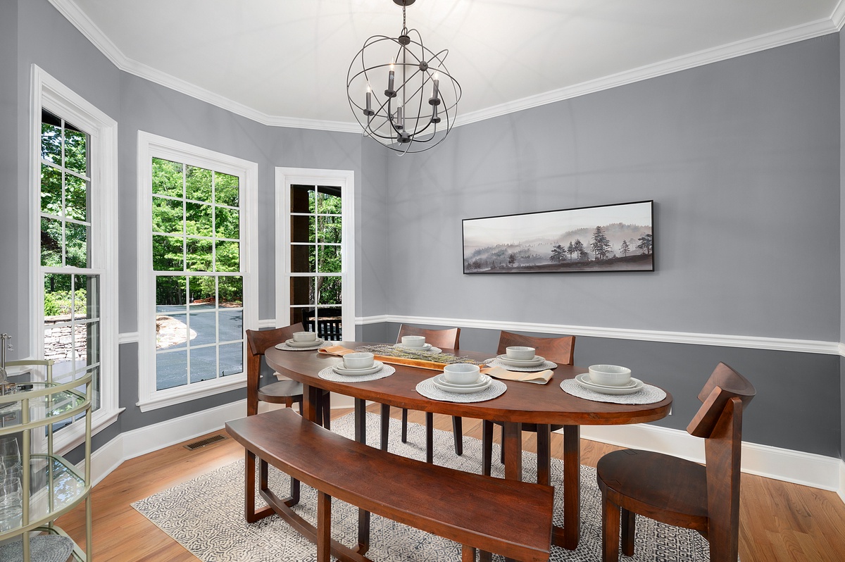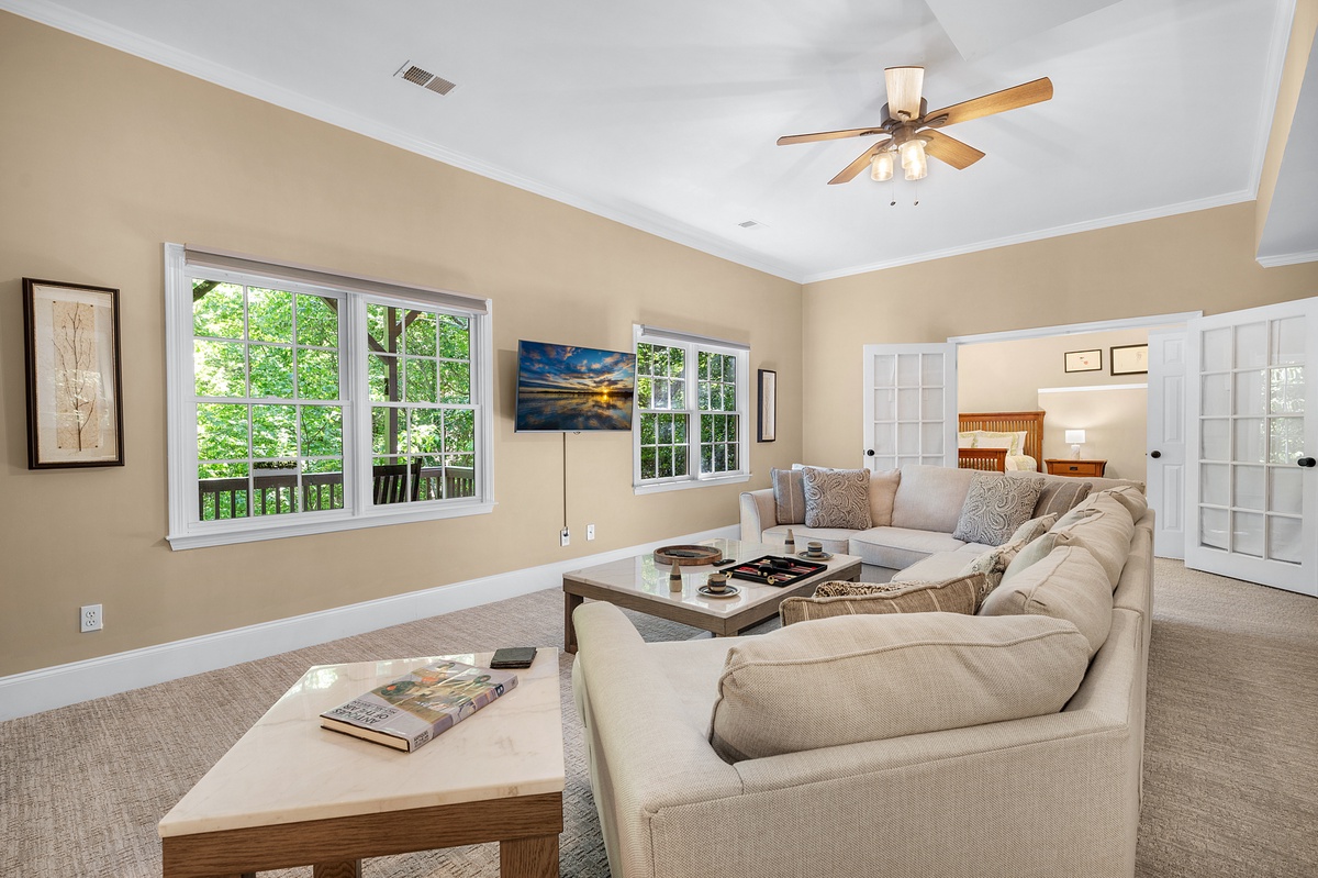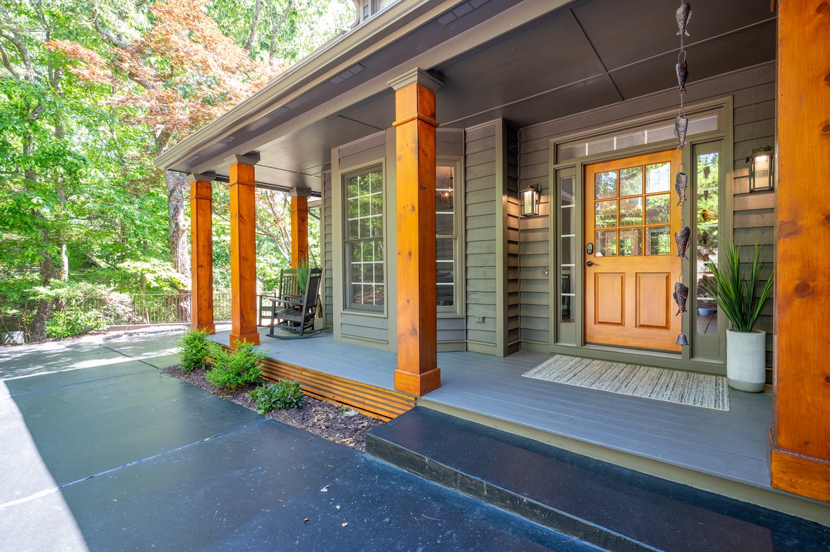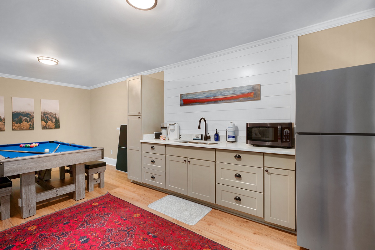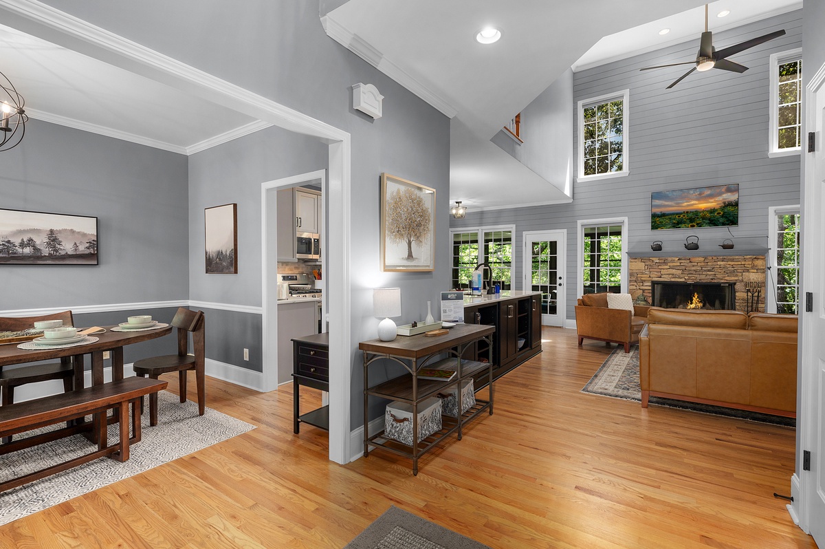 The Great Escape at Big Canoe offers convenient access to the north gate, Wildcat pool, trails, and play fields, all nestled in a serene wooded setting with ample parking. This five-bedroom, four-bath mountain home provides plenty of space to unwind. The main level features a double-height great room, a screened porch with a TV, and comfortable sofas for game or movie night. The terrace level includes a spacious living area with cozy sofas and a TV, and an adjacent game room with a multi use table for billiards, dining, or cards.Â