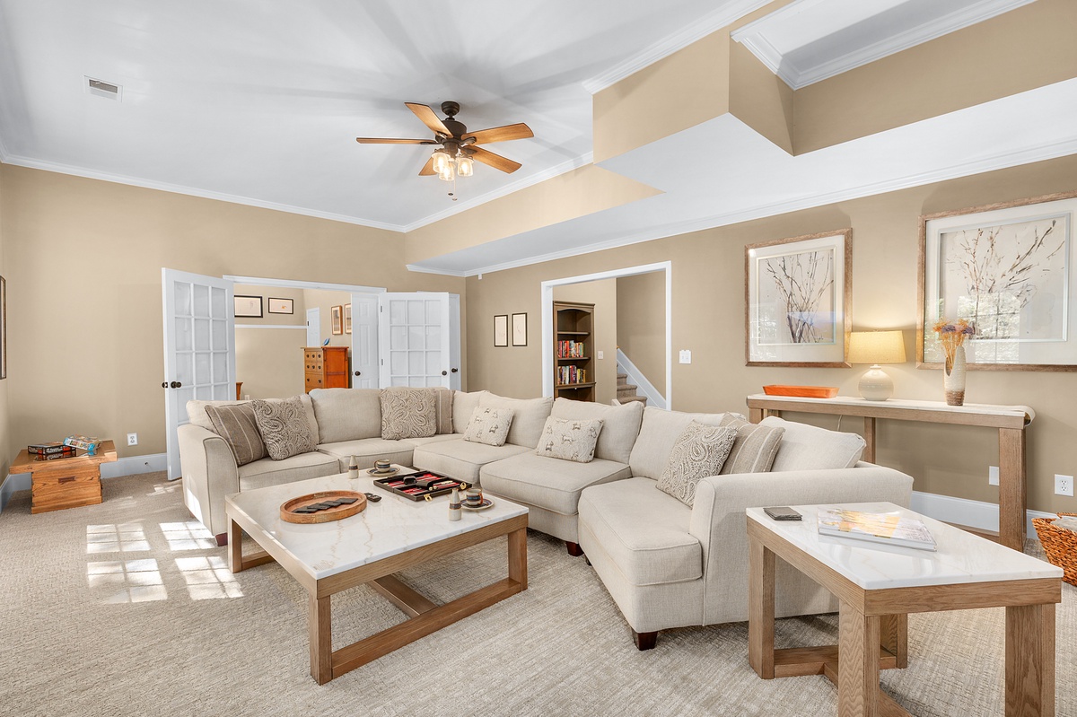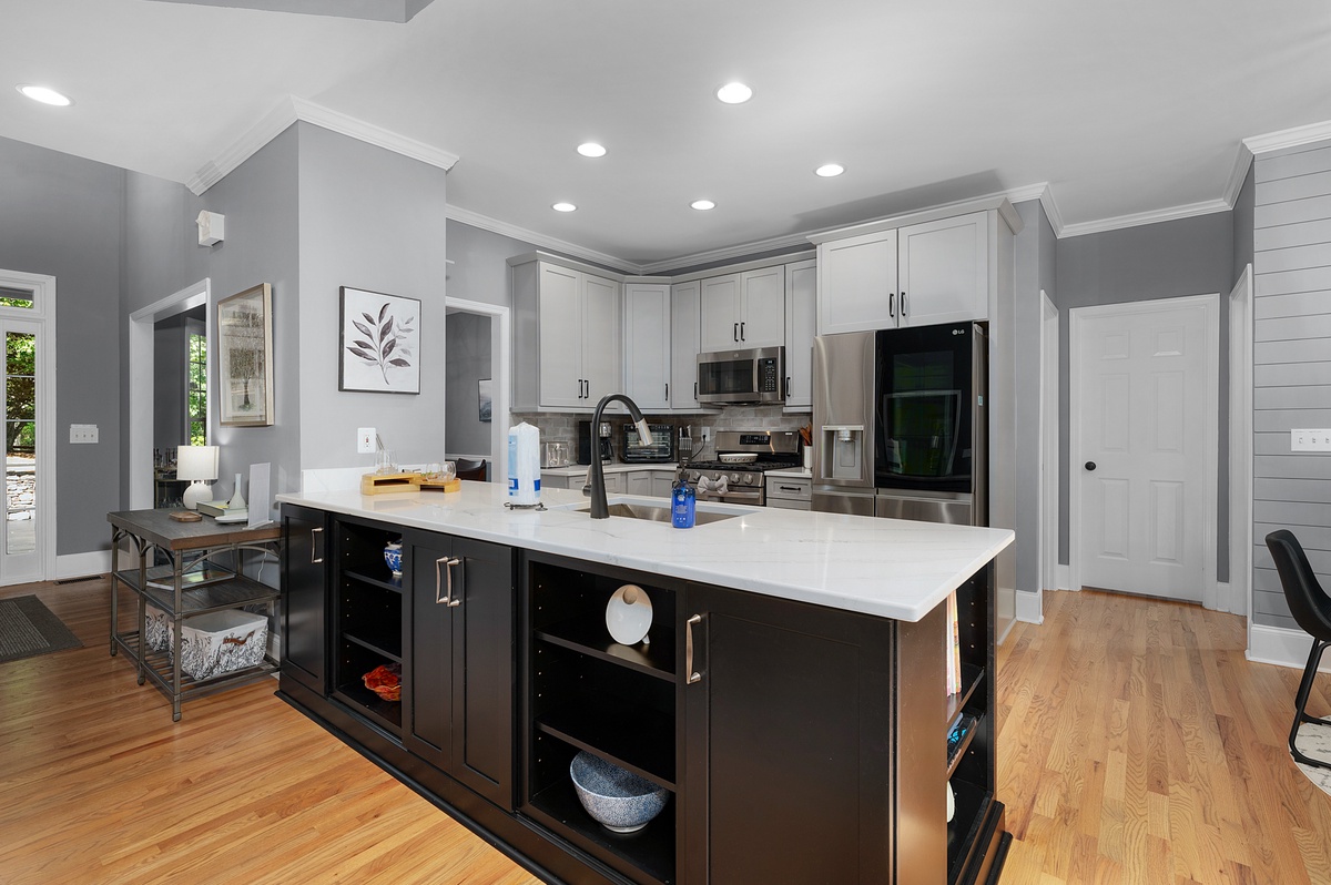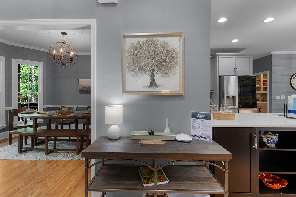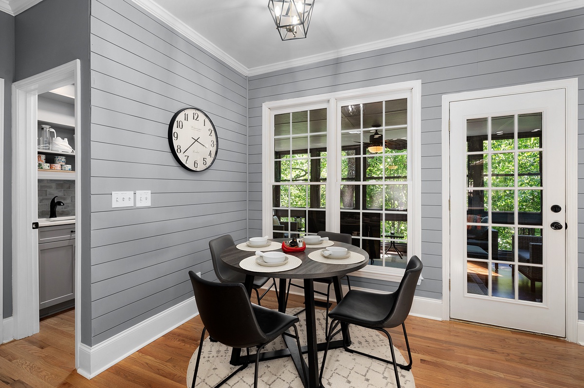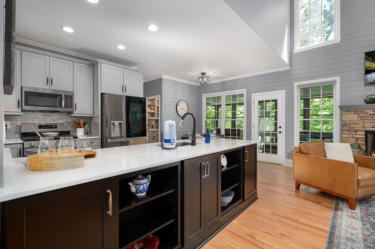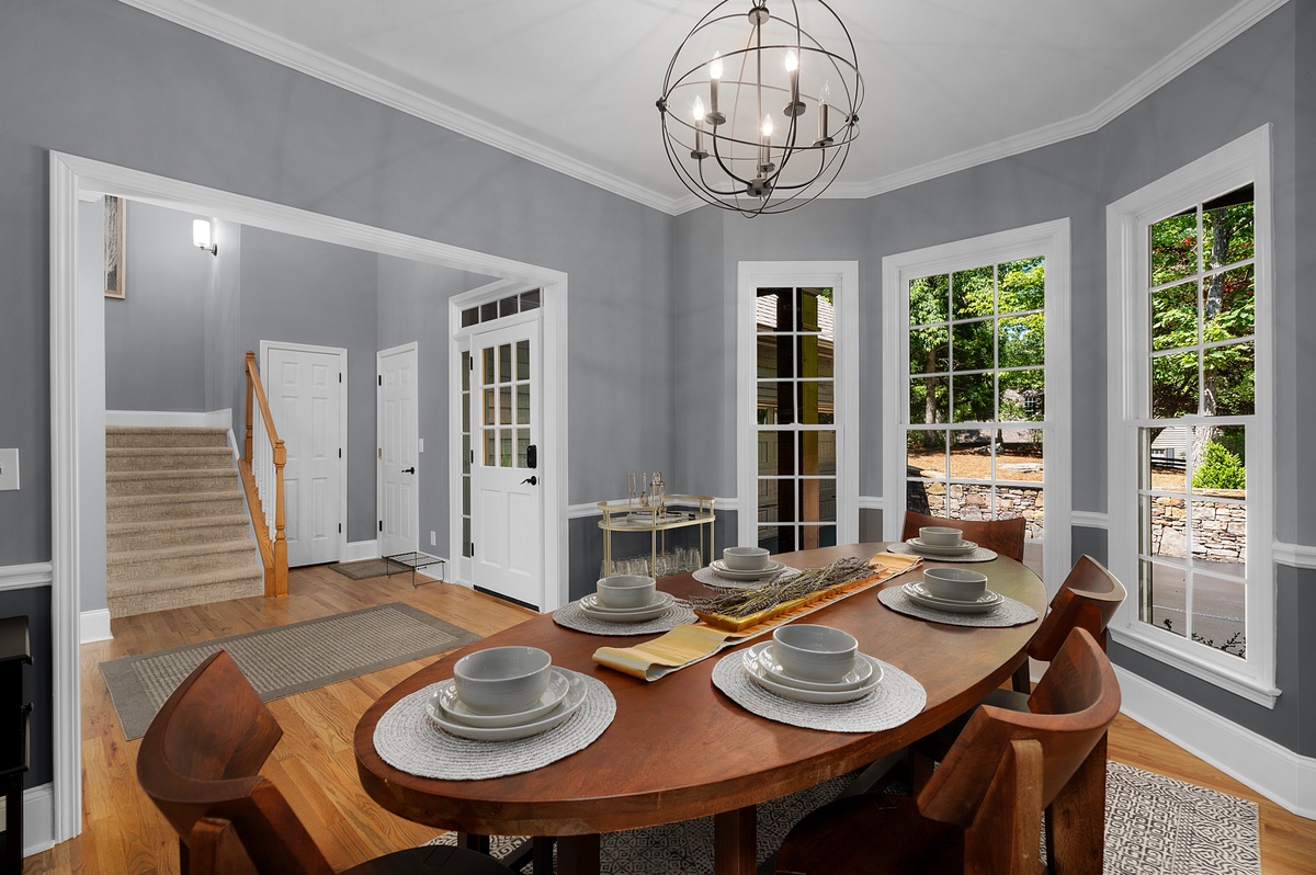 The Great Escape at Big Canoe offers convenient access to the north gate, Wildcat pool, trails, and play fields, all nestled in a serene wooded setting with ample parking. This five-bedroom, four-bath mountain home provides plenty of space to unwind. The main level features a double-height great room, a screened porch with a TV, and comfortable sofas for game or movie night. The terrace level includes a spacious living area with cozy sofas and a TV, and an adjacent game room with a multi use table for billiards, dining, or cards.Â