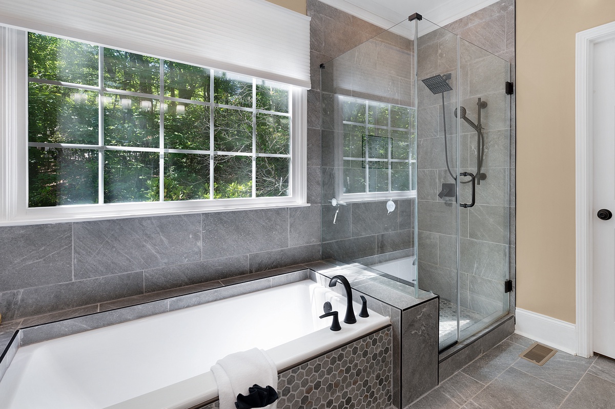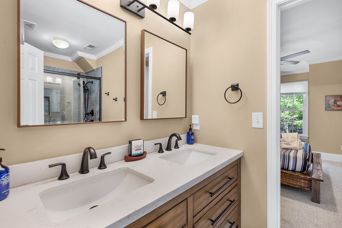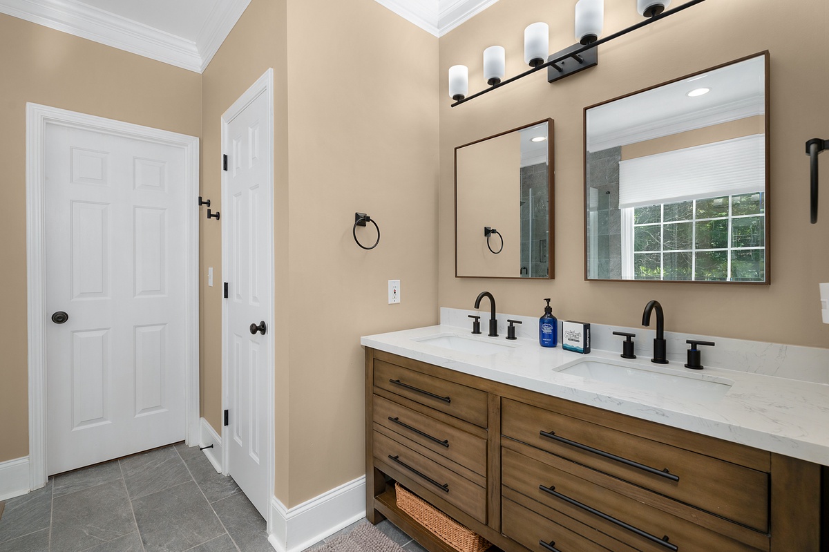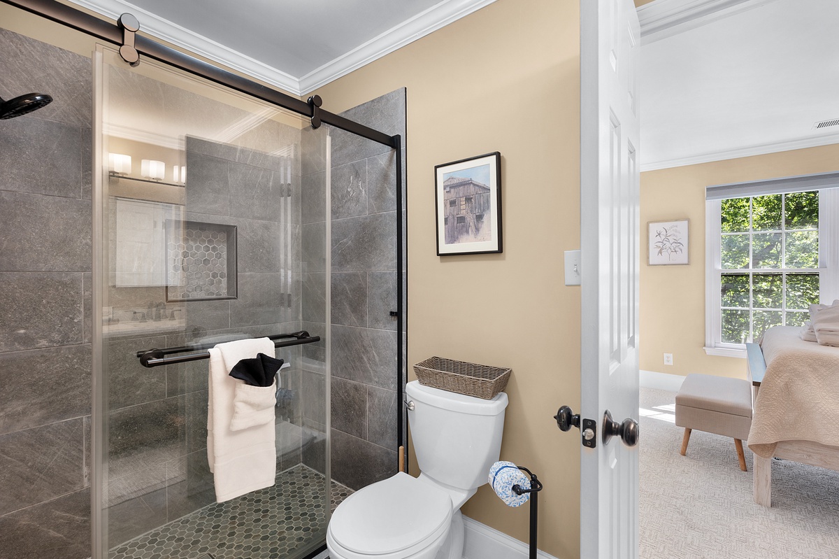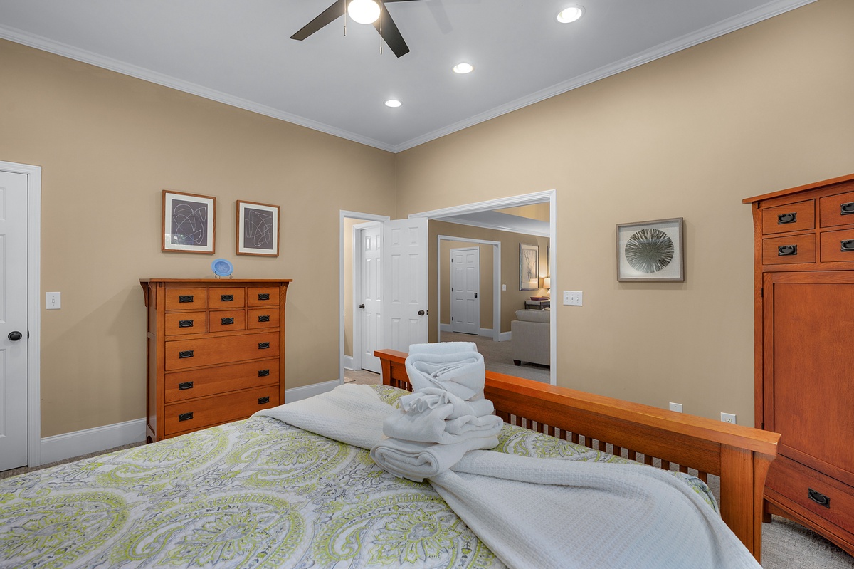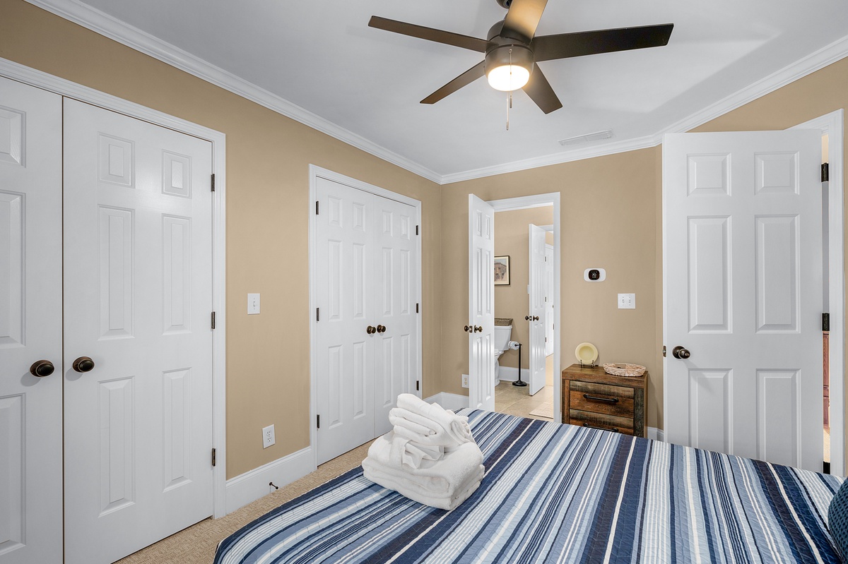 The main floor has a primary bedroom with a king bed and an adjoining bathroom with a tub and walk-in shower, and a queen bedroom with an attached bathroom with a walk-in shower. The upper level features two bedrooms (one with a queen bed and one with a double bed) that share a Jack and Jill bathroom with a walk-in shower. On the terrace level, one bedroom with a queen bed has an adjoining bathroom with a walk-in shower. One of the terrace bedrooms opens to the lower living room through glass French doors.