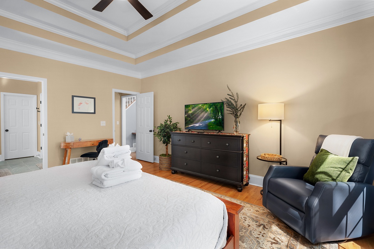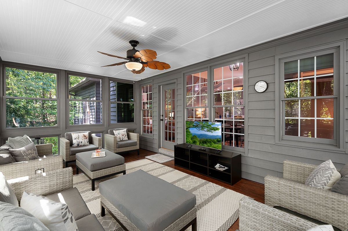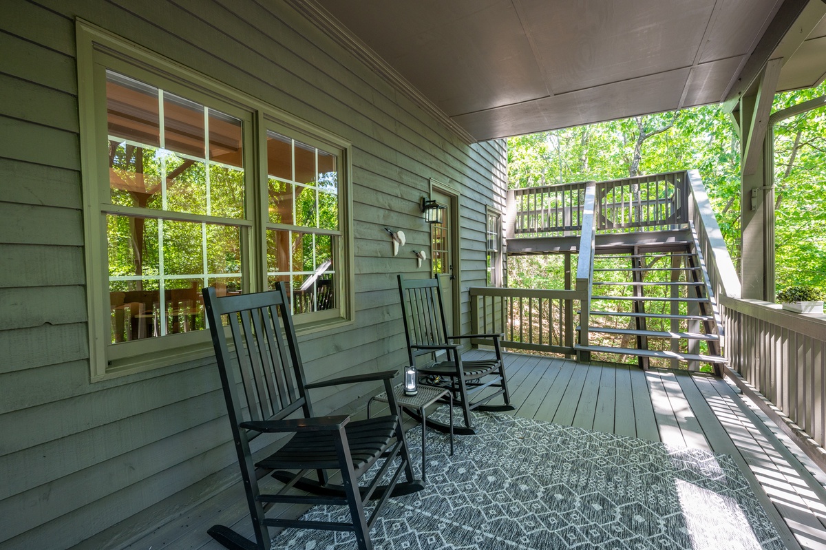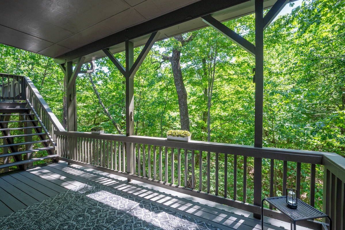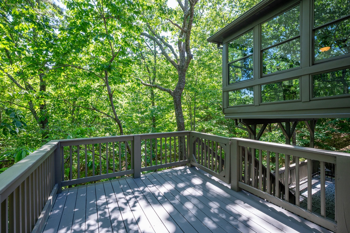This home is ideal for large families, groups, or business meetings, offering TVs in the master bedroom and both living rooms. Enjoy gorgeous wooded views and a feeling of being suspended in the trees, setting this house apart for a wonderful mountain escape.