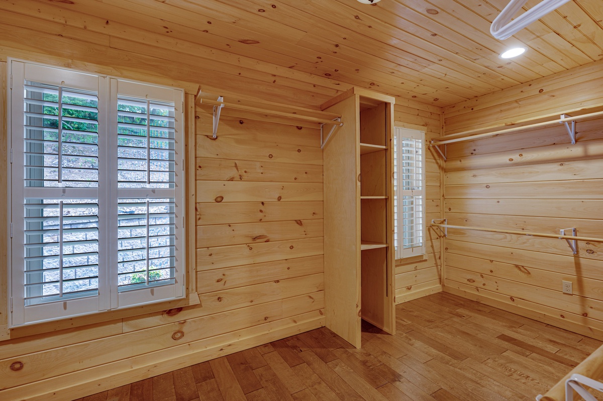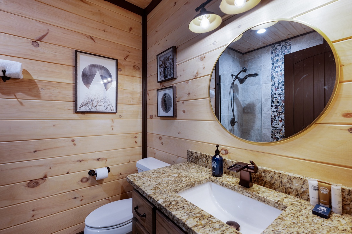 The lower-level is where you will find five other bedrooms. One guest room provides a king-size bed, 43” TV, private closet, private bathroom and forested view. Another guest room provides a king-size bed, 43” TV, private closet and mountain view. The next guest room provides a king-size bed, 43” TV, private closet, private bathroom with a shower tub combo and deck access. Another guest room provides a king-size bed, 43” TV and private closet. The last guest room holds a queen size bunk bed and a twin size bunk bed.