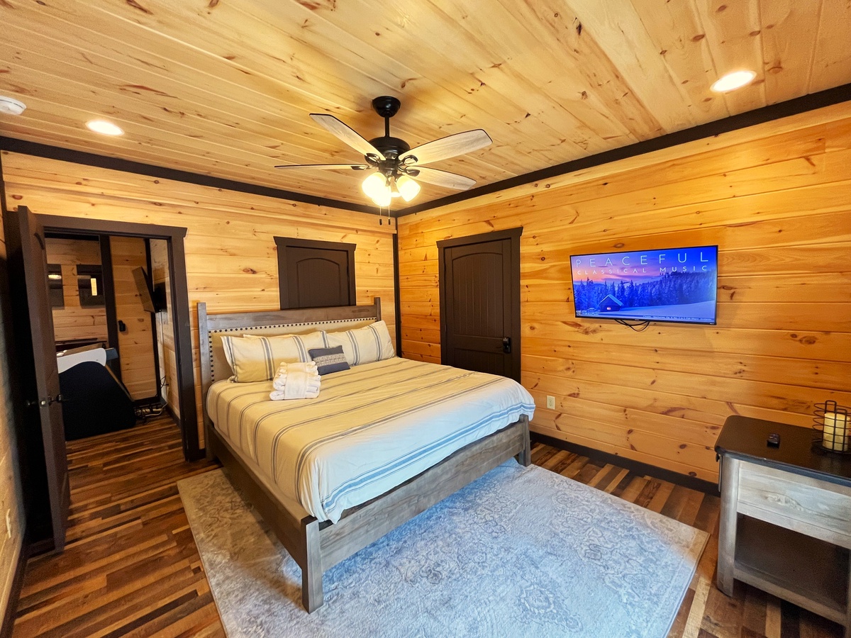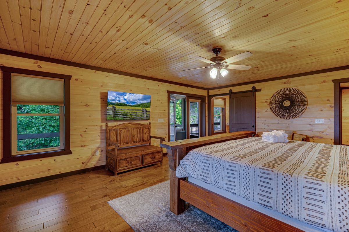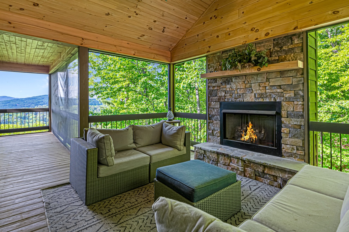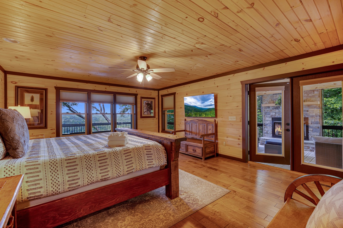 Located on the entry level, the Master bedroom greets you with mountain views, 2 interesting benches, 50”TV, large bathroom with a beautiful shower and a huge private closet. You are also provided your own private entrance to the screened in gas fireplace and furniture seating 5.