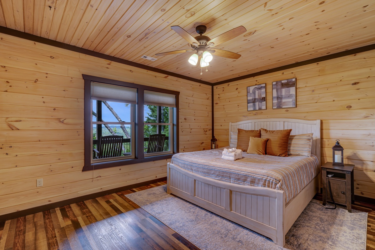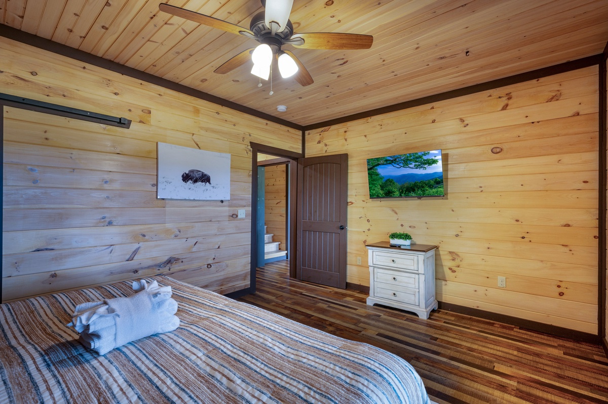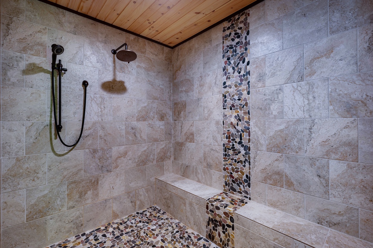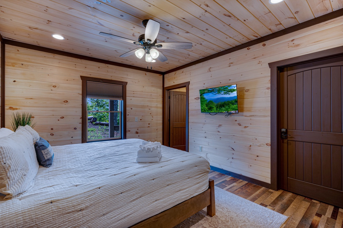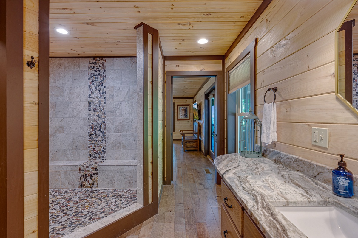Located on the entry level, the Master bedroom greets you with mountain views, 2 interesting benches, 50”TV, large bathroom with a beautiful shower and a huge private closet. You are also provided your own private entrance to the screened in gas fireplace and furniture seating 5.