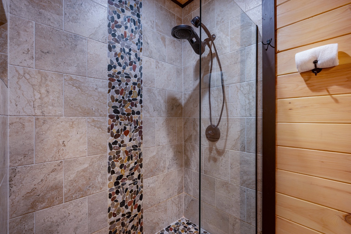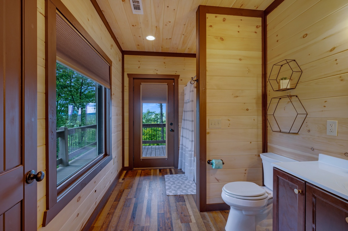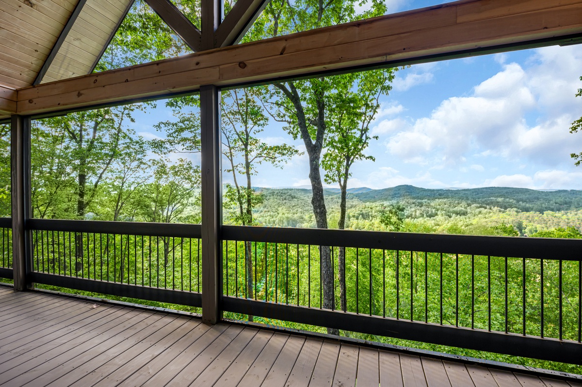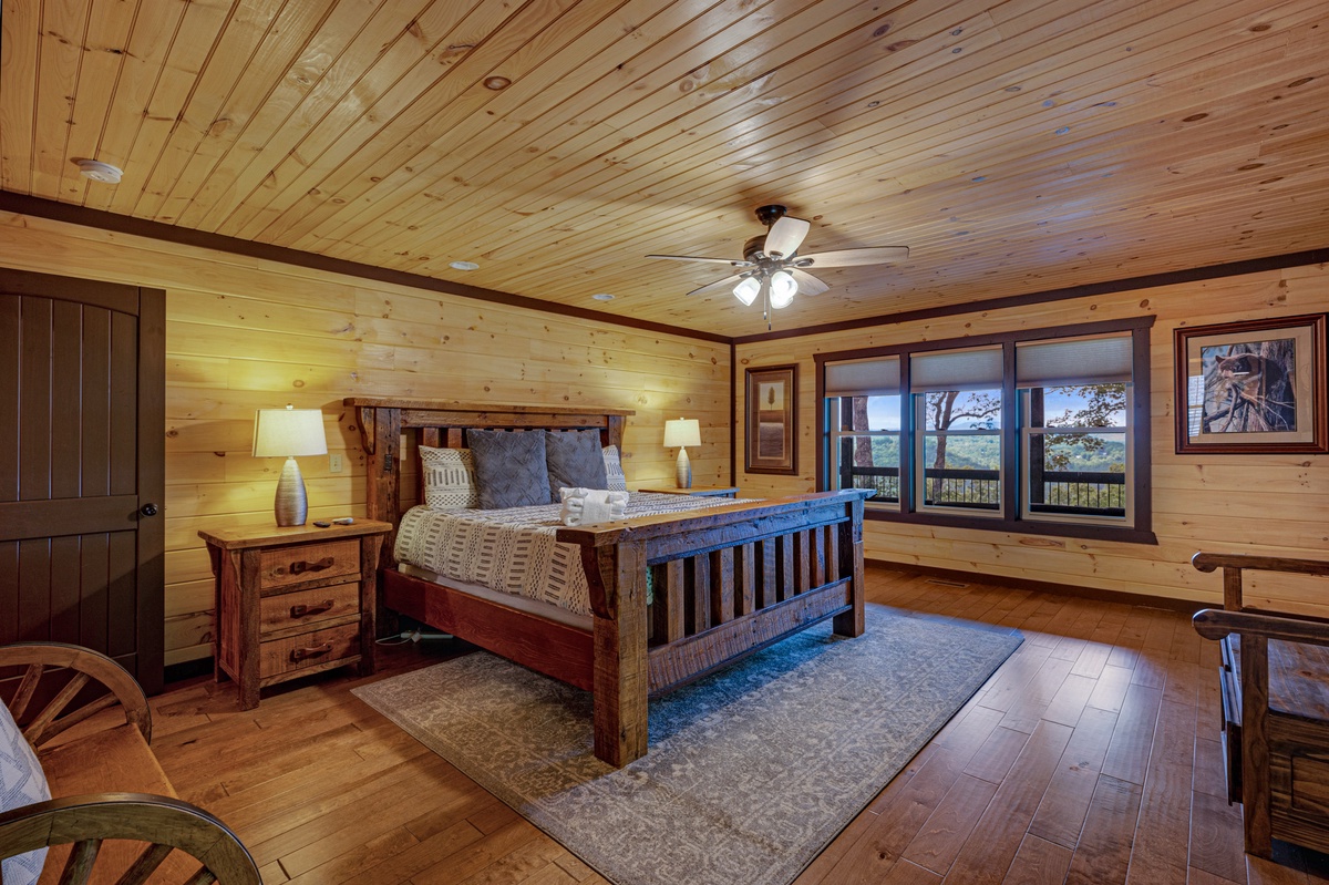 Located on the entry level, the Master bedroom greets you with mountain views, 2 interesting benches, 50”TV, large bathroom with a beautiful shower and a huge private closet. You are also provided your own private entrance to the screened in gas fireplace and furniture seating 5.