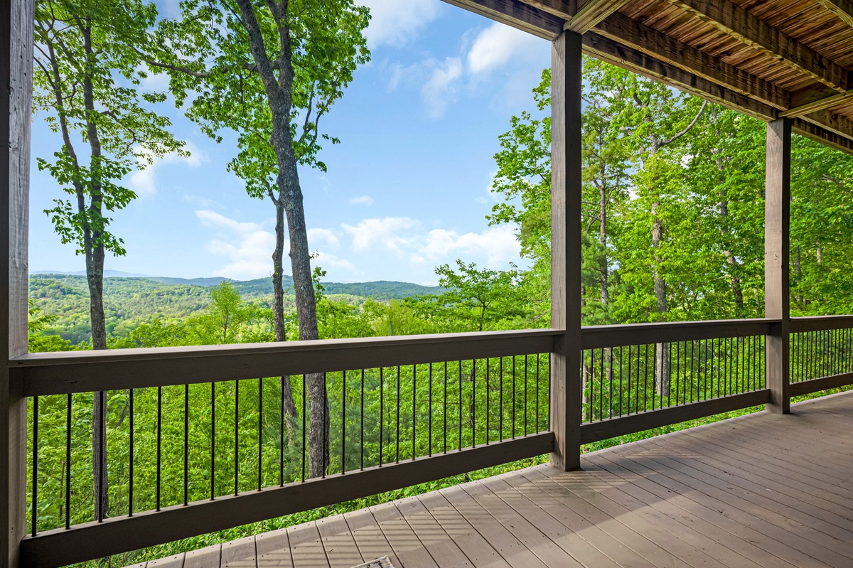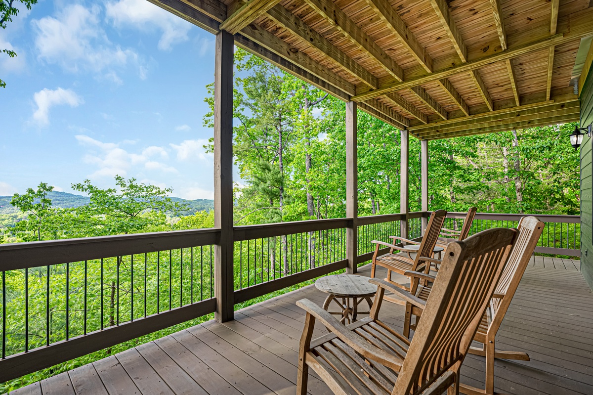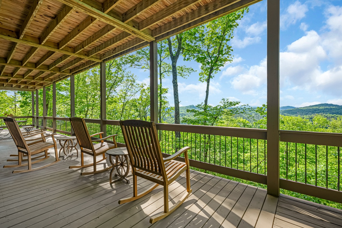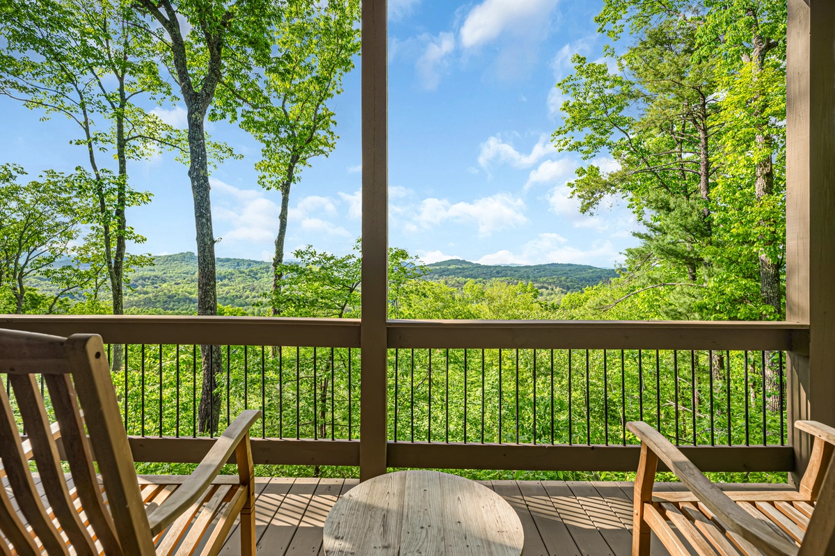 The entry level deck is where you will find the outdoor gas fireplace, a family seating area for 9+ people, outdoor dining table for 6 and the gas grill. The lower-level deck has a hot tub, 4 rocking chairs and a table with seating for 4. Both decks provide views of the Blue Ridge mountains across the way.