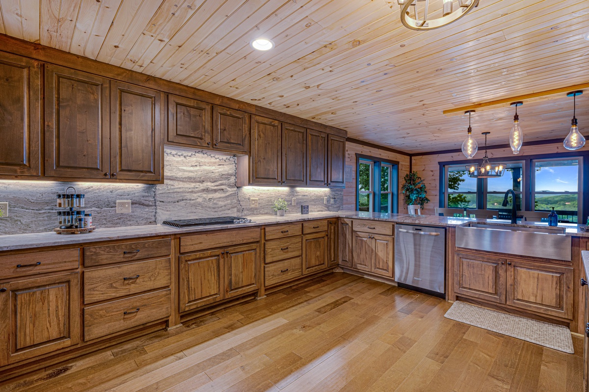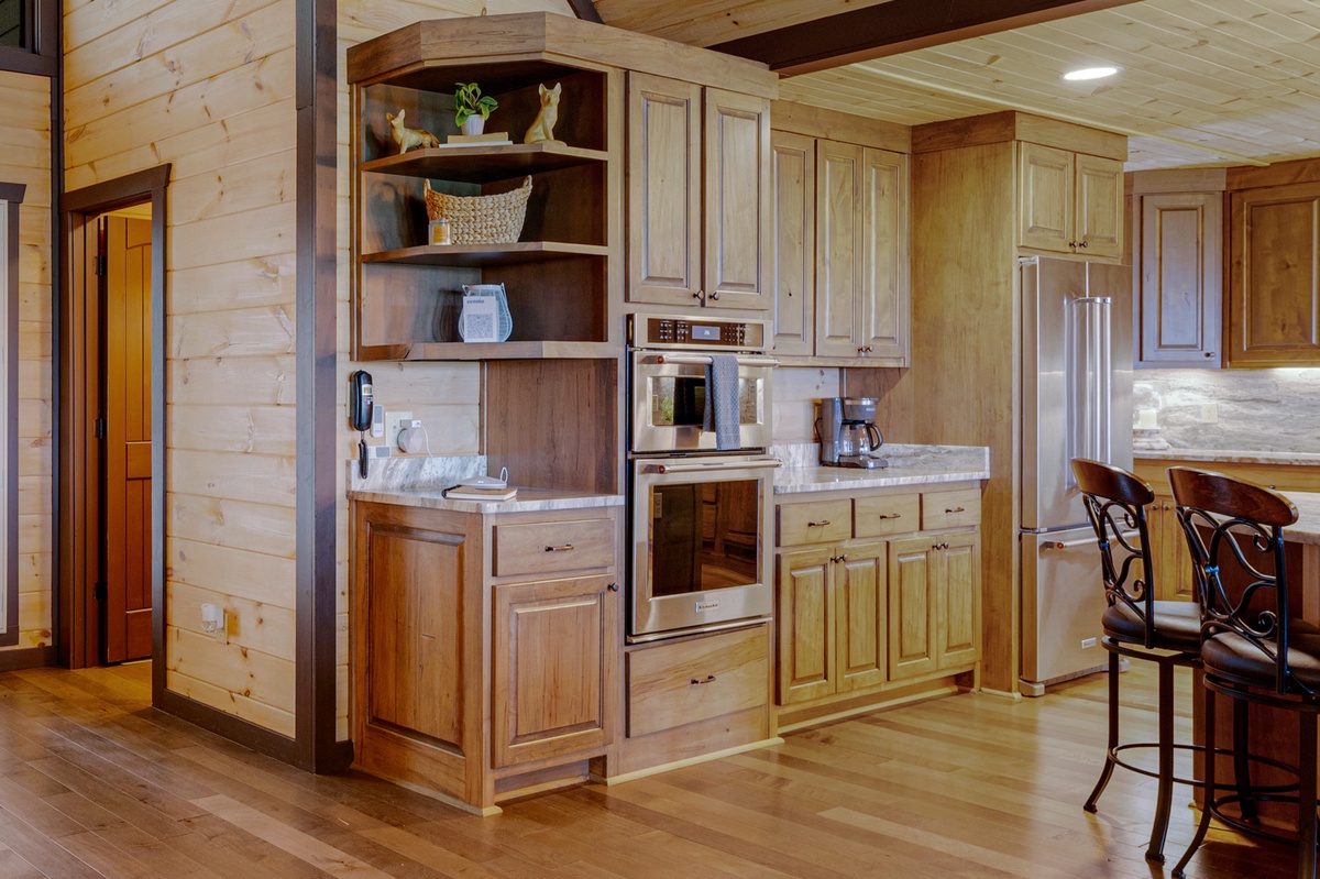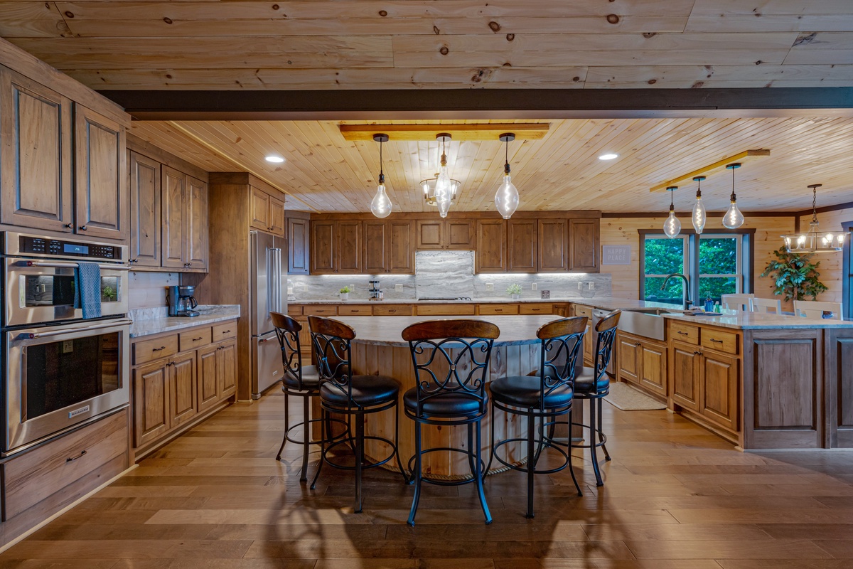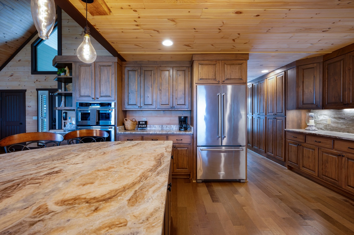 The dining area, with its’ live edge dining table seating 8, also provides views of the mountains. Serving your gourmet meals or a simple hotdog is a breeze with a kitchen countertop close by. The kitchen’s walnut cabinets will not leave you wanting for space. The kitchens’ brown fantasy marble countertop is spacious enough to allow several cooks in the kitchen at once. The 5-piece gas stove-top burner range, oven and microwave will make cooking a breeze. A butcher’s large single basin farmhouse sink allows even your kids to help with the clean-up. And for the early risers or late night snackers you’ll be greeted with a simi-circle island that seats 5. The unique leathered brown fantasy marble top will provide you a feel like no other.