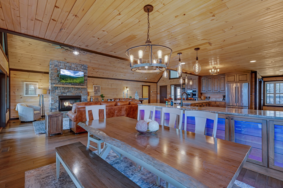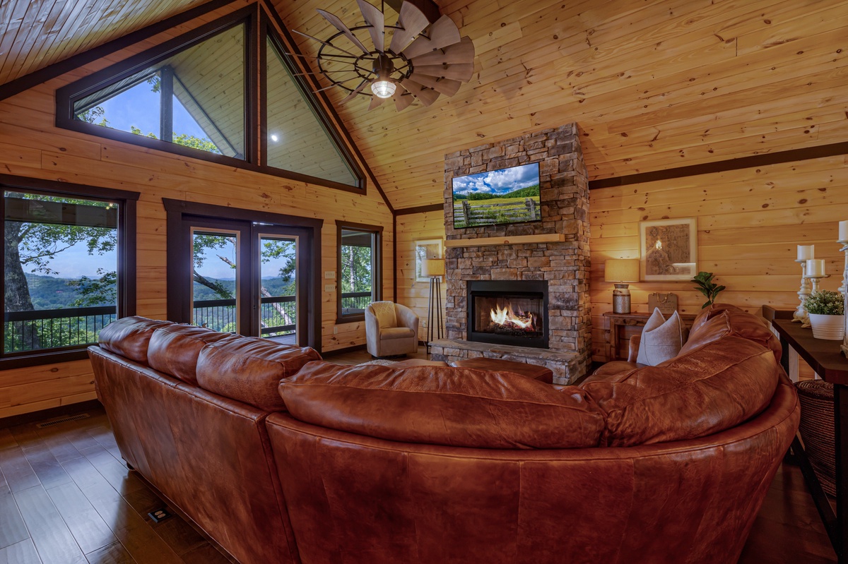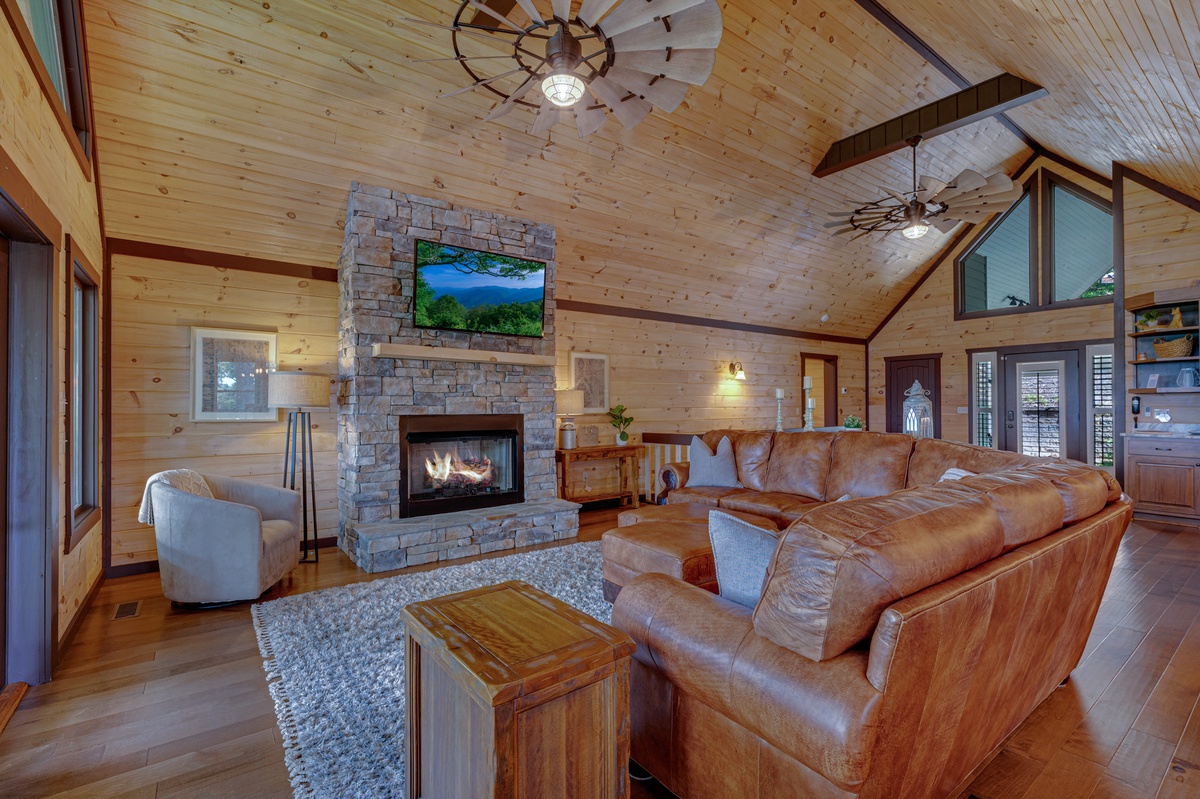 When you enter into this luxury home, you will be greeted with an open floor plan allowing you to see all the beauty this level has to offer. Walking straight ahead will bring you to the living room with its’ breath-taking views of Blue Ridge mountains, a stone gas fireplace, 15 paddled ceiling fan, 50” TV and a leather sectional sofa seating at least 7.