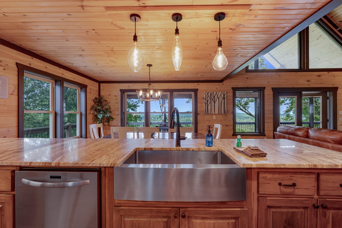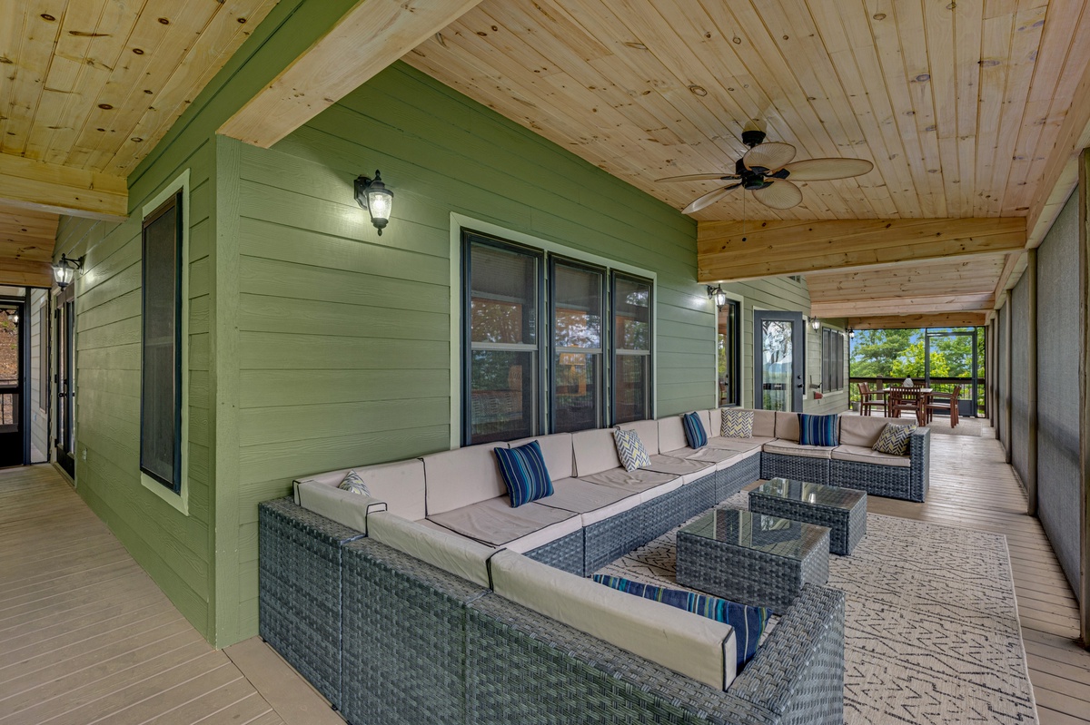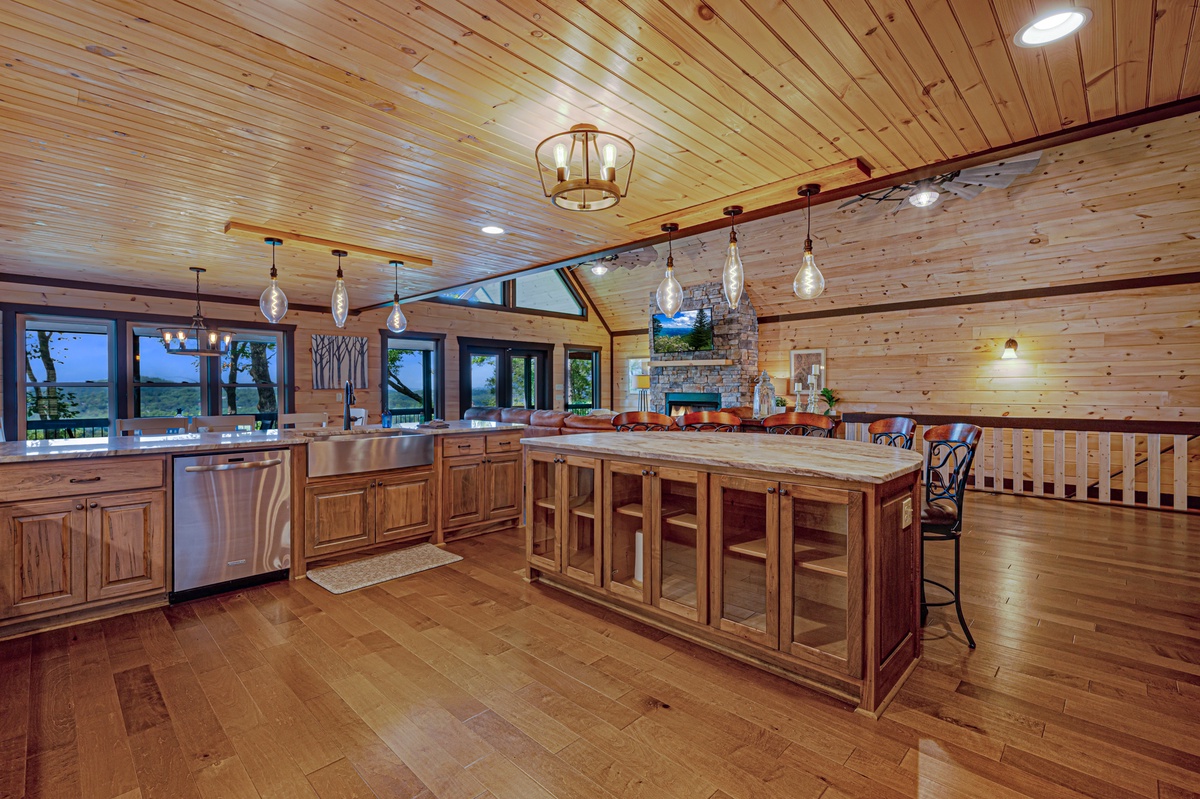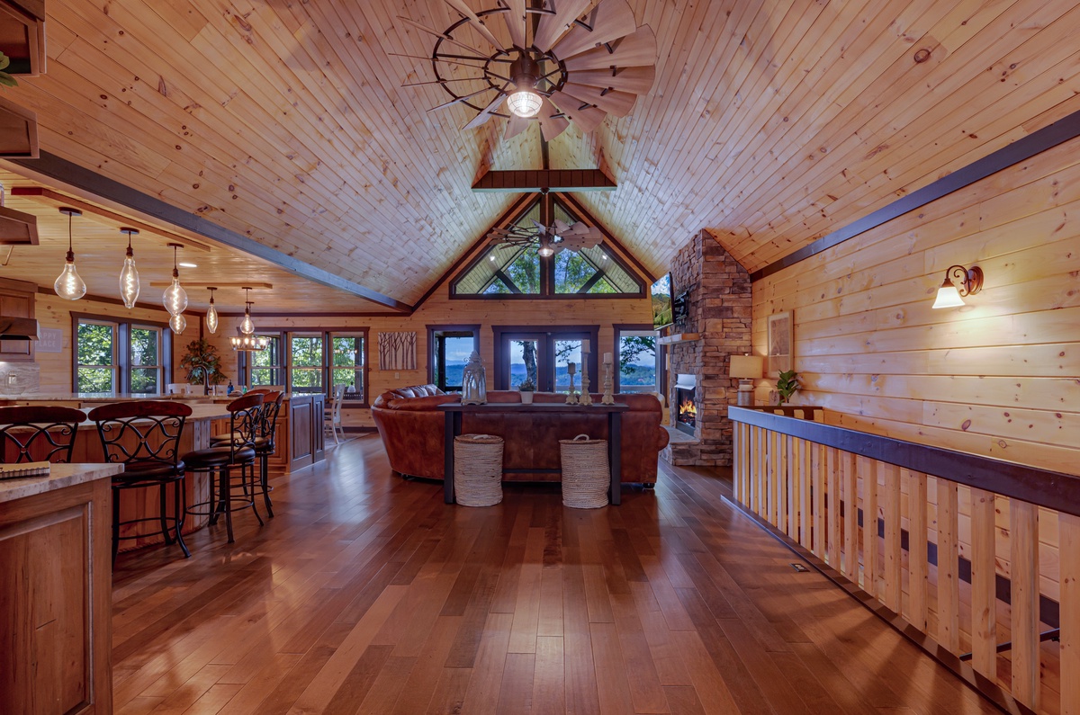 When you enter into this luxury home, you will be greeted with an open floor plan allowing you to see all the beauty this level has to offer. Walking straight ahead will bring you to the living room with its’ breath-taking views of Blue Ridge mountains, a stone gas fireplace, 15 paddled ceiling fan, 50” TV and a leather sectional sofa seating at least 7.