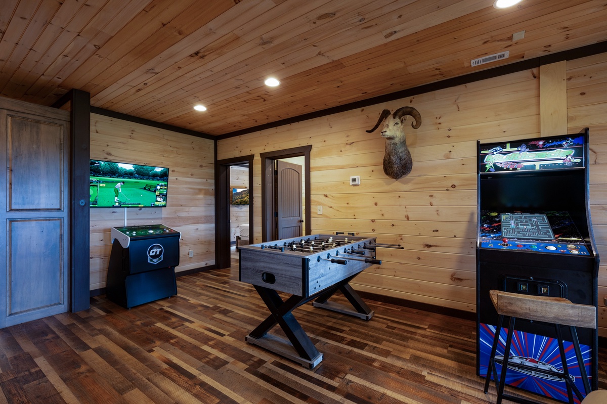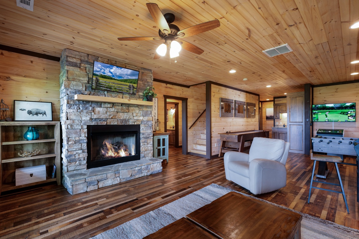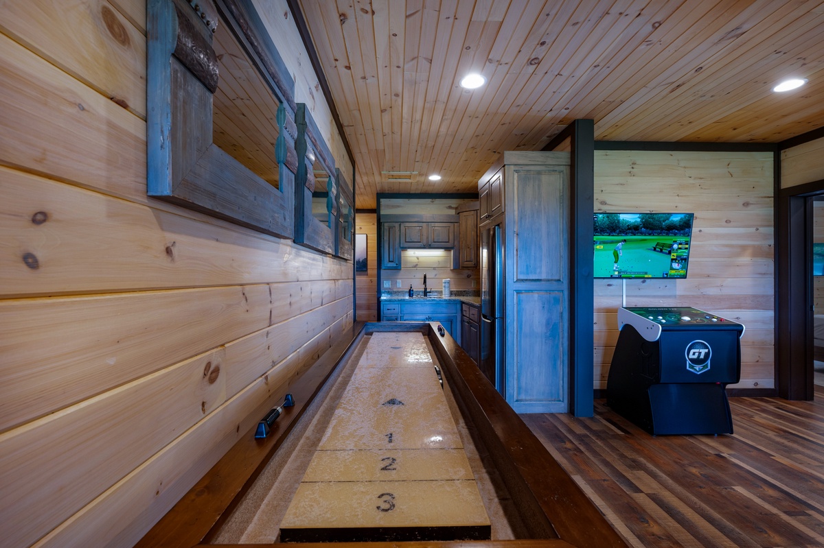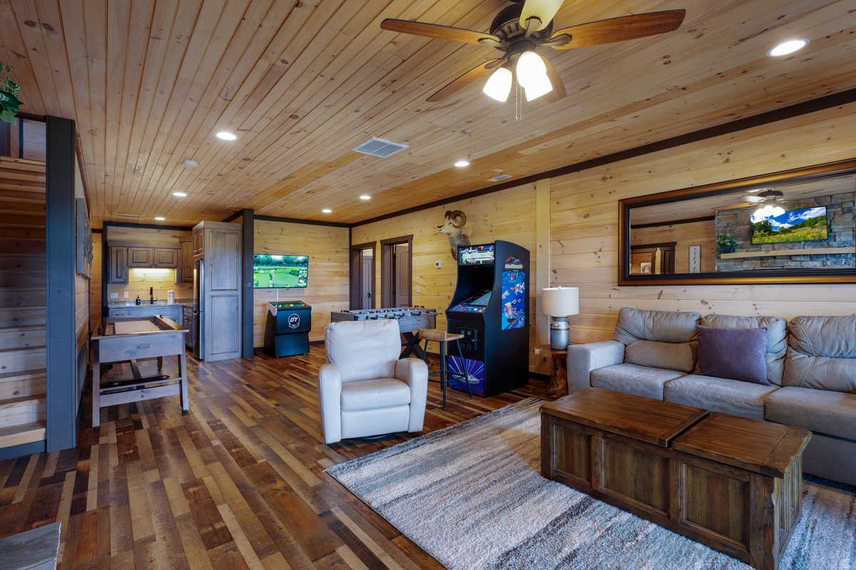 Take the stairs down to a one-of-a-kind game room that includes a shuffle board, foosball and 2 arcade games. Sofa and easy chair facing the fireplace and 43” TV provides alternate diversions. Connected to the game room, you’ll also find the kitchenette with a full refrigerator, sink and microwave. Lower-level deck access is also found here.