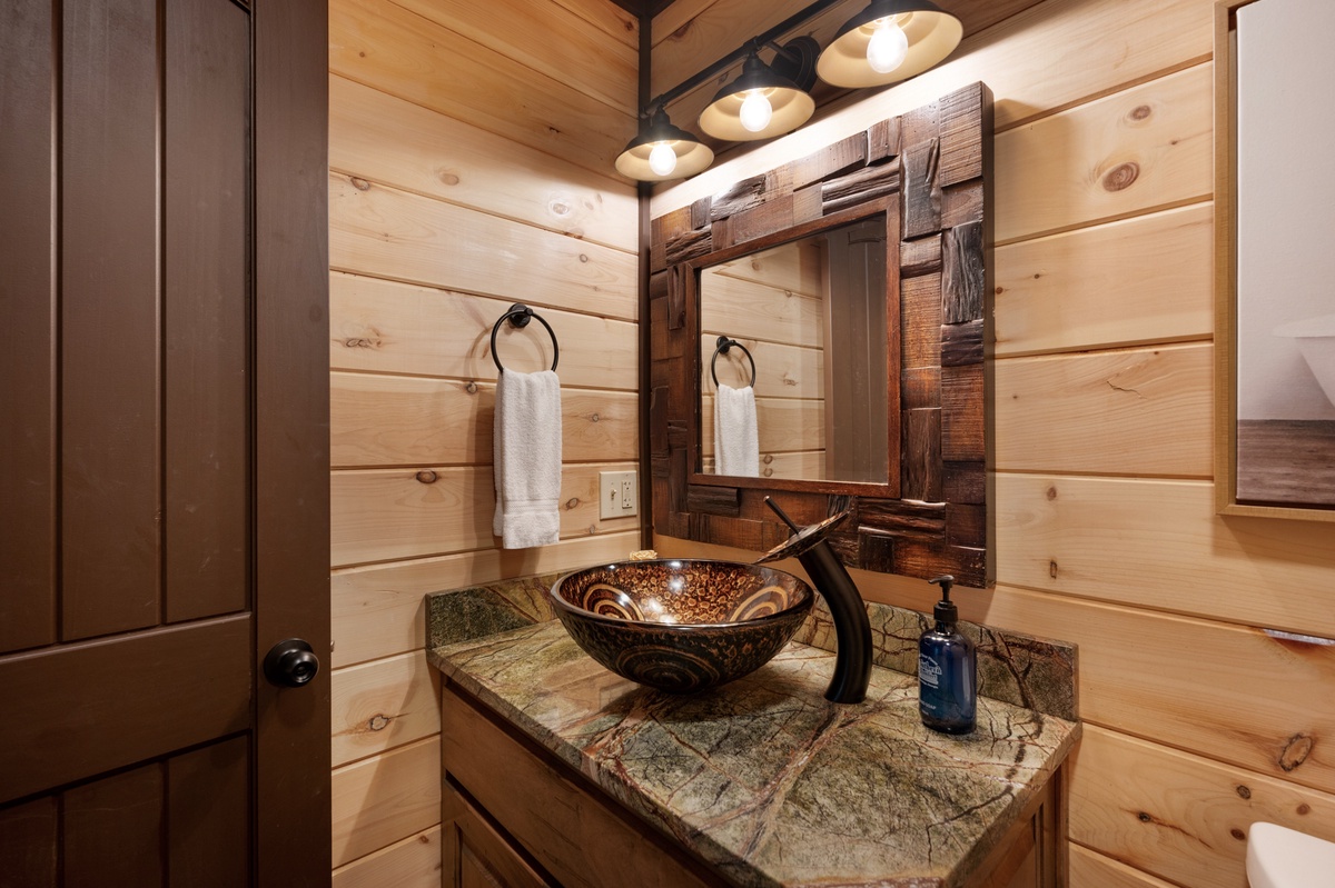 The entry level also provides a shared half bathroom with a unique sink and lovely countertop. Off the kitchen you’ll find a spacious laundry room that will take care of all of your needs.