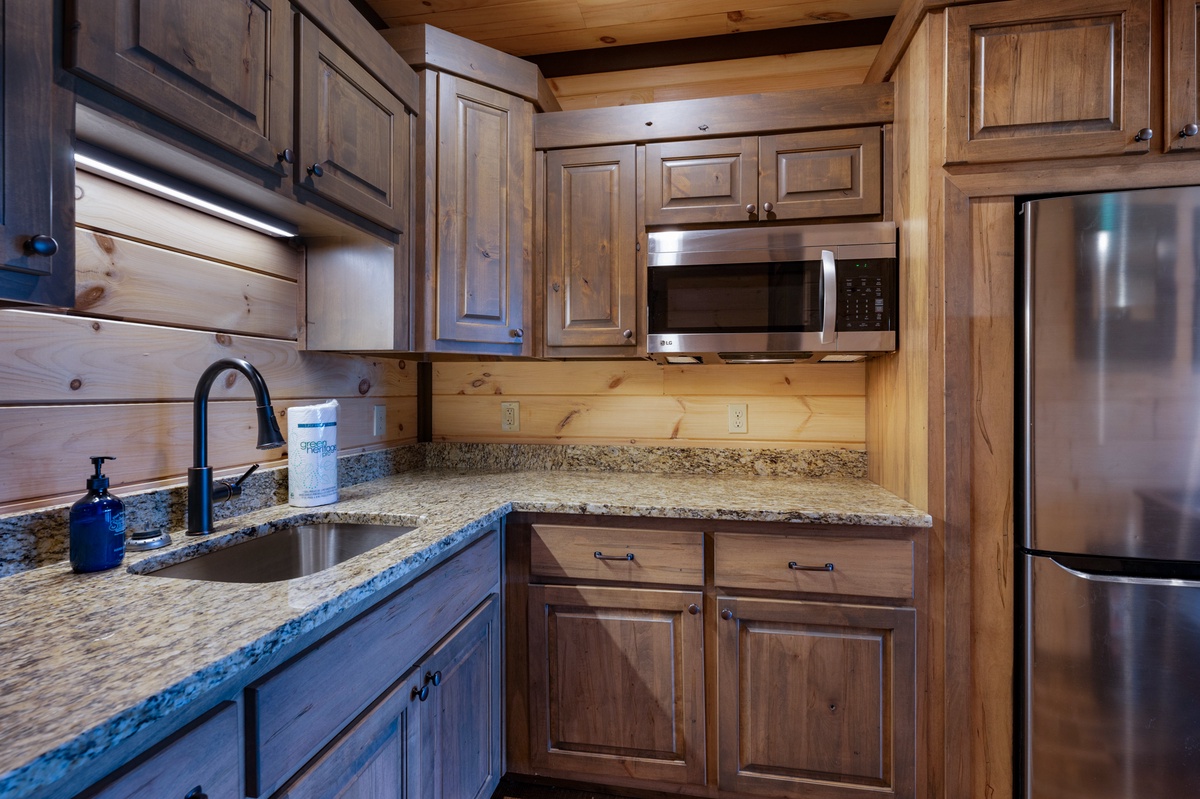 • Kitchenette with a full refrigerator, sink and microwave