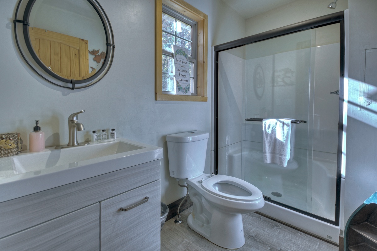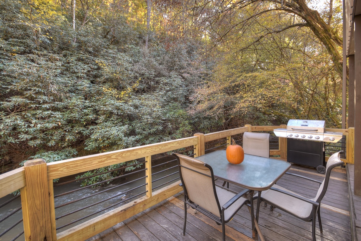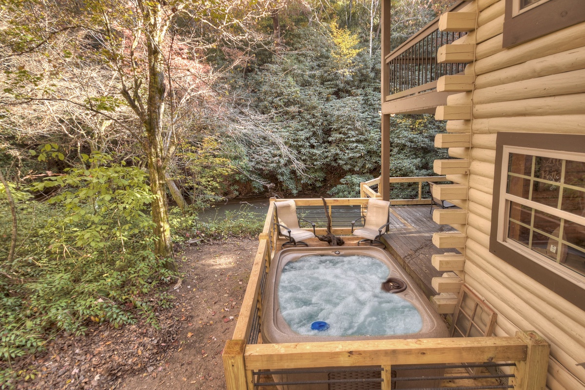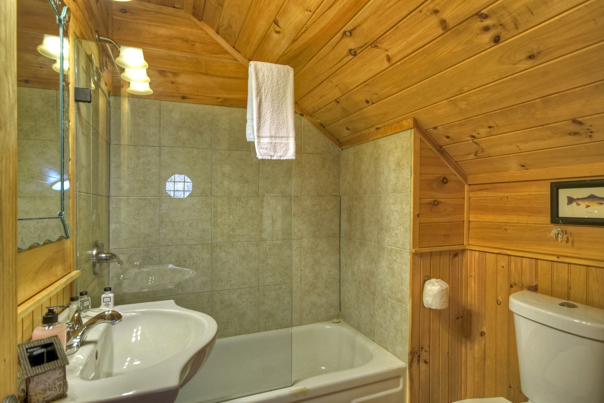 When it's time for bed, head upstairs where you will find sleeping arrangements for 4. There is a Queen Bed in the open loft area and a King bedroom which shares a tub/shower combo. Both sleeping areas have TV's to help wind down an adventurous day. The coolest and one of the most unique features of this property is that both of these rooms share a nice sized balcony overlooking the stream from the second level. Definitely a spot you will spend some time!