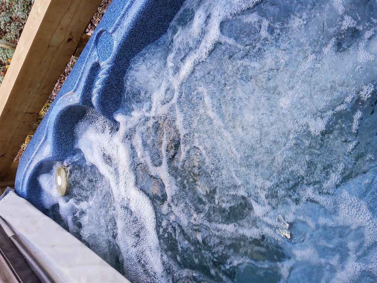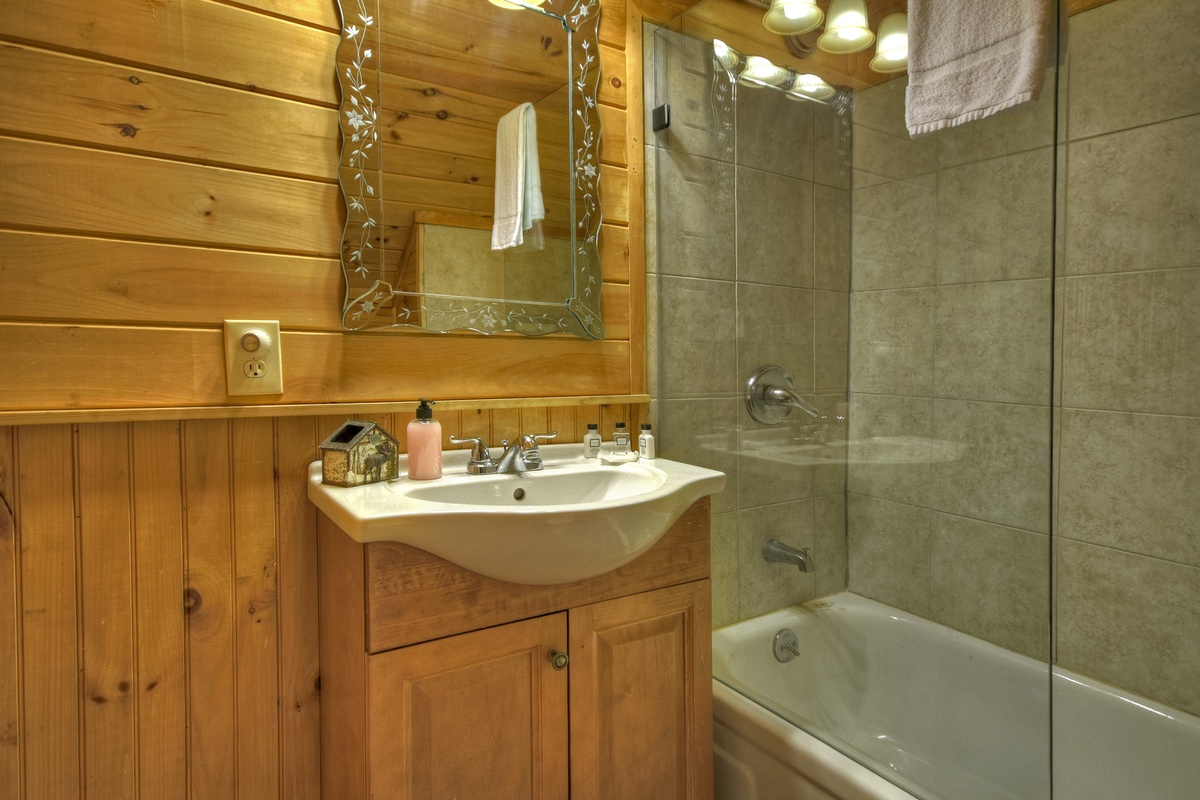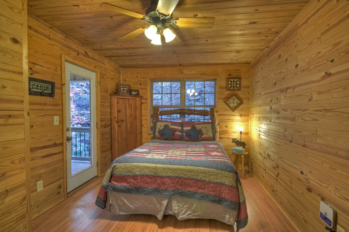 When it's time for bed, head upstairs where you will find sleeping arrangements for 4. There is a Queen Bed in the open loft area and a King bedroom which shares a tub/shower combo. Both sleeping areas have TV's to help wind down an adventurous day. The coolest and one of the most unique features of this property is that both of these rooms share a nice sized balcony overlooking the stream from the second level. Definitely a spot you will spend some time!