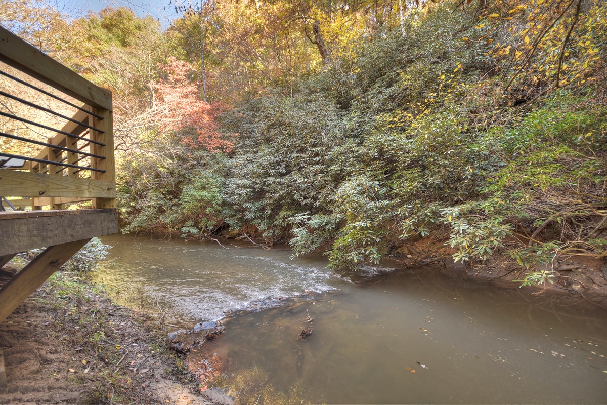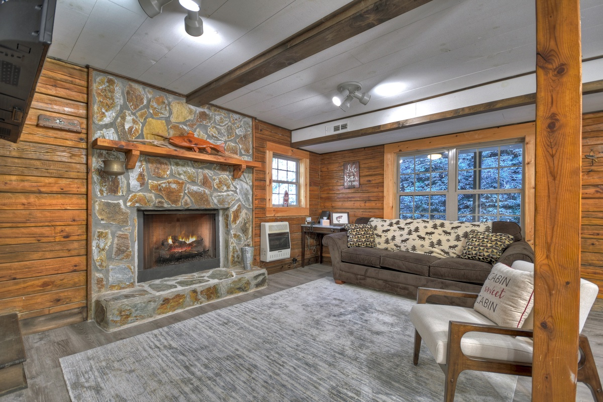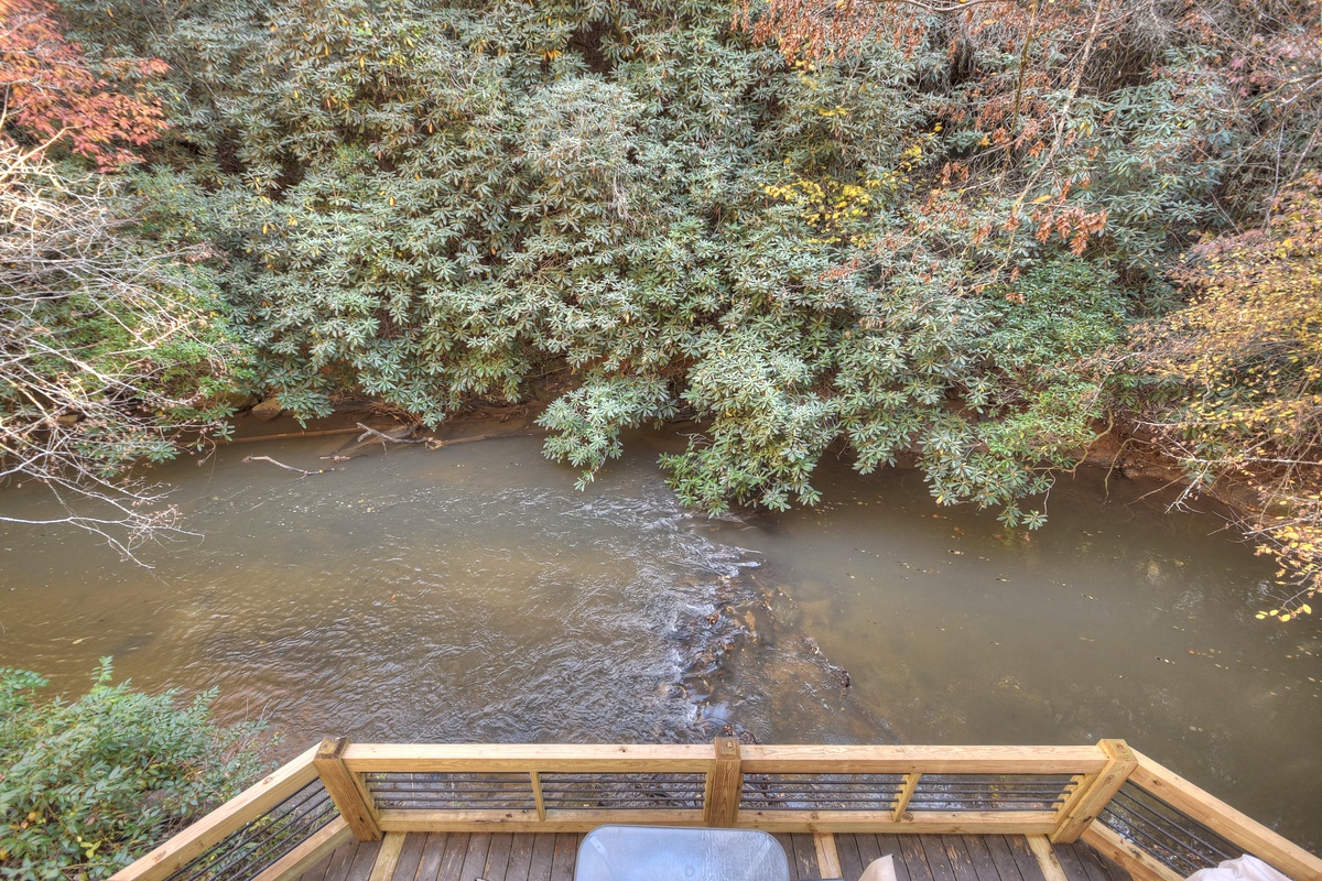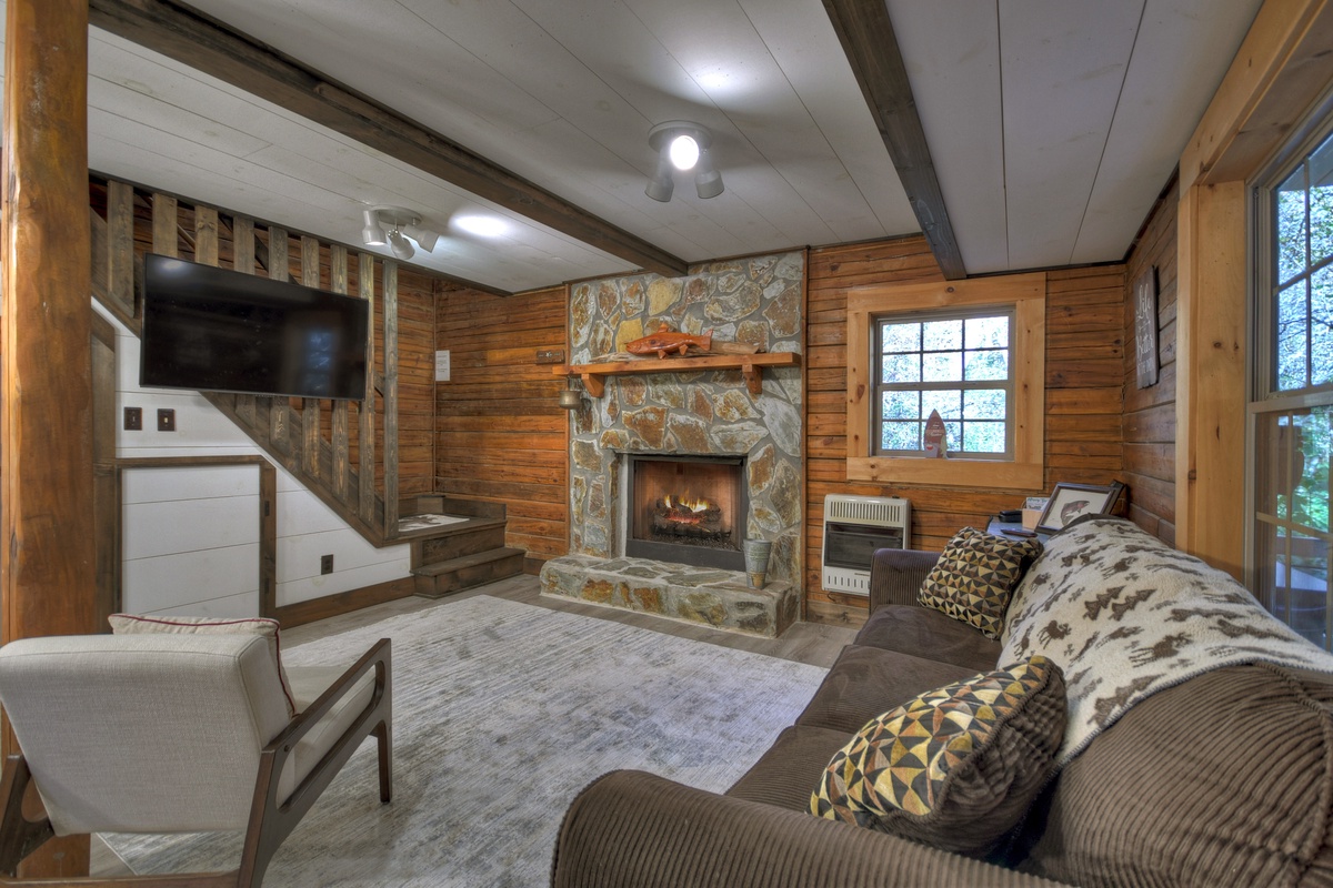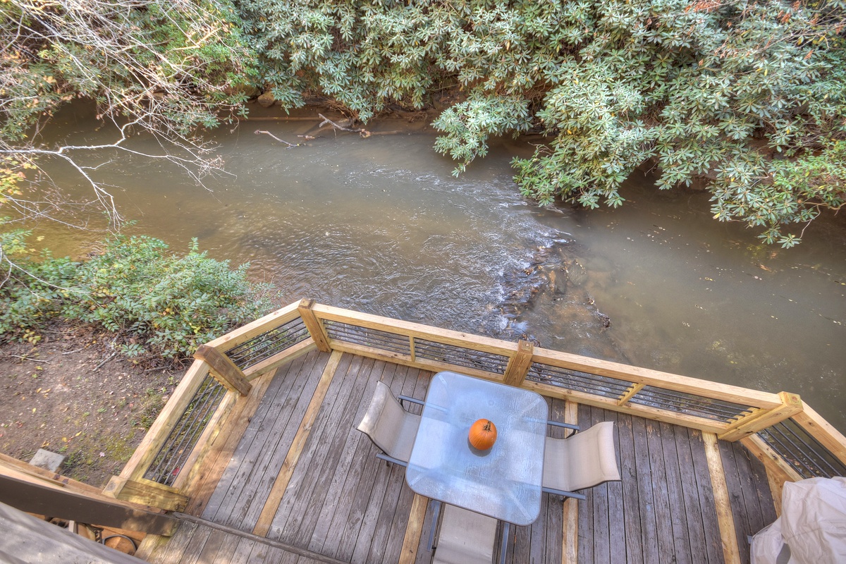 Located in Mineral Bluff and about 15 minutes from downtown Blue Ridge, this authentic cabin sits on the creekbank of Hothouse Creek, one of the many notorious trout streams in North Georgia. With a convenient dam break in the stream just out from the outdoor deck, the rustling water ambiance will sweep your worries away. The front porch/deck is newly updated and offers plenty of space to toss a line in the stream, or just to enjoy mother nature at her finest. Imagine sitting on the deck and listening to the sounds of the creek within view. Once you walk in the door, you will immediately be submersed into the North Georgia Mountains way of livin'. With an open entry-level, you will enjoy the company of those with you while cooking in the fully equipped kitchen or relaxing in the living room watching TV by the gas log fireplace. There is a bathroom with a walk-in shower on the entry-level. This is also where you will find the convenience of the washer and dryer tucked neatly into a closet in the bathroom.