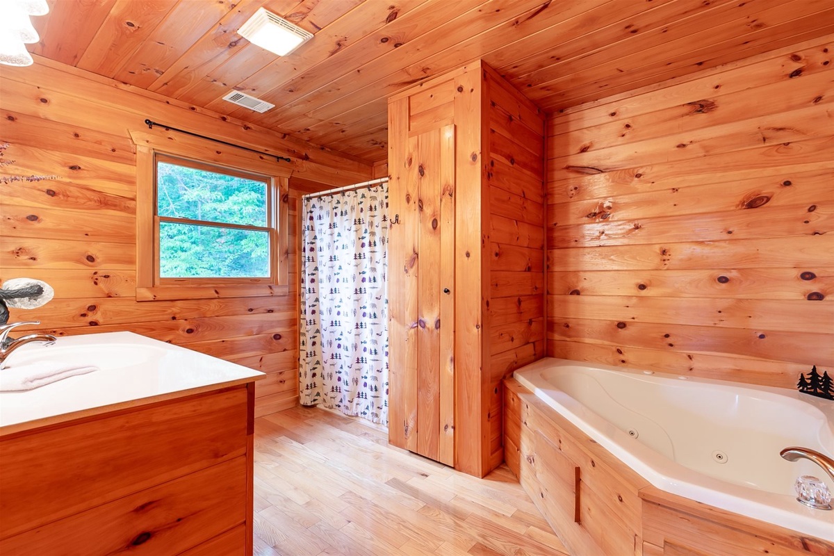 If you need to hit the hay but don’t want to walk very far from the couch, you’ll find a queen bedroom on the main level complete with a flat screen TV and easy bathroom access. Head upstairs to find the master suite with a huge king-sized bed, a flat screen TV and even private deck access so you can rise with the sun and enjoy your coffee with a gorgeous view. Throw in an attached private bathroom and you might not want to leave the upper level!