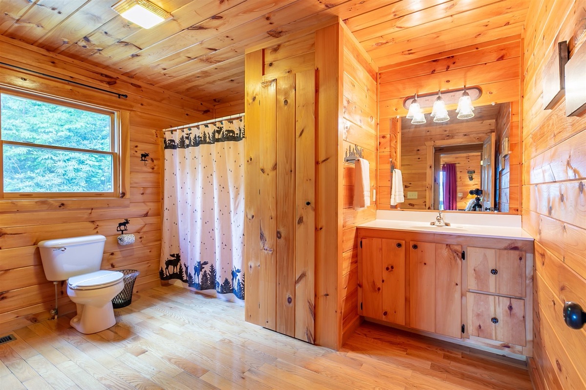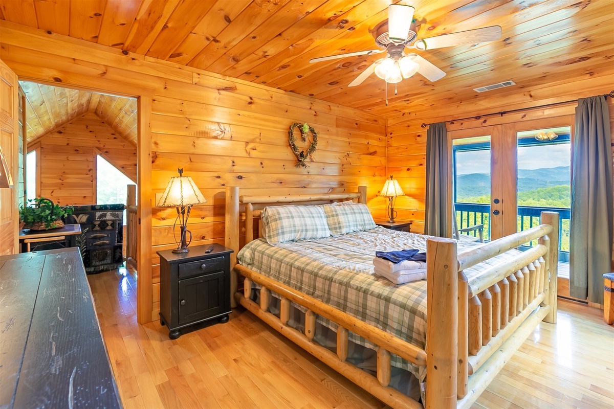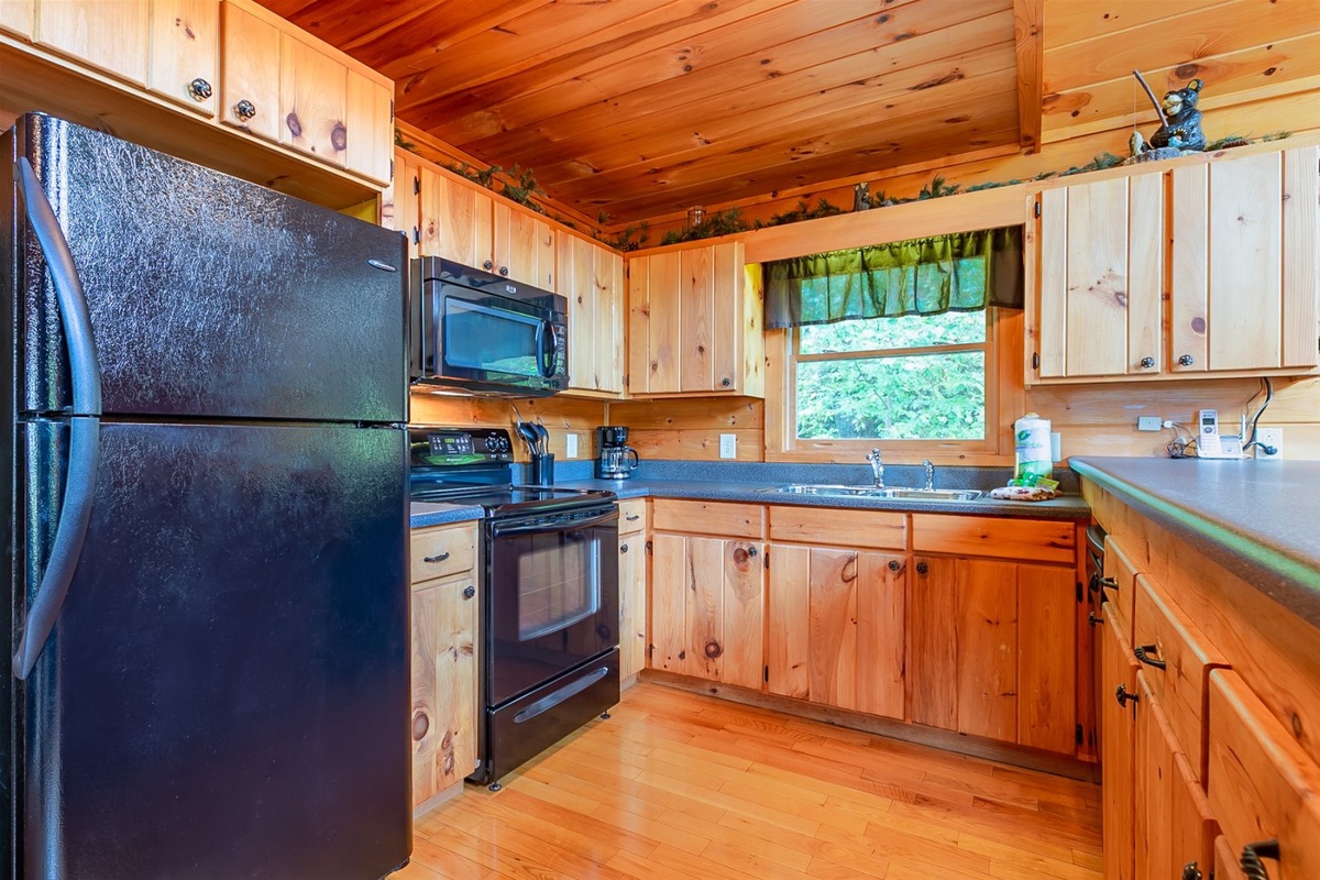 You’ll find all the comforts of home at Hawk’s Hideaway, starting with the main level that comes equipped with a relaxing dining area, cozy fireplace, flat screen TV, large picture windows that let in natural light, and a fully-equipped kitchen with pots, pans, utensils, and baking sheets. Deck access is found just a few steps from the comfy couch in the living area, so you can enjoy that awesome long-range view whenever your heart desires!