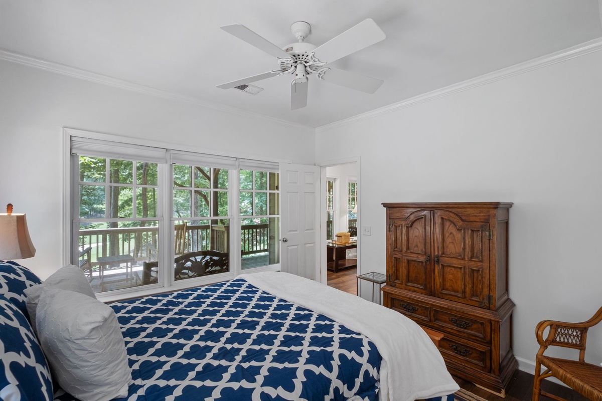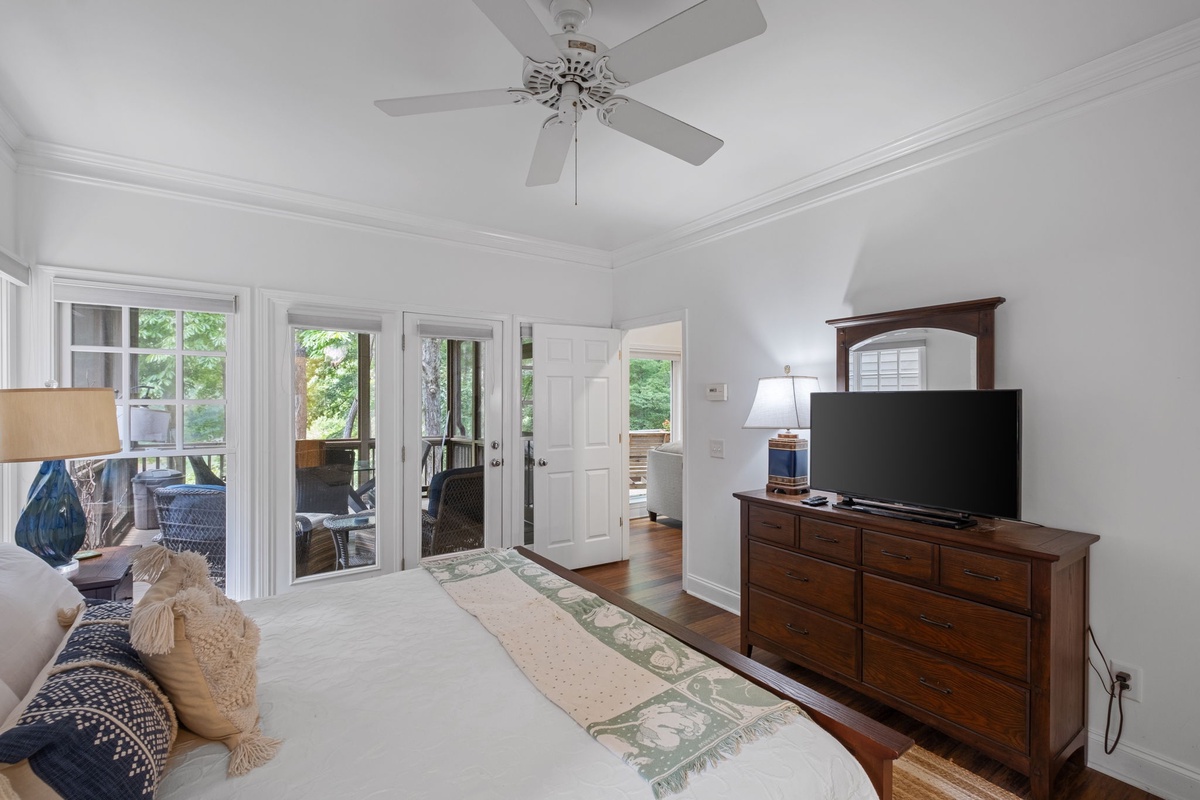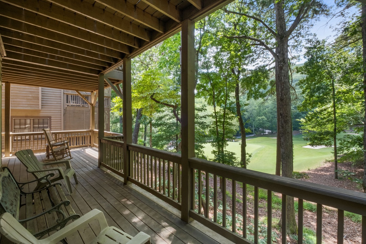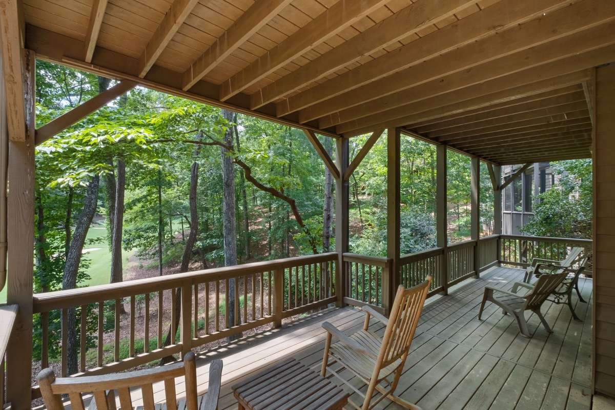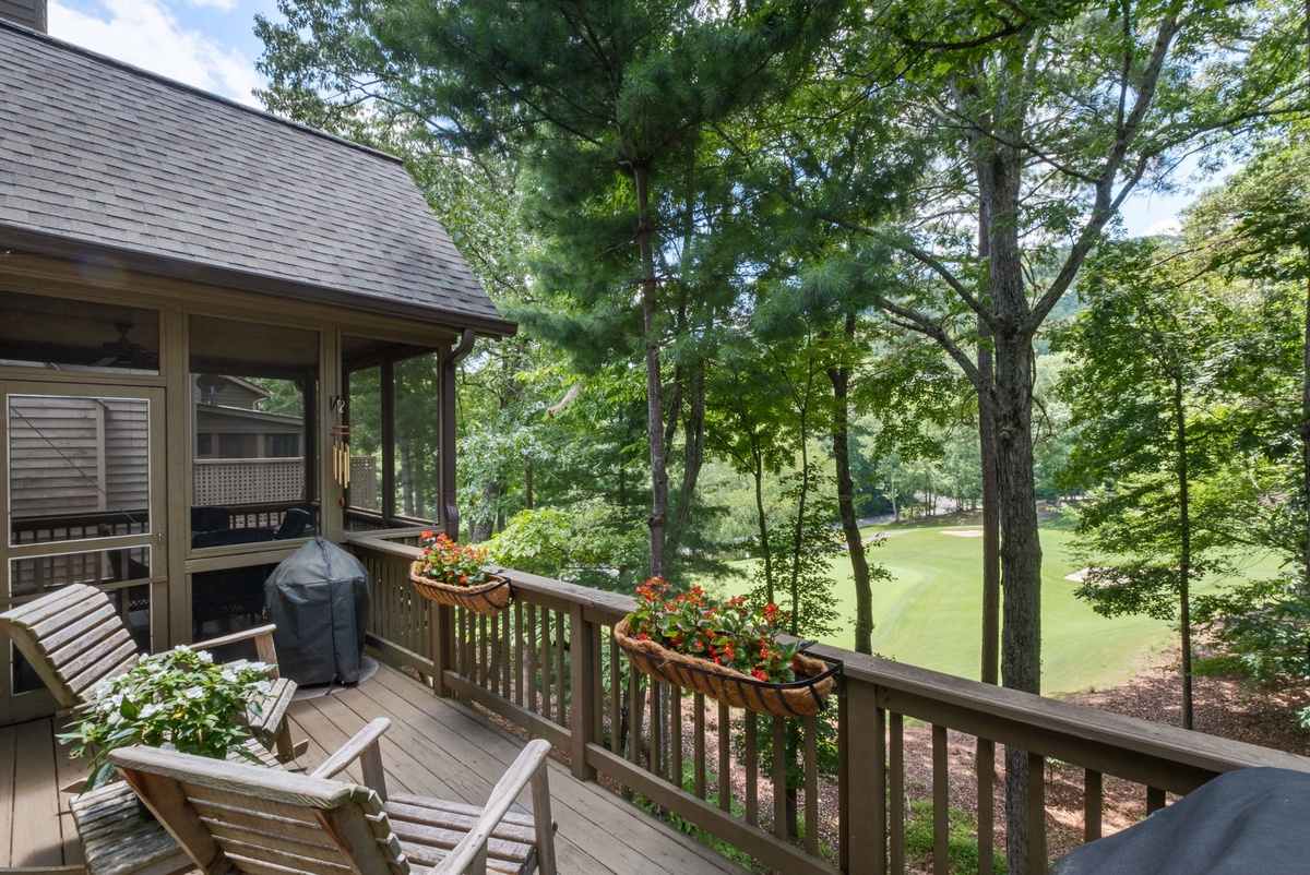 Enter through a charming rocking chair front porch. Inside, a spacious kitchen with granite countertops and a half bath welcomes you. The open-plan living area flows from the kitchen to the dining room and living room, offering views of the Championship golf course and surrounding woods. The rustic-glam dining area seats eight, while the living room features a stacked stone wood burning fireplace and upscale seating. Entry level primary bedroom featuring an ensuite bathroom with a walk-in shower with bench and dual shower heads. The bedroom has deck access to the screened in deck. The living room opens to a large deck perfect for grilling and a screened porch with an additional dining table, both offering stunning views.