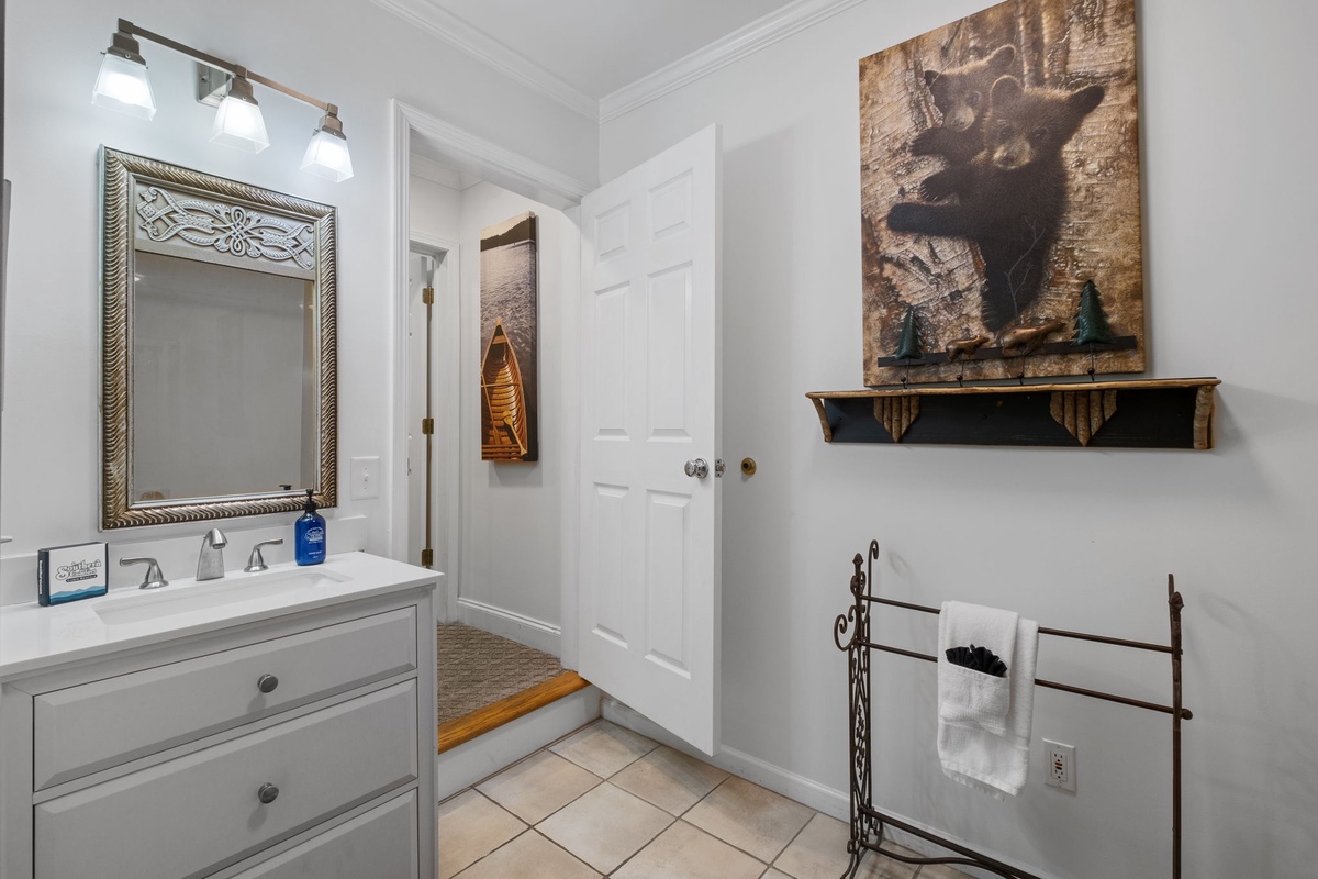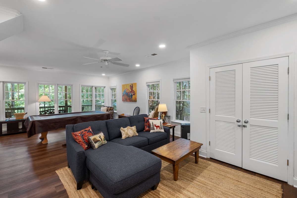 The primary bedroom on the main level has an ensuite bathroom. Downstairs, a TV viewing nook and pool table provide entertainment in the lower living room, which also opens to another large deck with seating for enjoying the views. Upstairs you will find 2 additional bedrooms. The dual twin bedroom offers views to the Championship Golf Course through the high windows of the living room, while the second bedroom offers a full-size bed. Both bedrooms include their own half bath, while sharing a shower/tub combo. Both bedrooms also have closets