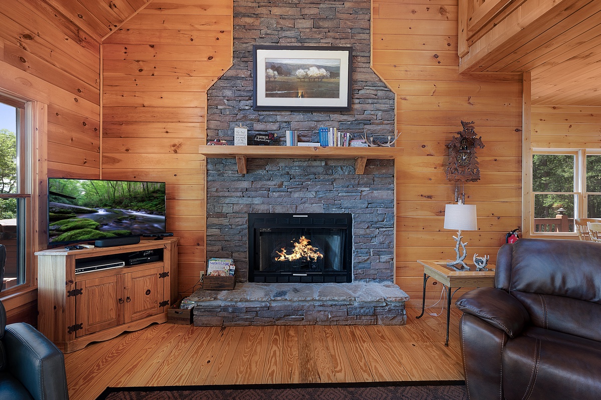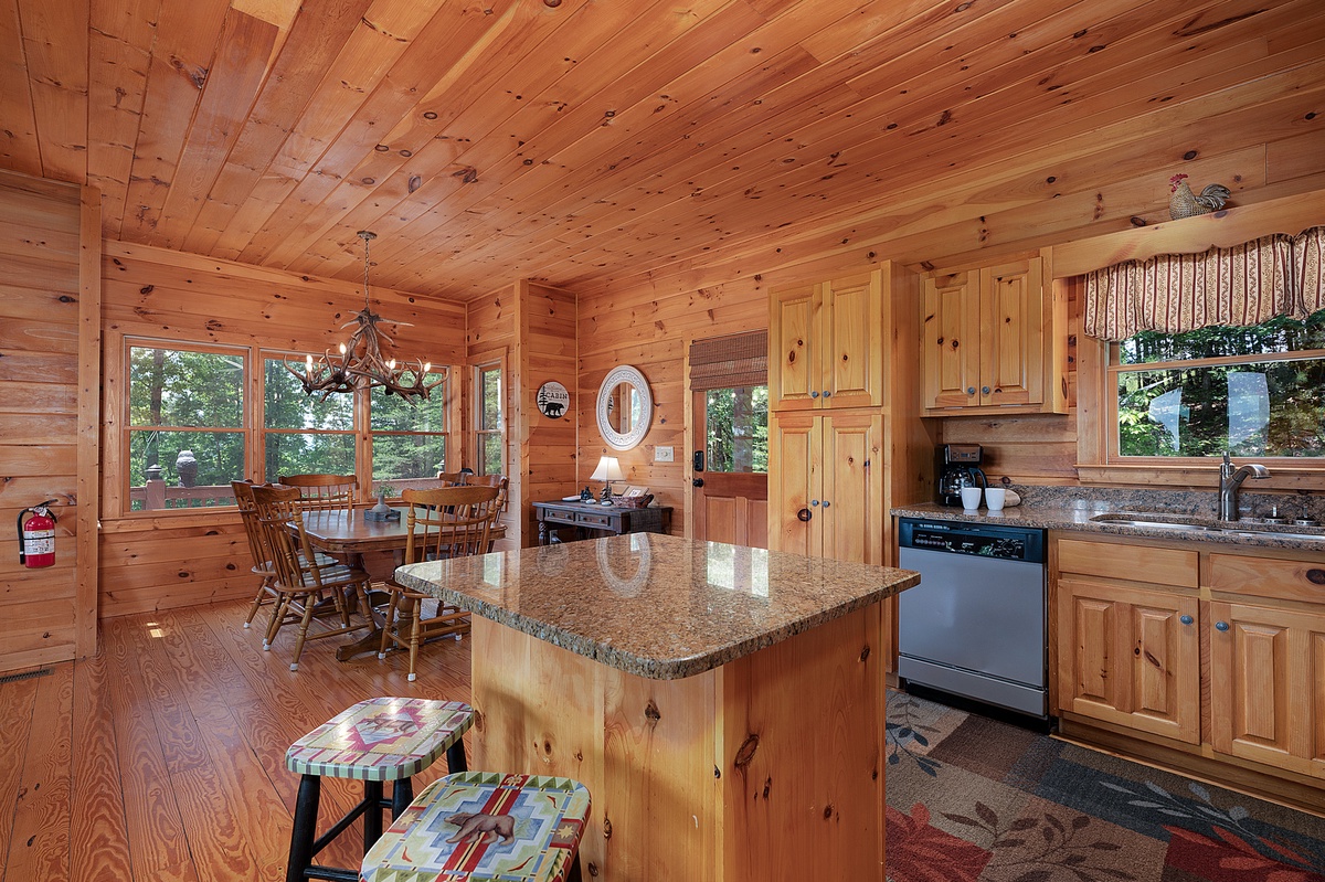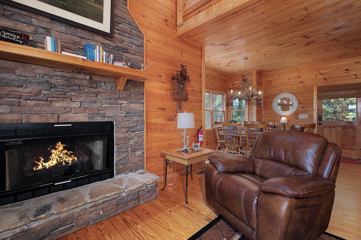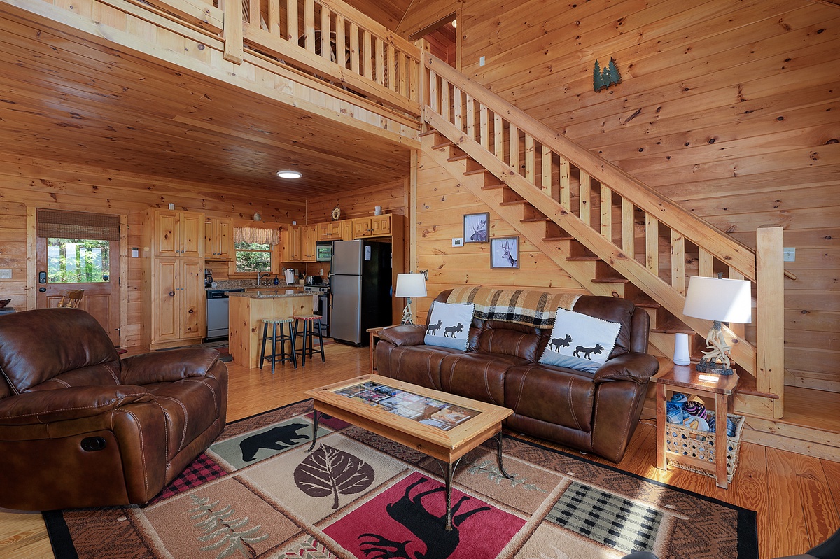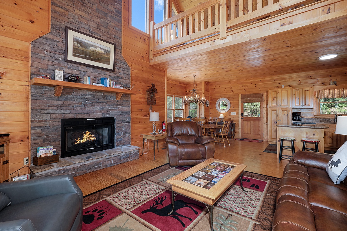 Step inside the main level and you’re welcomed by soaring ceilings, an open floor plan, and a warm wood interior that instantly puts you at ease. The living room features a stone gas fireplace, plush leather seating, and a flat-panel TV—perfect for laid-back evenings or lazy mornings. The fully equipped kitchen boasts stainless steel appliances, a central island with bar seating, and a dining area with space for six, making homecooked meals and board game nights a breeze.