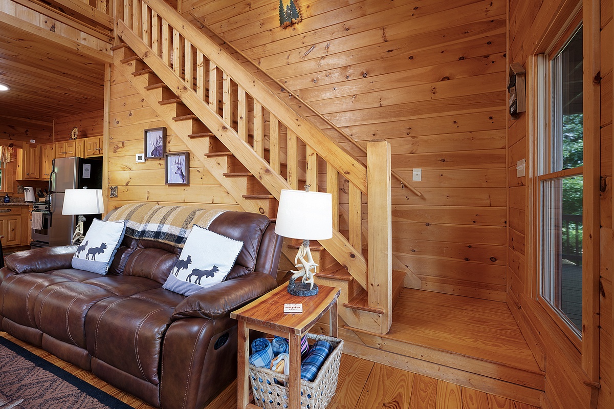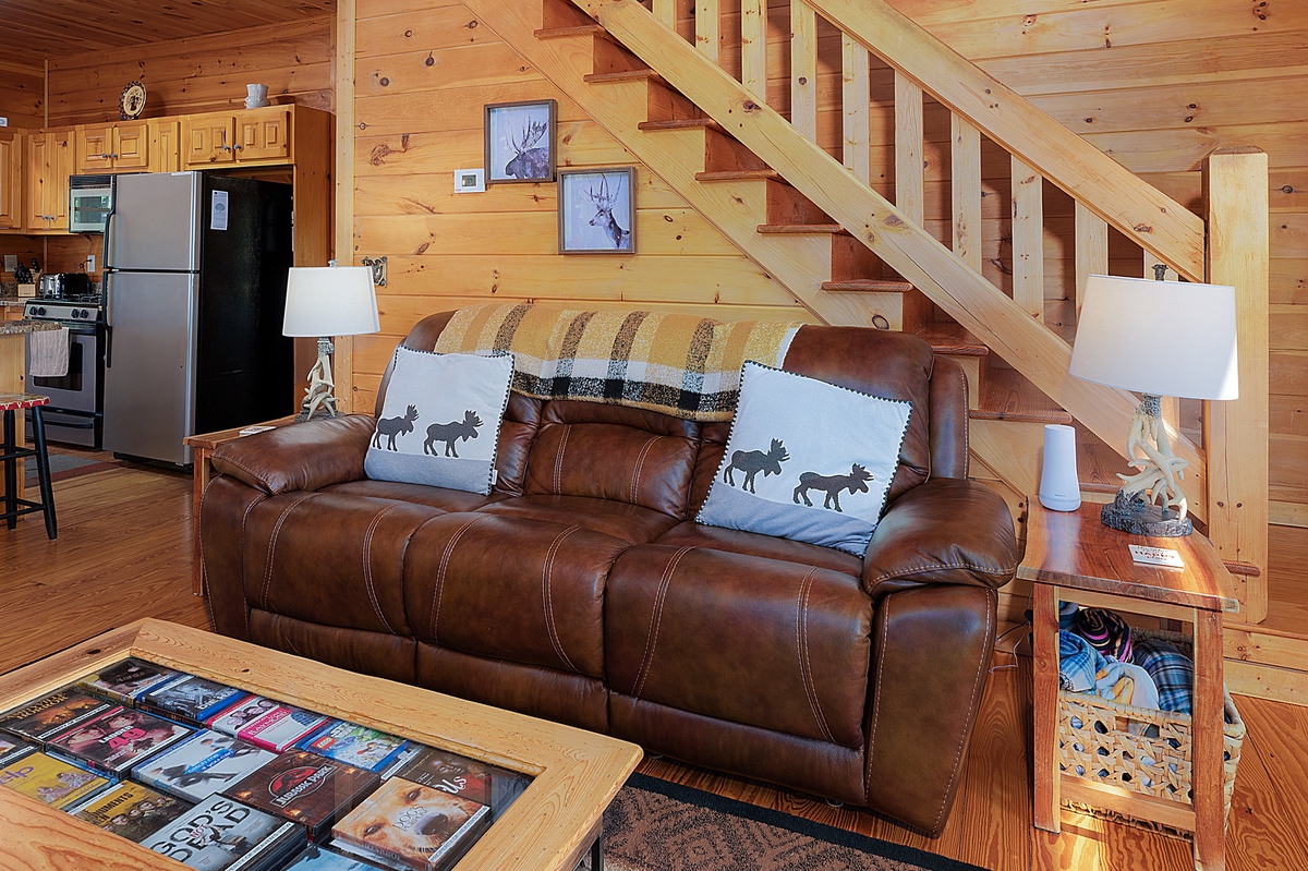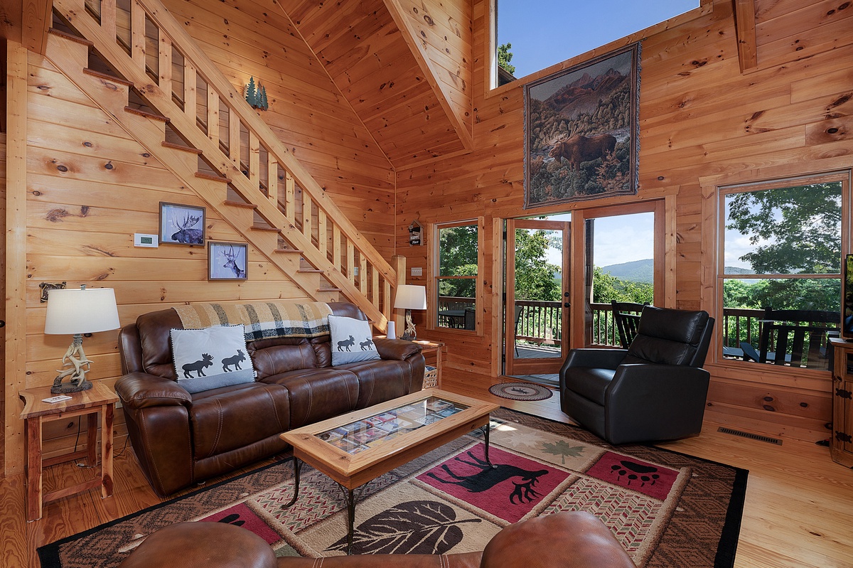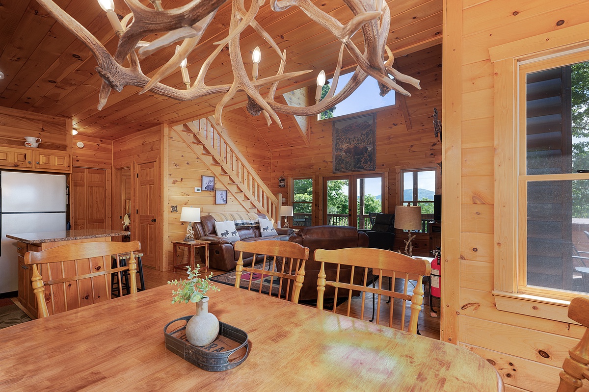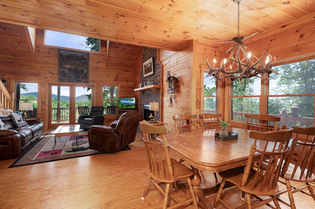 Step inside the main level and you’re welcomed by soaring ceilings, an open floor plan, and a warm wood interior that instantly puts you at ease. The living room features a stone gas fireplace, plush leather seating, and a flat-panel TV—perfect for laid-back evenings or lazy mornings. The fully equipped kitchen boasts stainless steel appliances, a central island with bar seating, and a dining area with space for six, making homecooked meals and board game nights a breeze.
