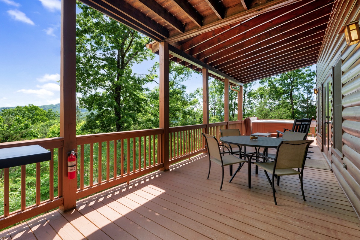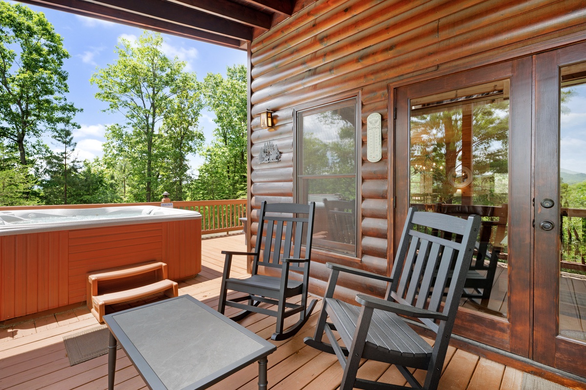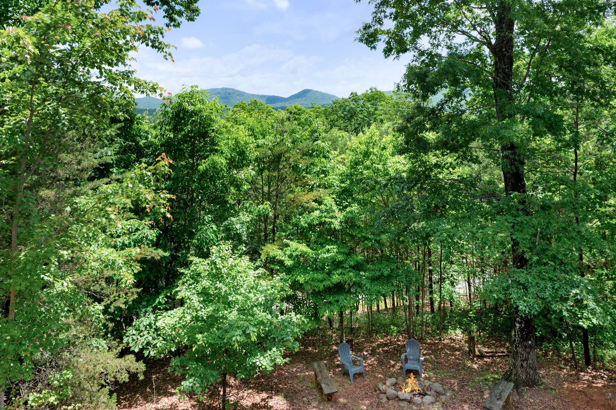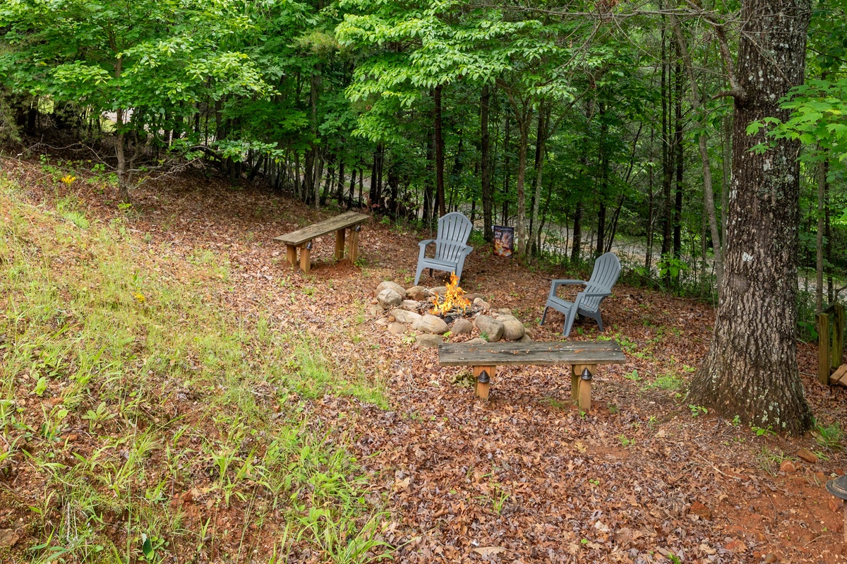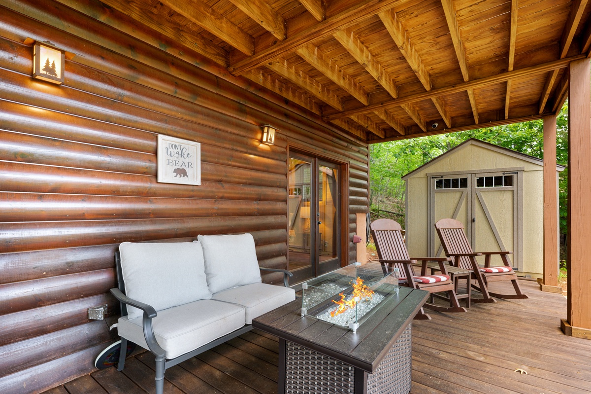Step outside and soak in the serenity. The main deck features a bubbling hot tub, propane grill, and an outdoor dining area, all under the cover of tall trees and wide-open skies. On the lower patio, enjoy quiet mornings or star-filled nights by the fire table, with rocking chairs and peaceful mountain vibes.