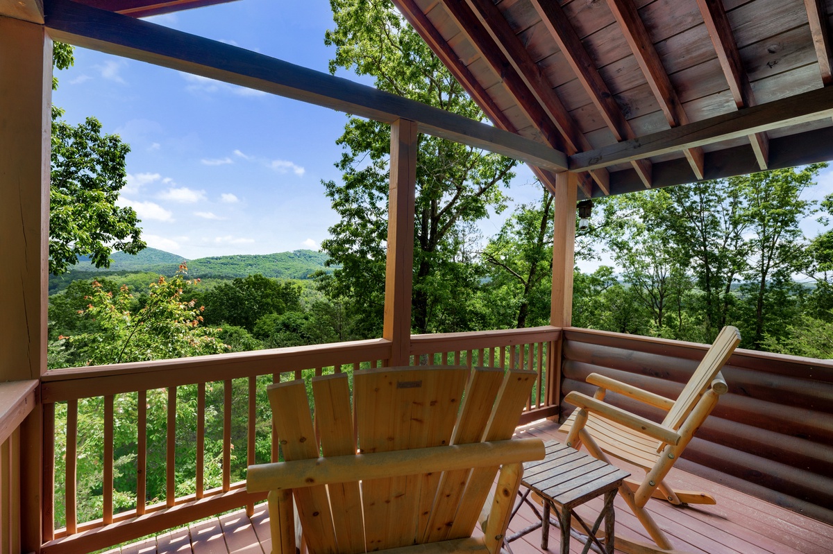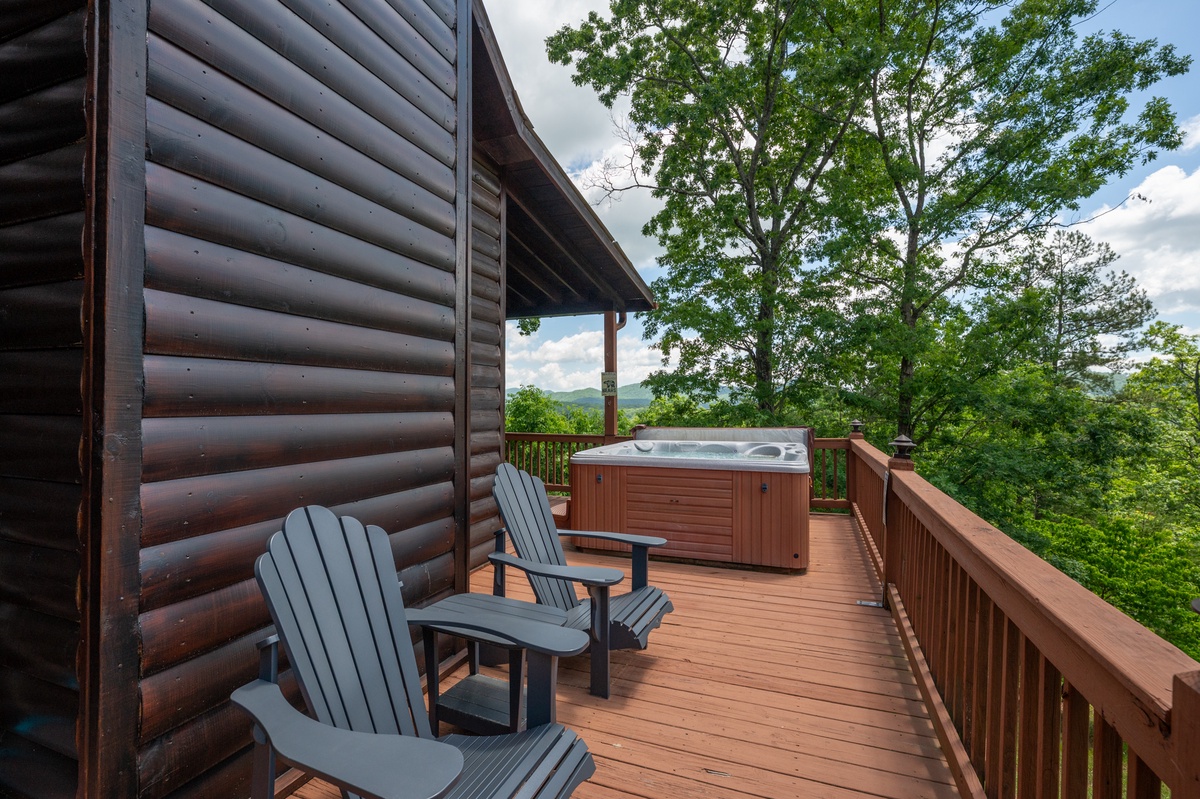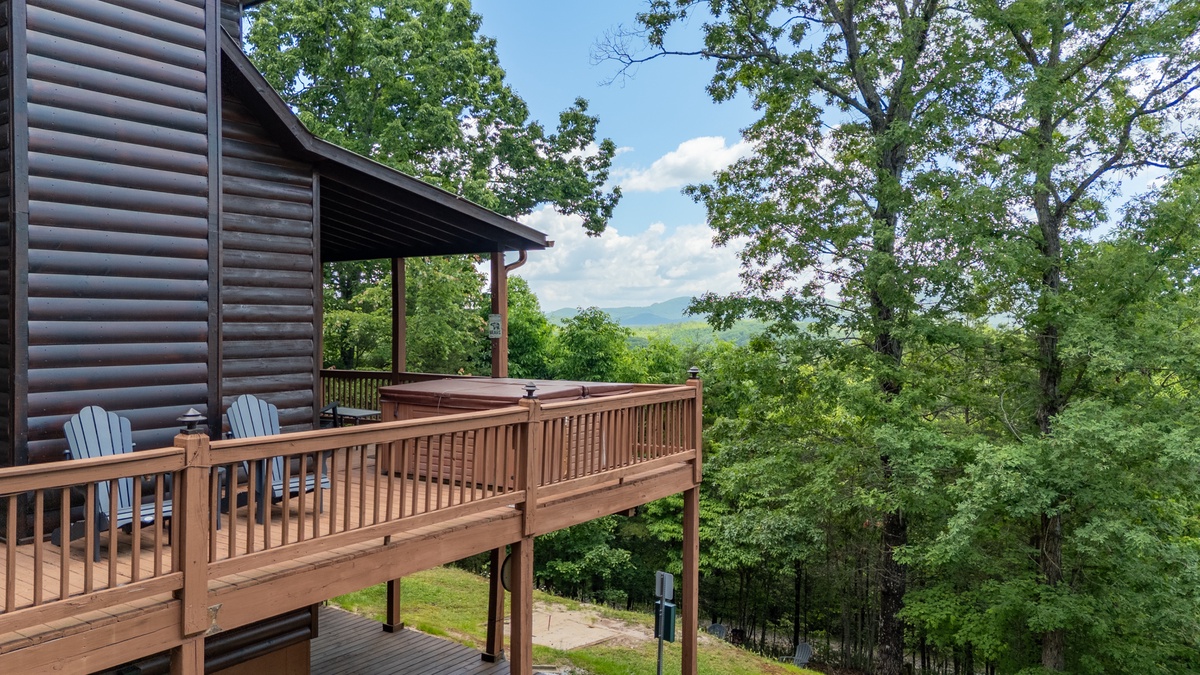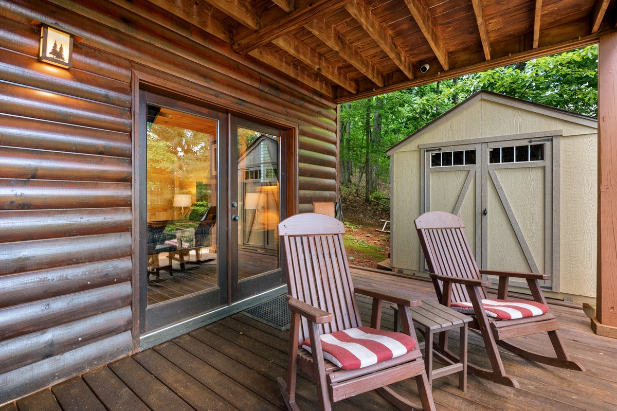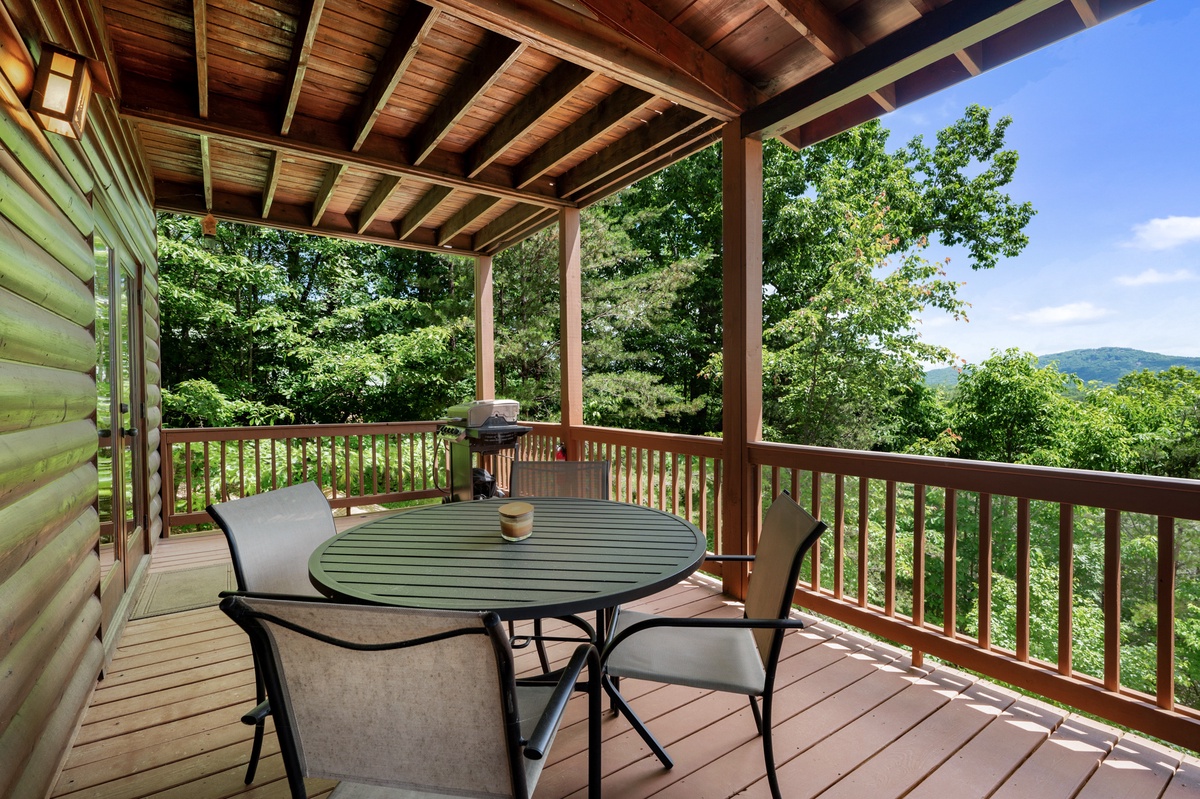 Step outside and soak in the serenity. The main deck features a bubbling hot tub, propane grill, and an outdoor dining area, all under the cover of tall trees and wide-open skies. On the lower patio, enjoy quiet mornings or star-filled nights by the fire table, with rocking chairs and peaceful mountain vibes.