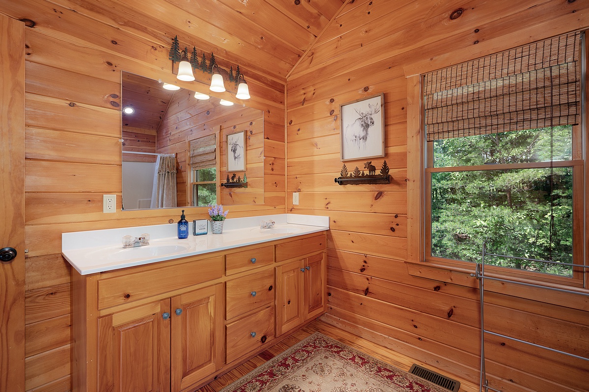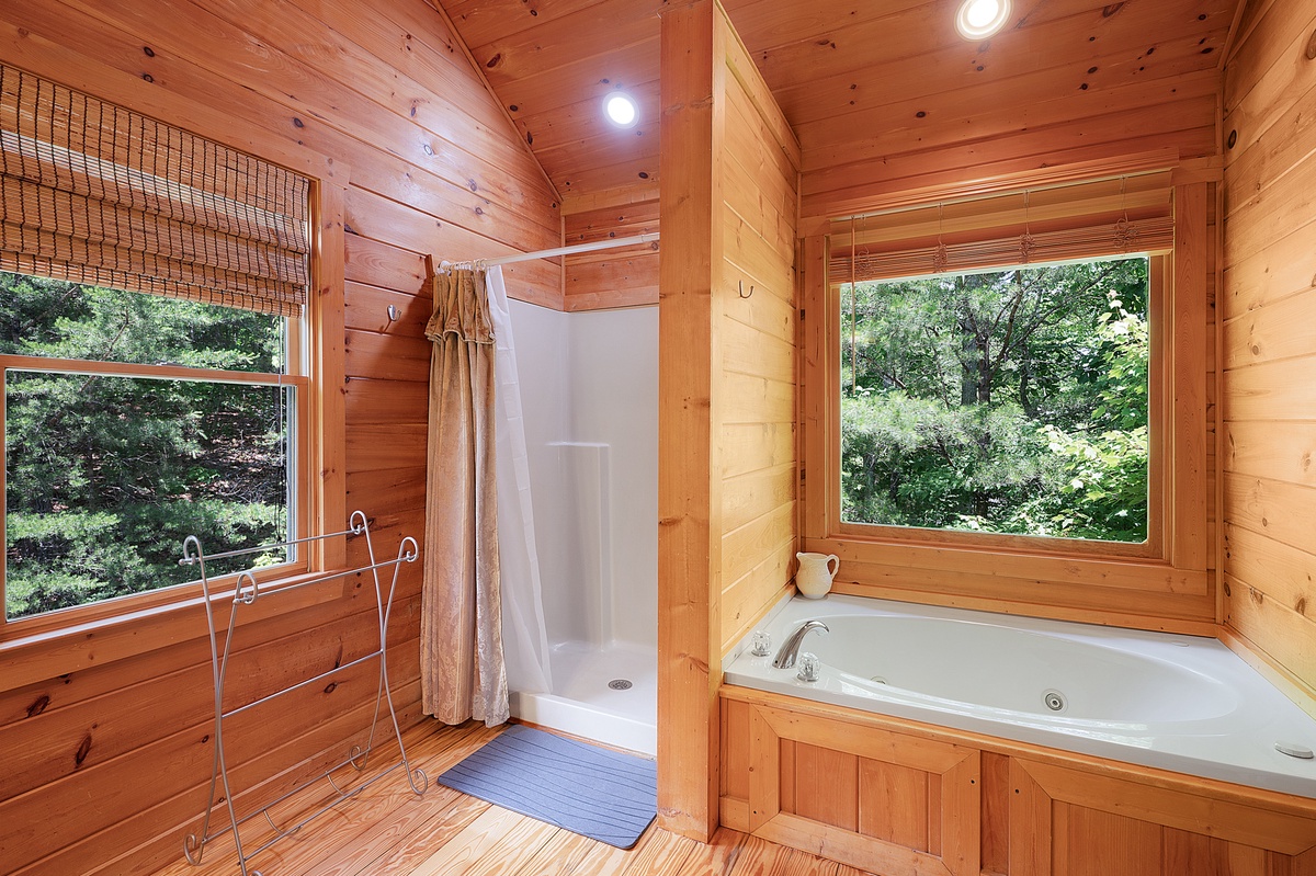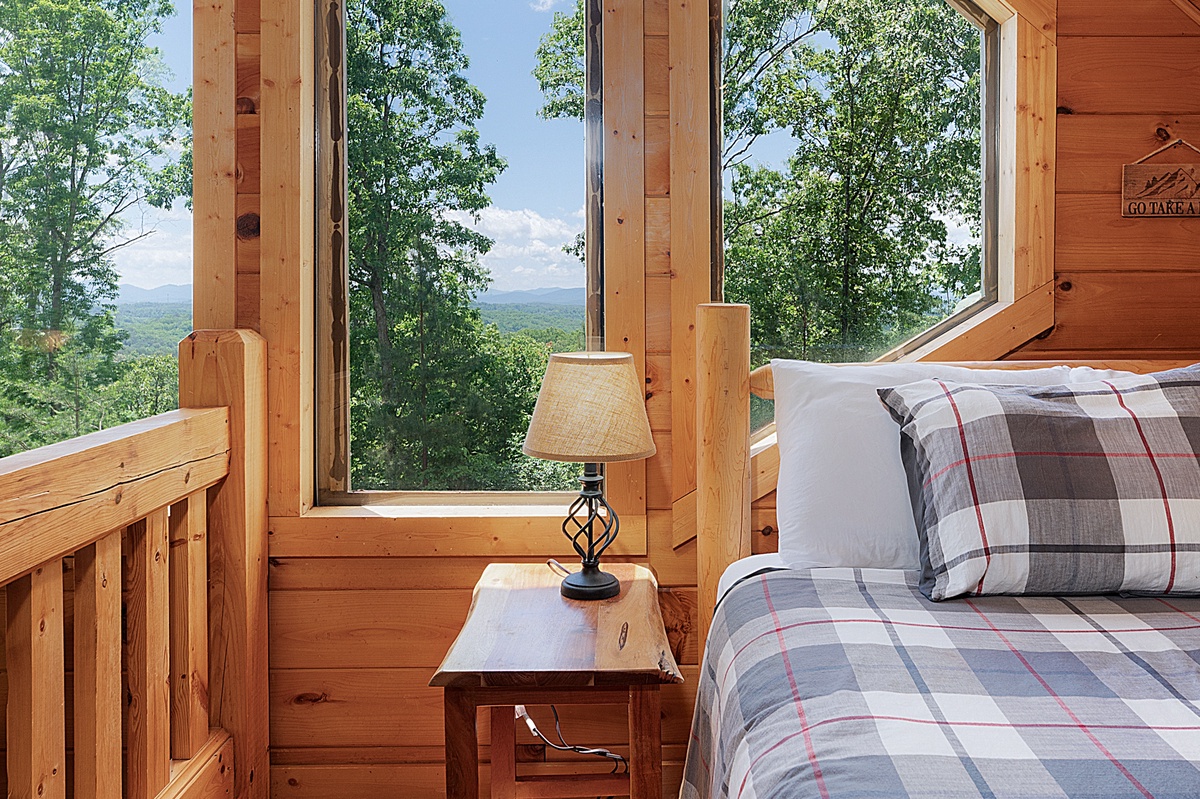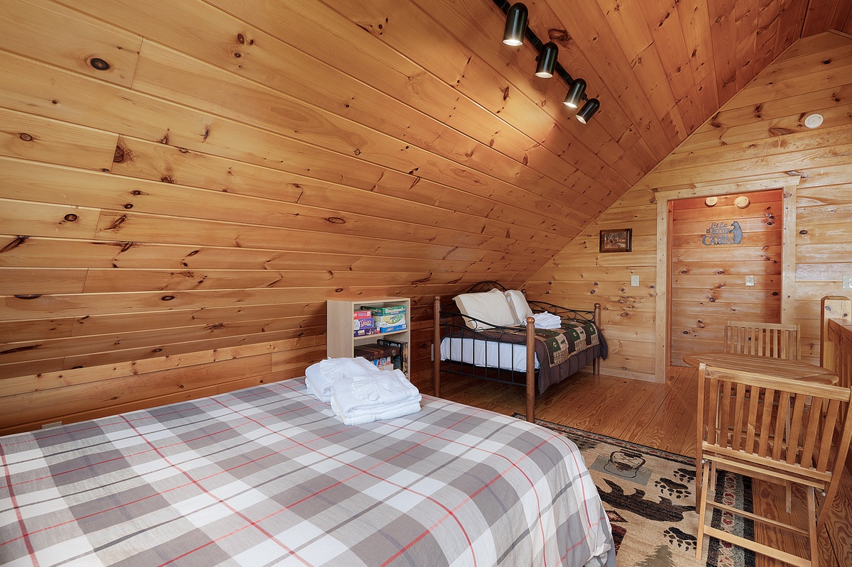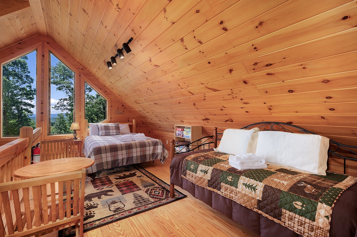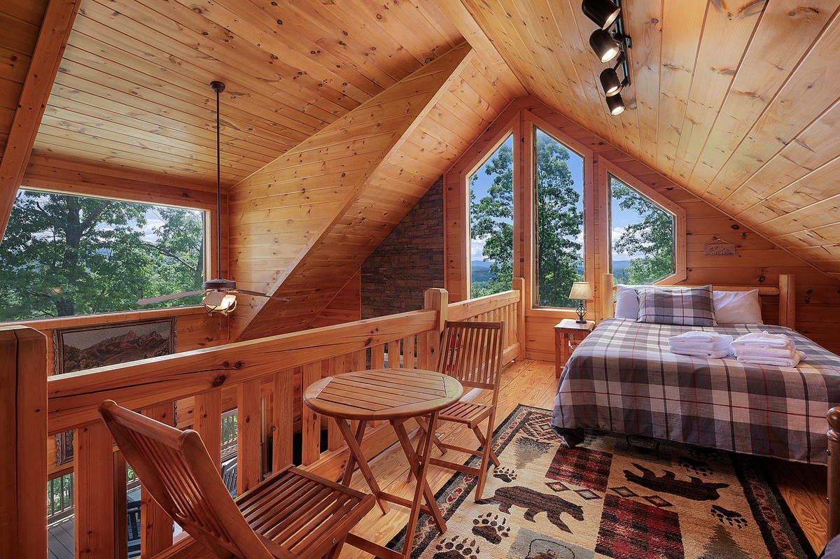 Upstairs, the open loft includes a queen bed, twin bed, and a small seating area overlooking the great room and the view beyond. You’ll also find a king suite on this level with its own private balcony, double vanity bathroom, a walk-in shower, and a separate jacuzzi tub—your personal spa retreat with forest views.