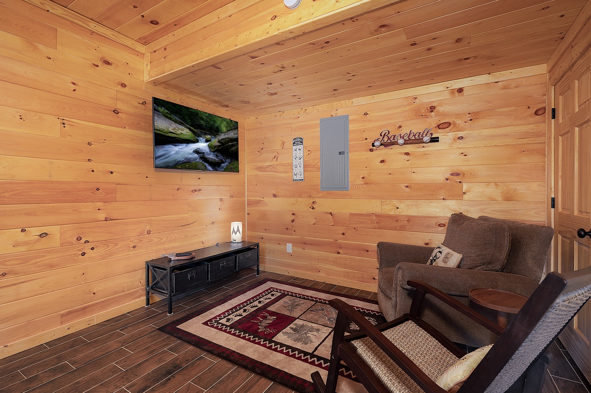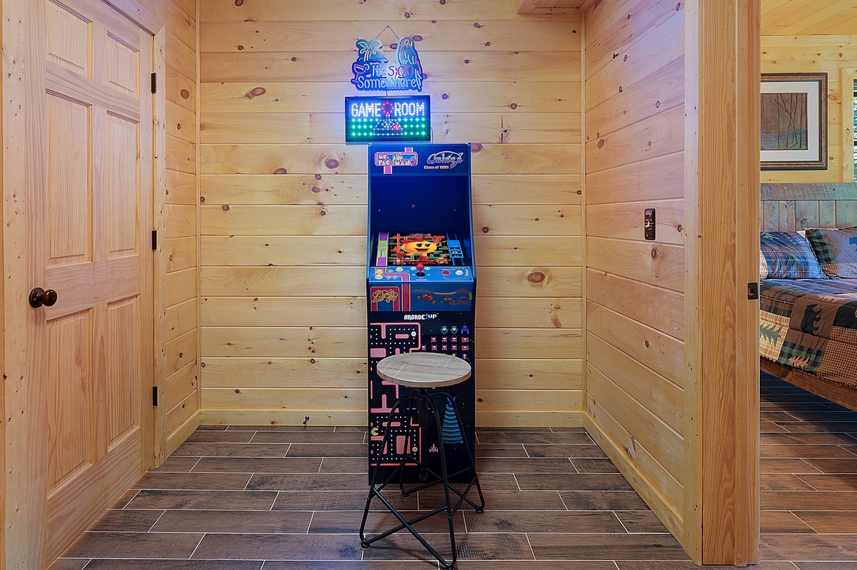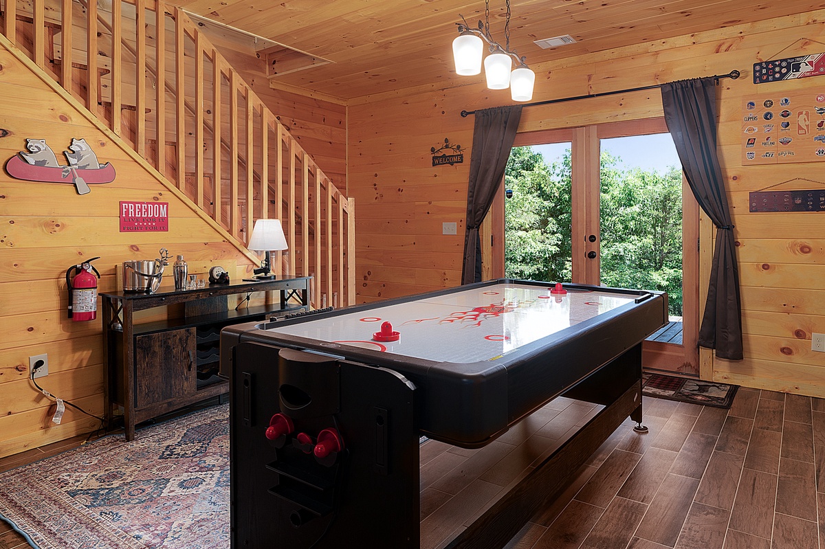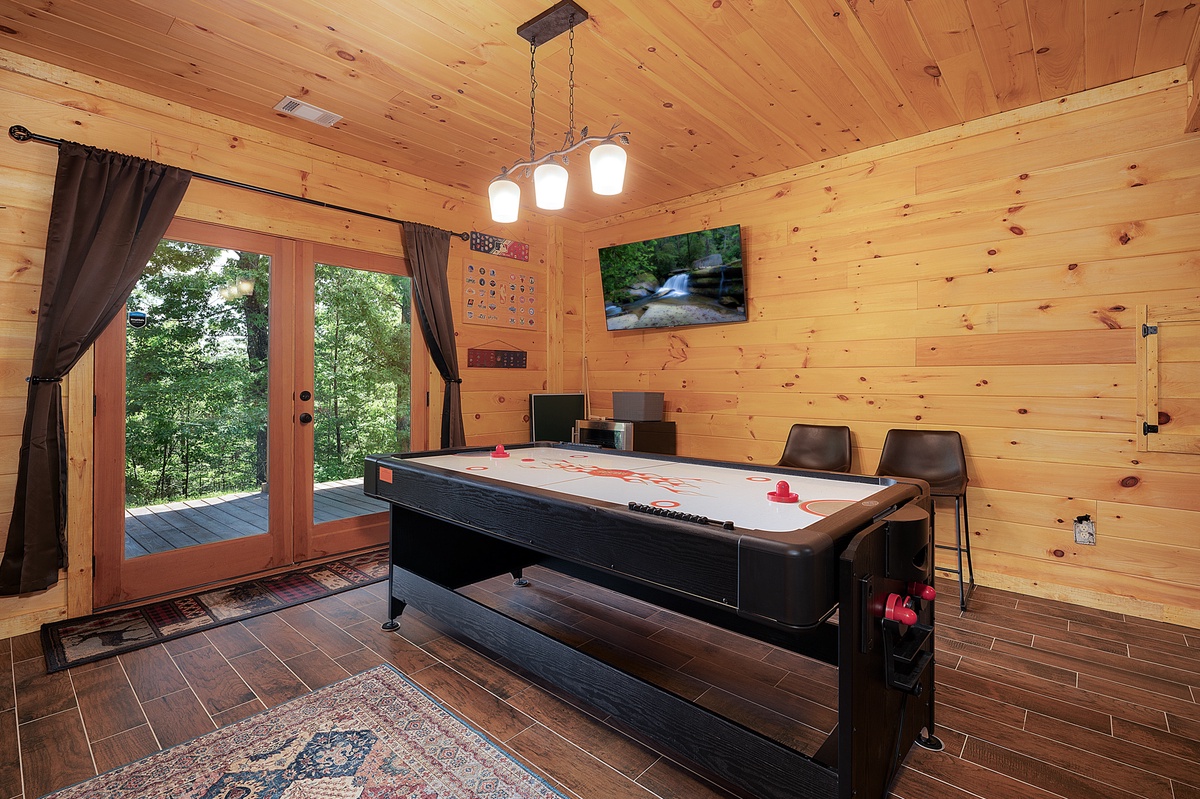 Downstairs is where the fun begins. The lower level is an entertainment haven with two 55” TVs, an air hockey table, a classic arcade game, and additional cozy seating. A queen bedroom with private deck access and a full bathroom (shower/tub combo) rounds out the lower level.