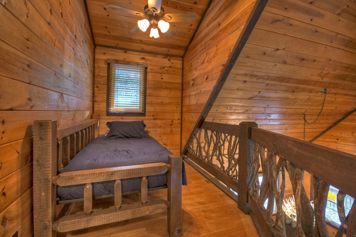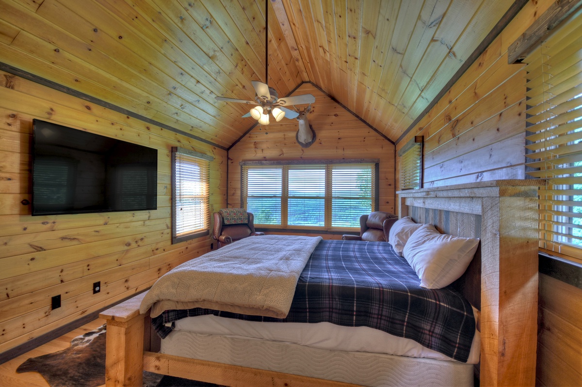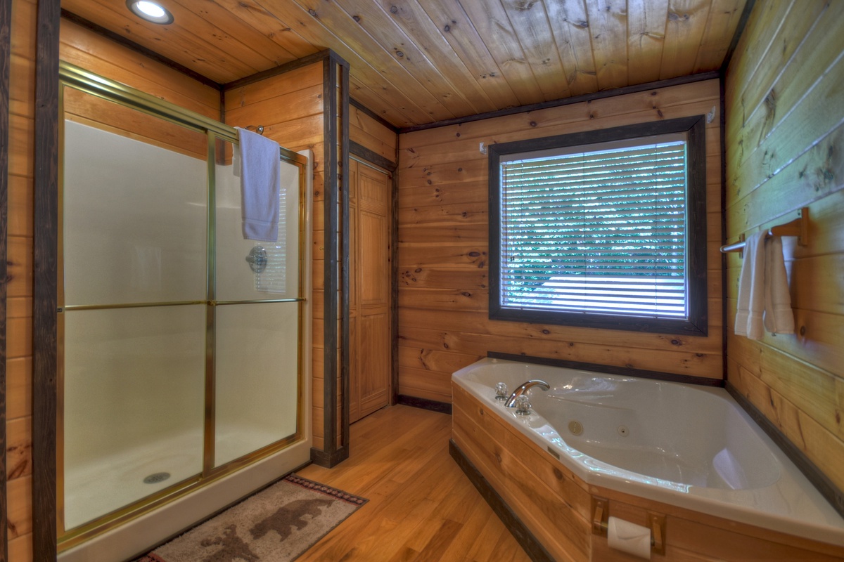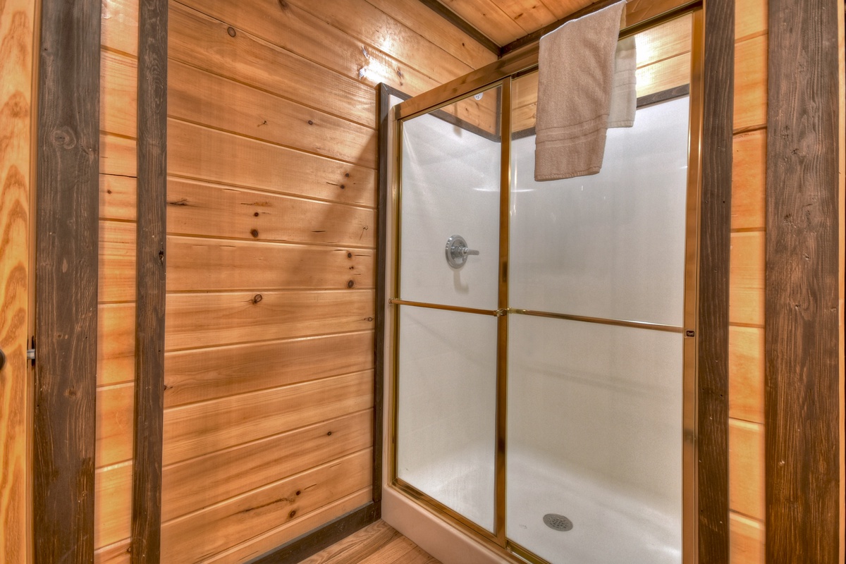 The upper-level of this cabin has a king master suite with a 65" TV and DirecTV. There is also an extra twin bed in the open loft area of the upper level. The shared bathroom on this level has a bathtub and a walk-in shower. The abundant windows make the perfect natural lighting and forest view.