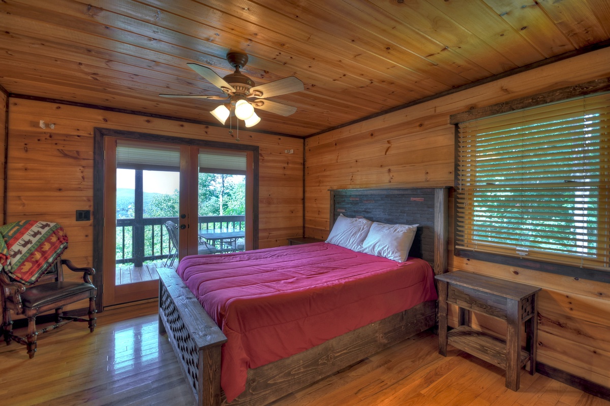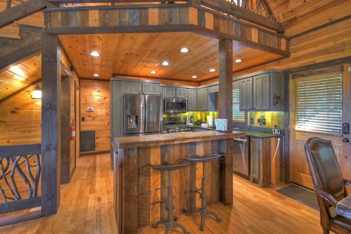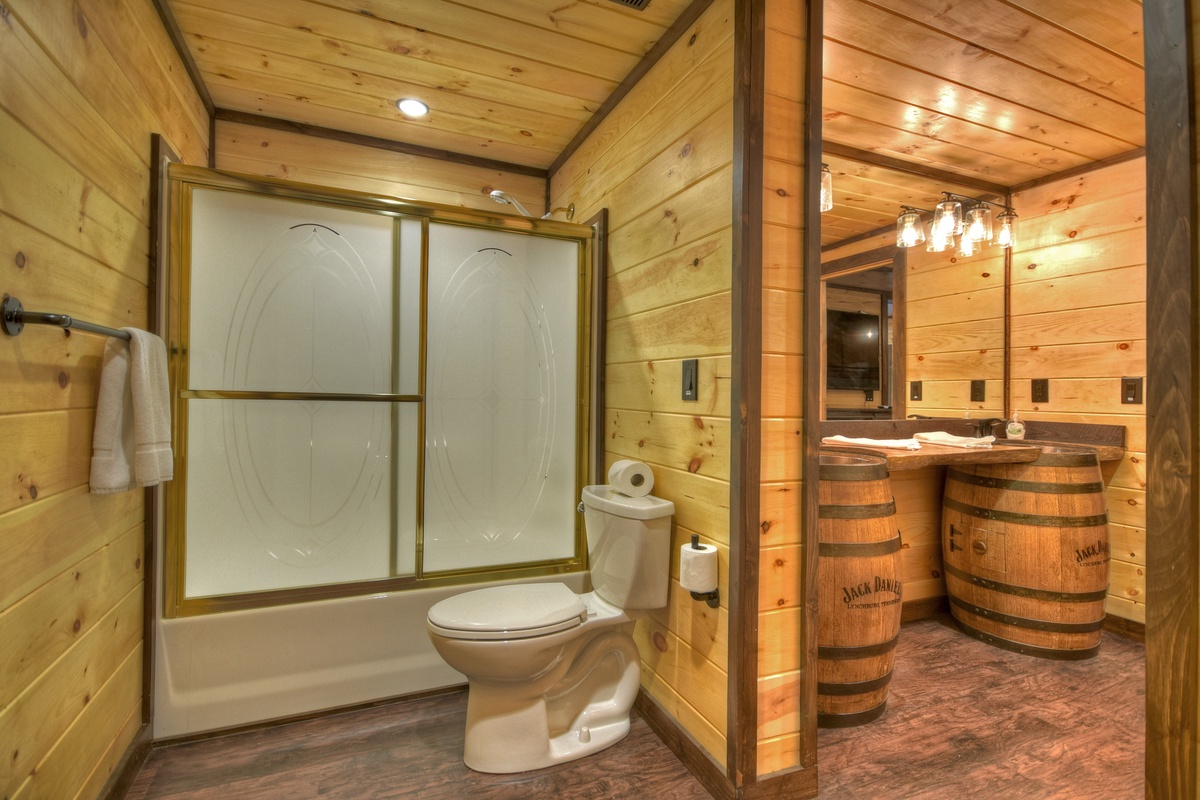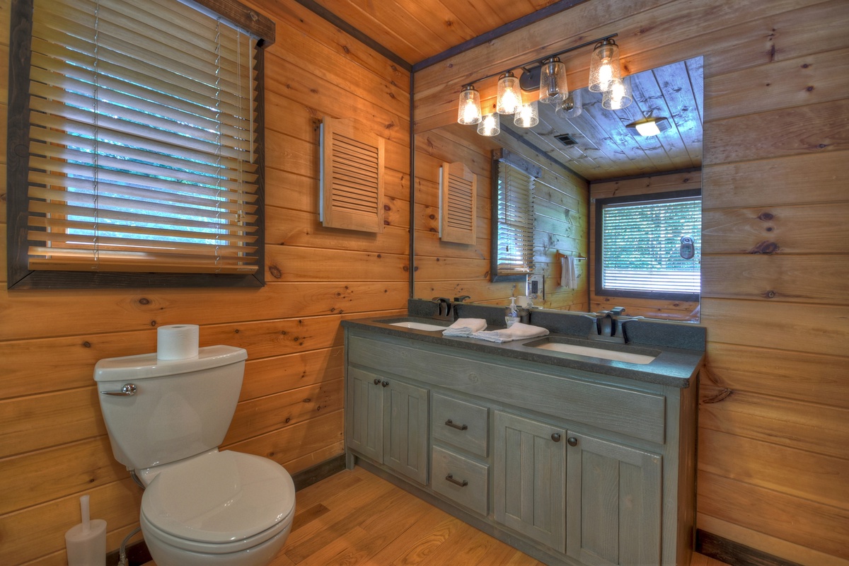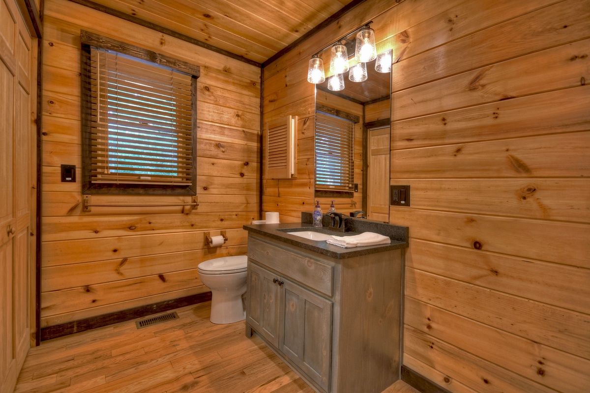 The upper-level of this cabin has a king master suite with a 65" TV and DirecTV. There is also an extra twin bed in the open loft area of the upper level. The shared bathroom on this level has a bathtub and a walk-in shower. The abundant windows make the perfect natural lighting and forest view.