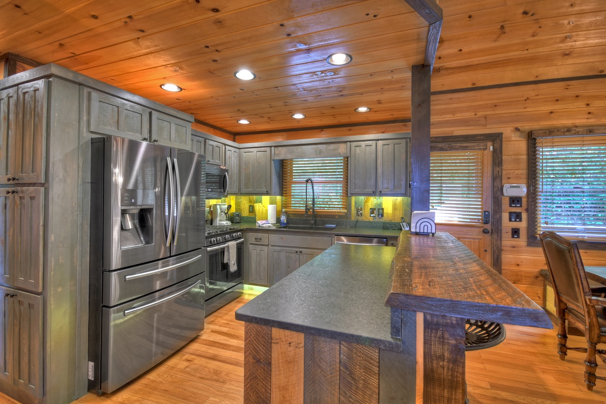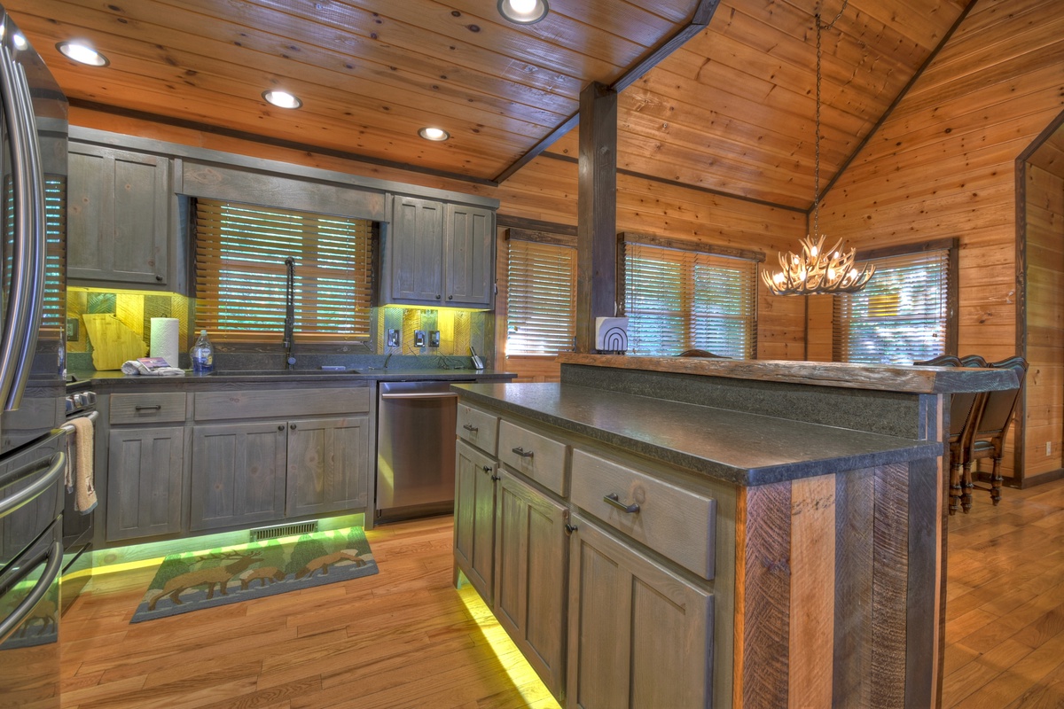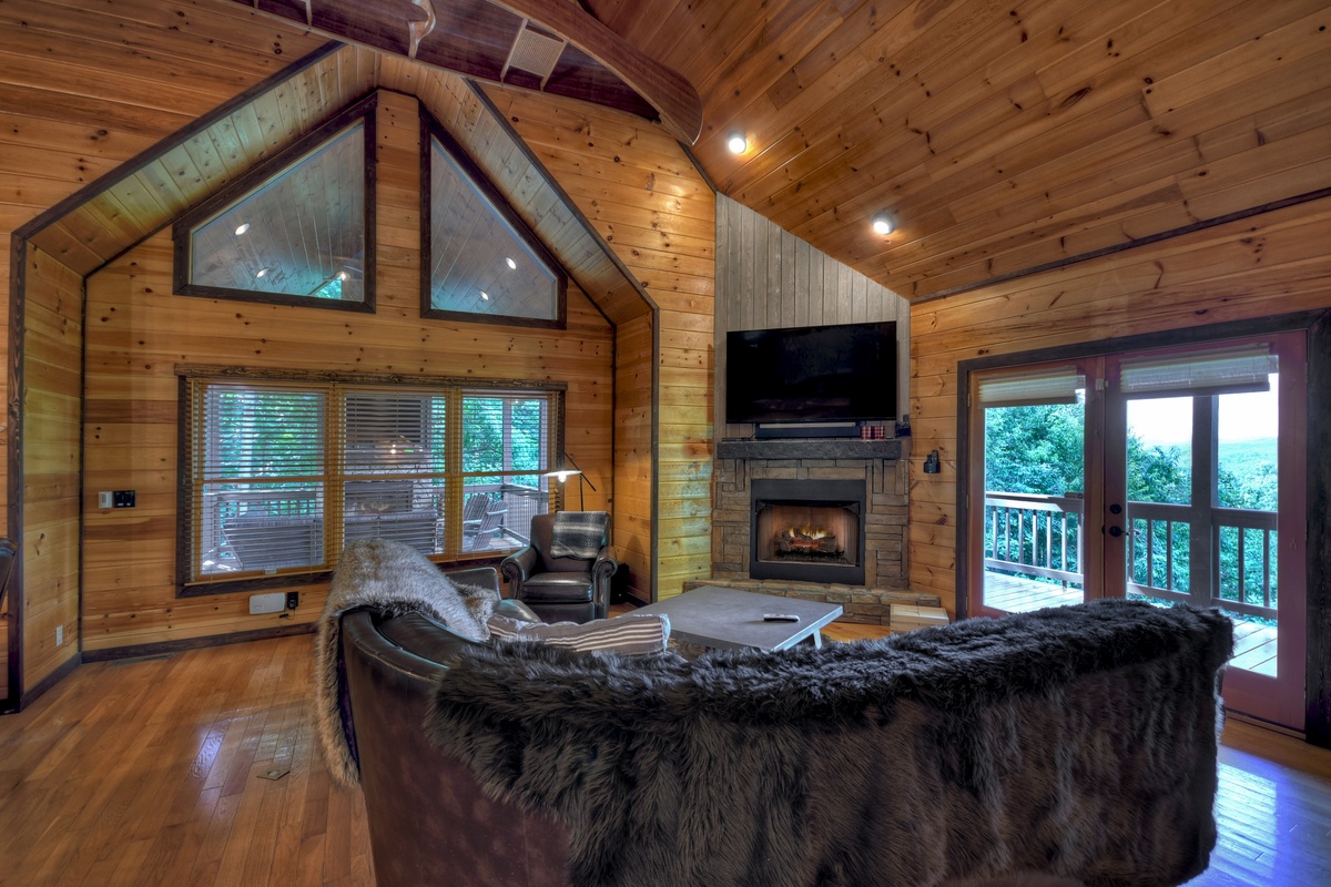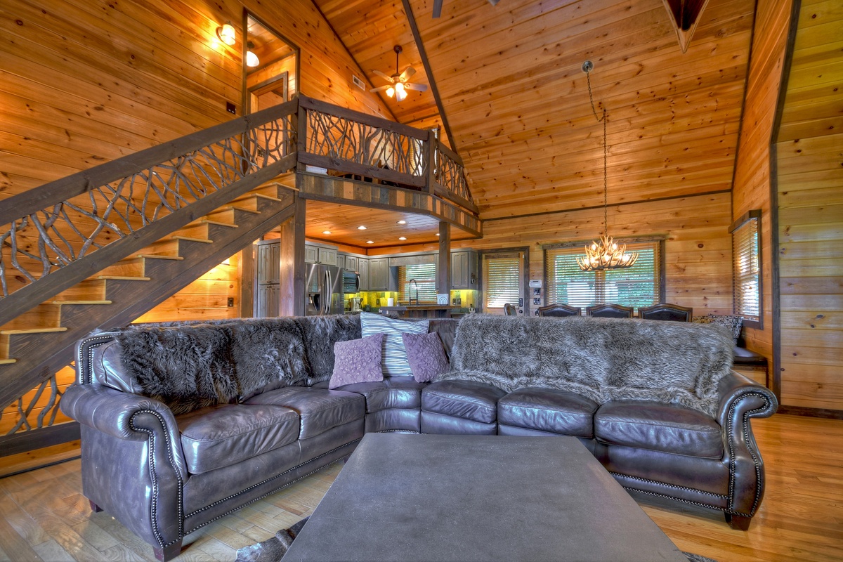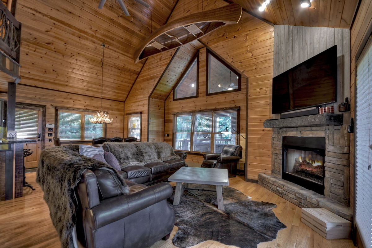 Some cabins just stick out from the rest, and "Hemptown Heights" is no exception. This wonderful cabin is set to make memories as soon as you walk in the front door. Take a look around at the soaring ceiling and gas log fireplace and you'll immediately feel at home. One of the great and unique features of this particular cabin is the abundance of over-sized, large TV's. The living room boasts a 75" TV with a Sonos Sound System and DirecTV over the beautiful gas log fireplace. Take a seat on the cozy leather sectional and relax your worries away! Get creative in the fully equipped kitchen and try your hand at making your favorite southern dish. The entry level to this well-appointed log cabin also has a queen bedroom with a 65" TV with DirecTV. The shared bathroom with walk-in shower is also easily accessible. This property also has a washer and dryer for your convenient laundering needs!
