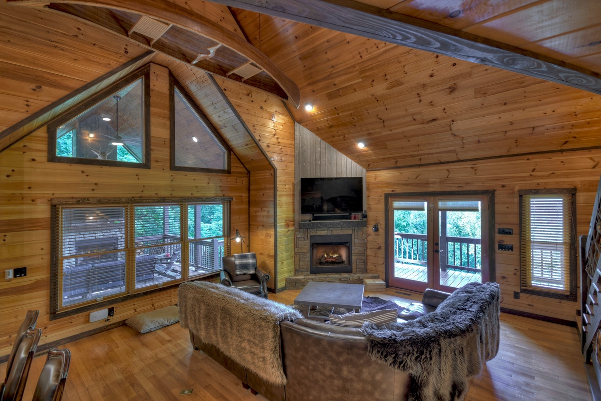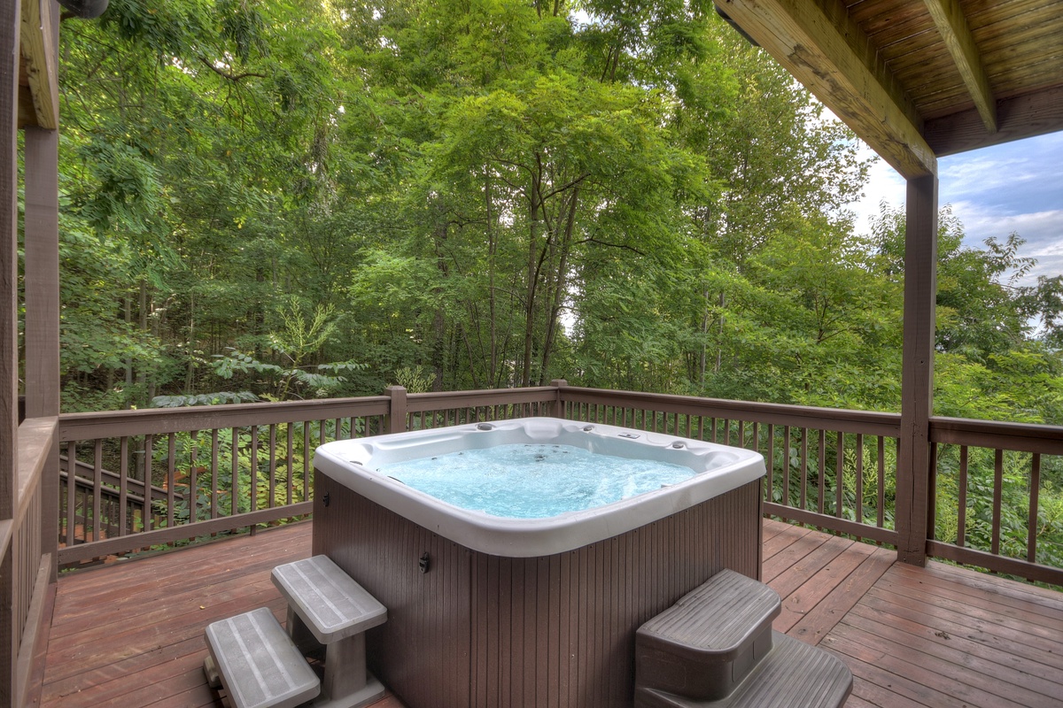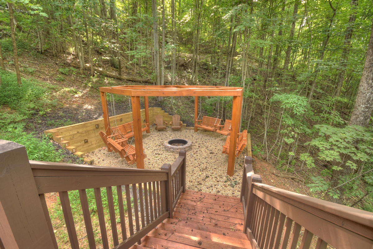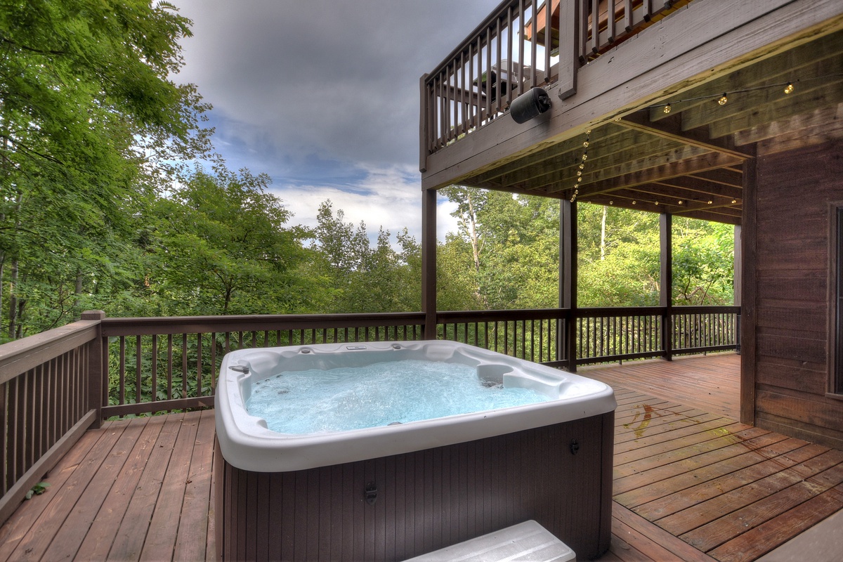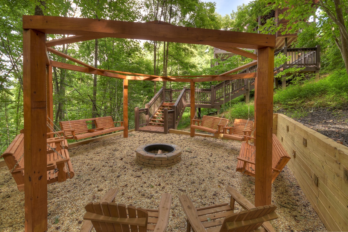 The fun doesn't stop there! The entry-level deck has an outdoor wood burning fireplace below a 65" TV with DirecTV and an ample amount of seating perfect for enjoying time with loved ones outdoors during the warm summer evenings. If steaks are for dinner, take advantage of the gas grill with provided propane while enjoying the beautiful mountain views. The terrace level patio has a 4 person hot tub and porch swing, perfect for unwinding after a long day of mountaineering. Last but not least, and maybe one of the best features this cabin has to offer is the custom-built fire pit complete with swinging benches and handcrafted Adirondack chairs around the fire pit!