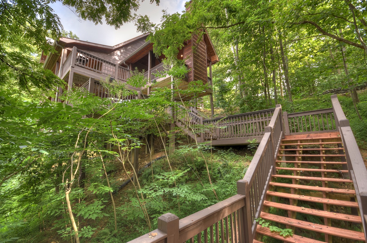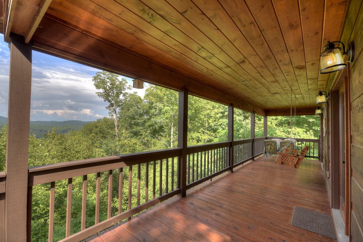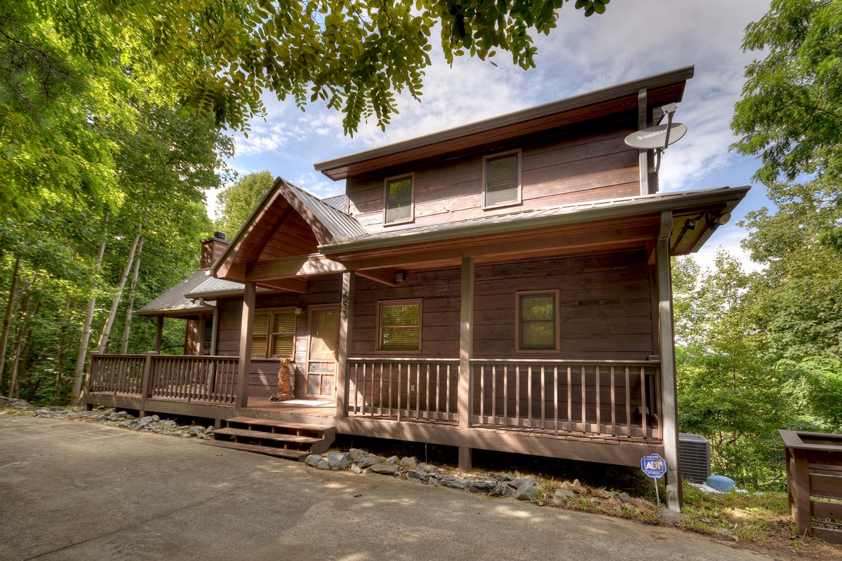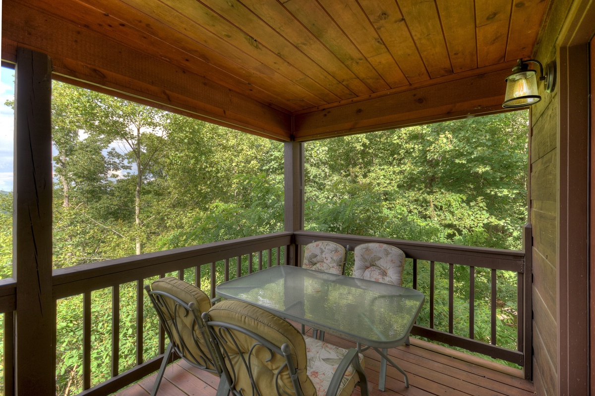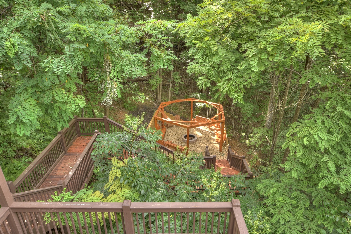 The fun doesn't stop there! The entry-level deck has an outdoor wood burning fireplace below a 65" TV with DirecTV and an ample amount of seating perfect for enjoying time with loved ones outdoors during the warm summer evenings. If steaks are for dinner, take advantage of the gas grill with provided propane while enjoying the beautiful mountain views. The terrace level patio has a 4 person hot tub and porch swing, perfect for unwinding after a long day of mountaineering. Last but not least, and maybe one of the best features this cabin has to offer is the custom-built fire pit complete with swinging benches and handcrafted Adirondack chairs around the fire pit!