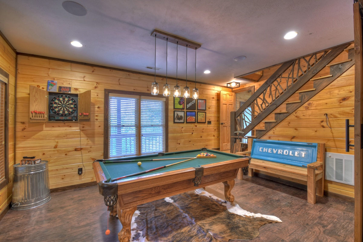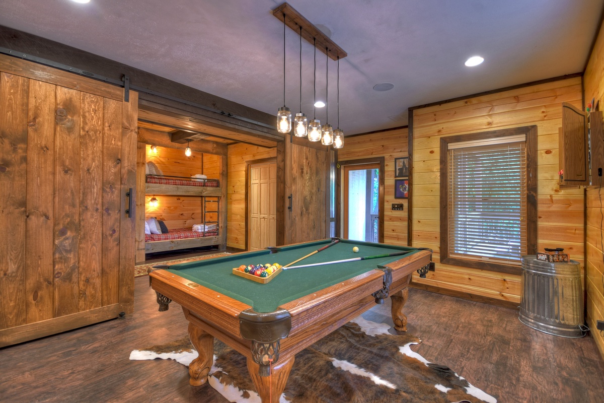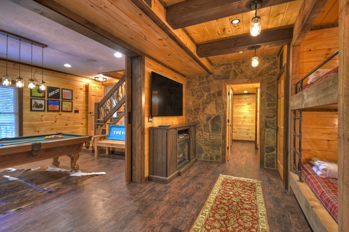 Head down to the lower-level to the recreation room and you'll find a pool table waiting for a friendly game of billiards. You can also take advantage of the darts game in the den area. Attached to this room is a very unique double wall bunk bed with 4 twins and another huge 75" TV with DirecTV, PS4, and an electric fireplace. There is also a queen bedroom on this level with a 55" TV with DirecTV. Both rooms share a double vanity bathroom with a tub/shower combo.