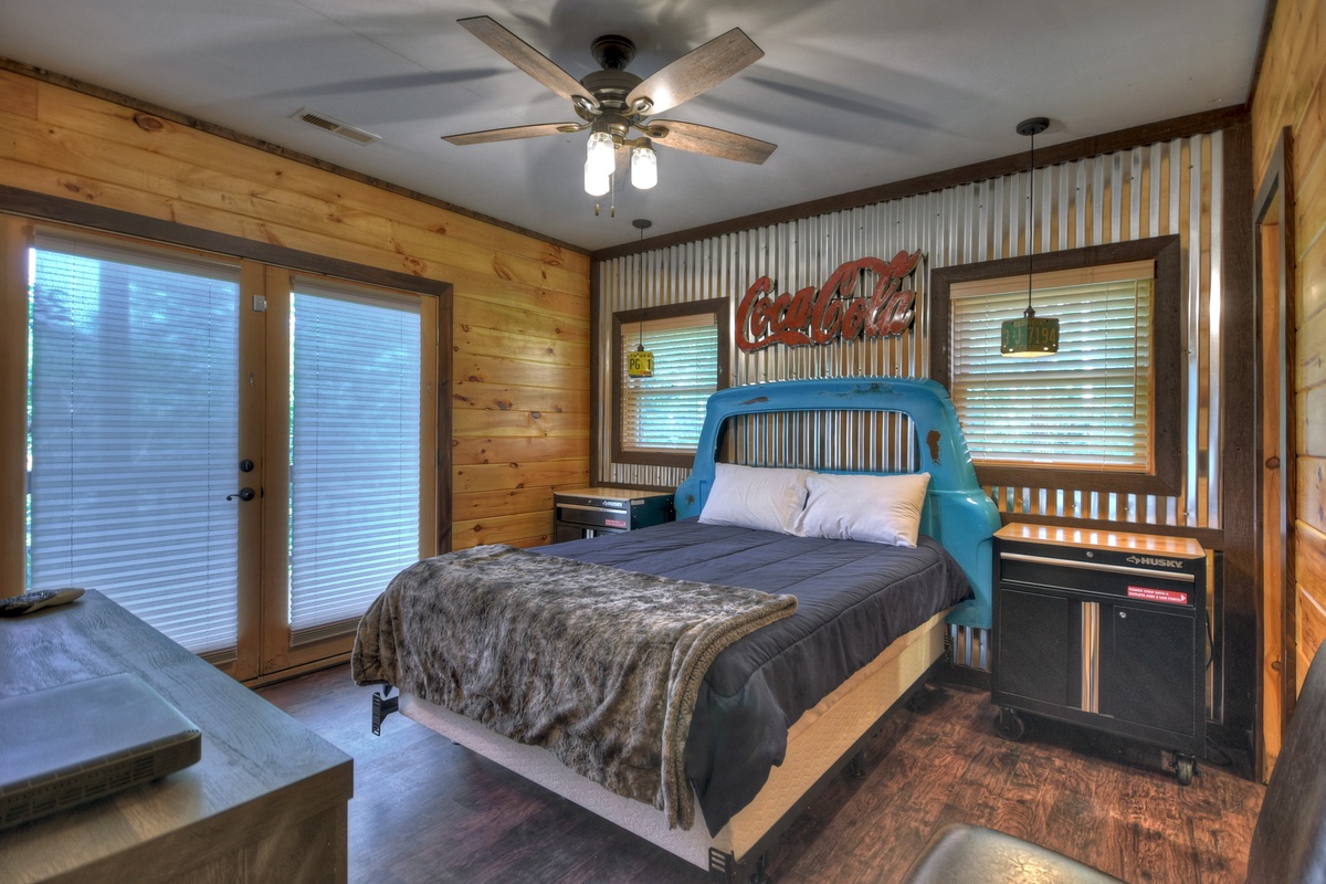 - Queen bedroom with 65" TV w/ DirecTV, deck access, and a shared bathroom w/ walk-in shower