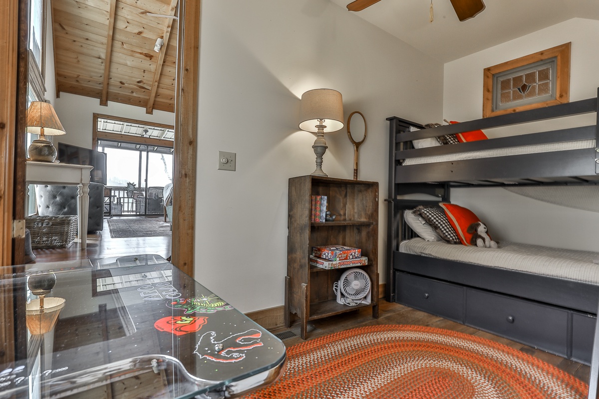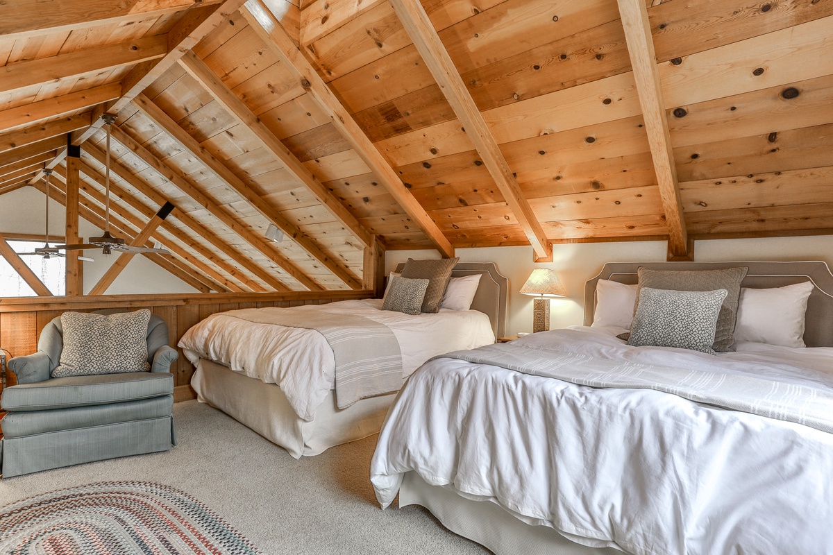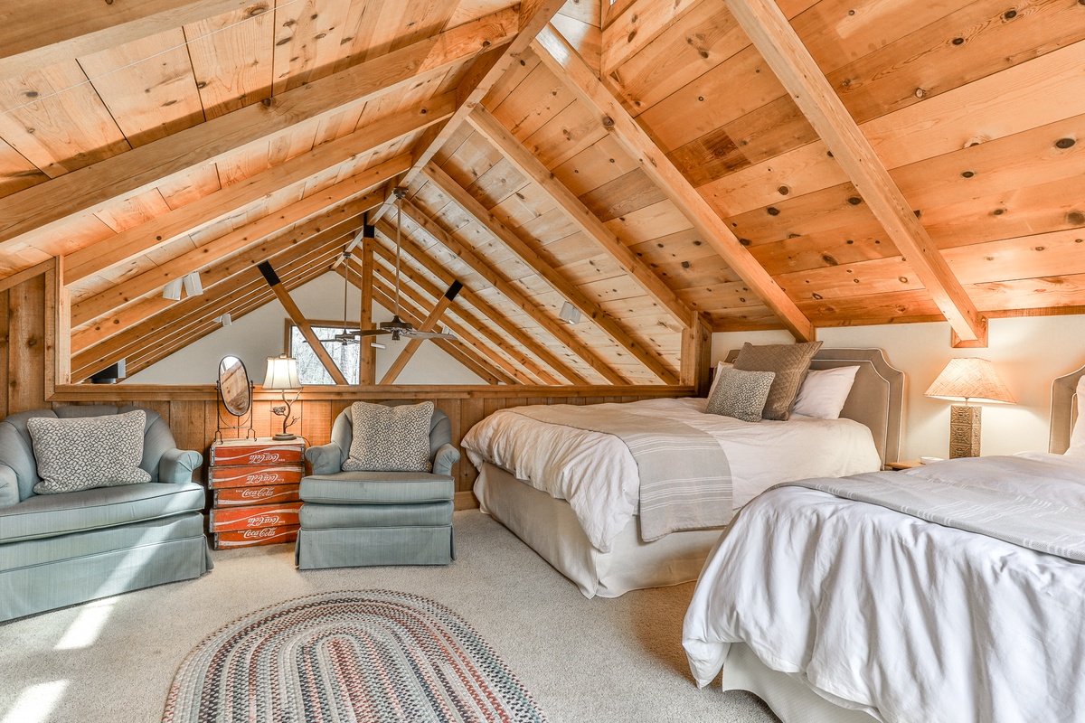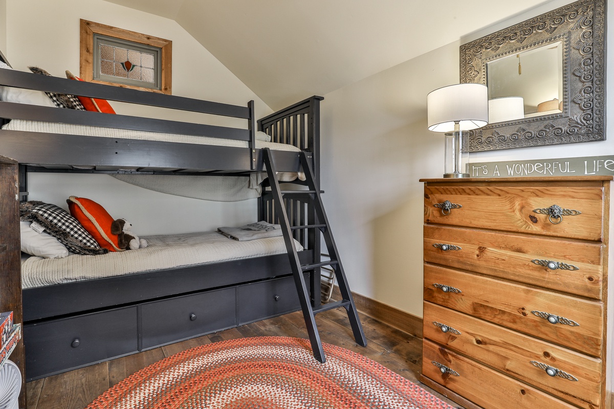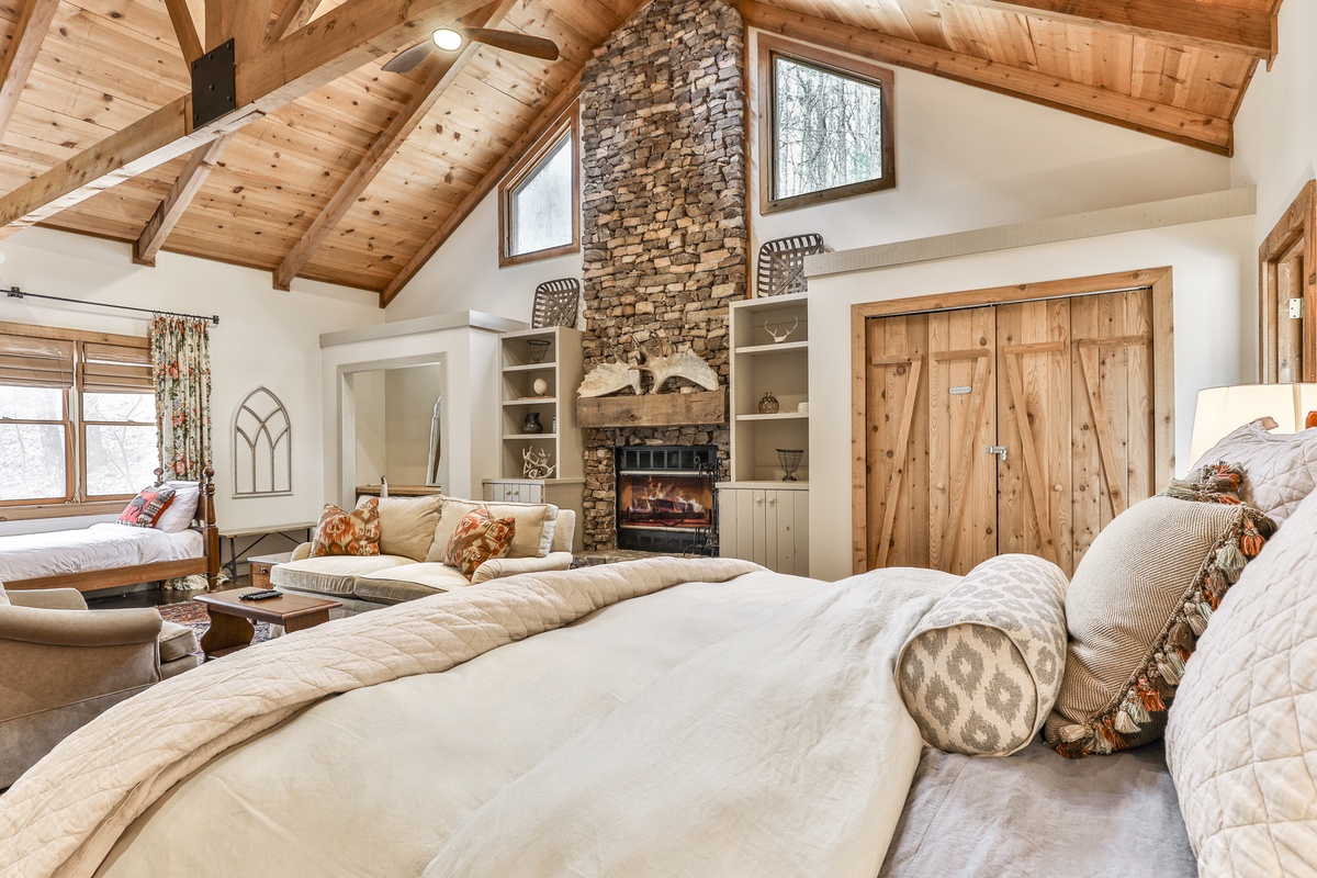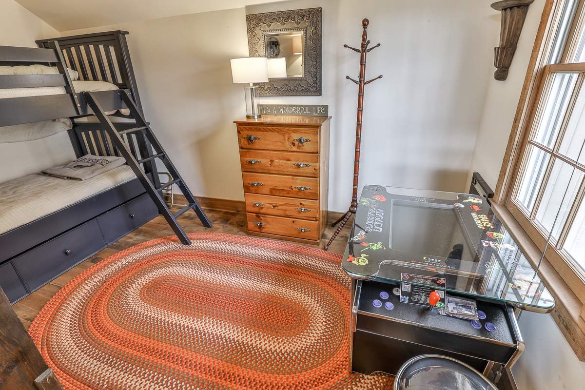 The expansive primary suite on the main level has a king bed, a private stacked stone hearth fireplace, an attached bathroom with a jetted tub, double vanities, and stunning views. This suite also includes a twin bed and a stylish desk. A second main-level guest room has a king bed and an attached bathroom. Upstairs, an inviting loft retreat with two queen beds is perfect for friends and children. Off the living room, a children's nook features wall bunk beds, an arcade game table, and books. A cozy bed built into the wall in the living room is perfect for naps or a quiet break with a book.