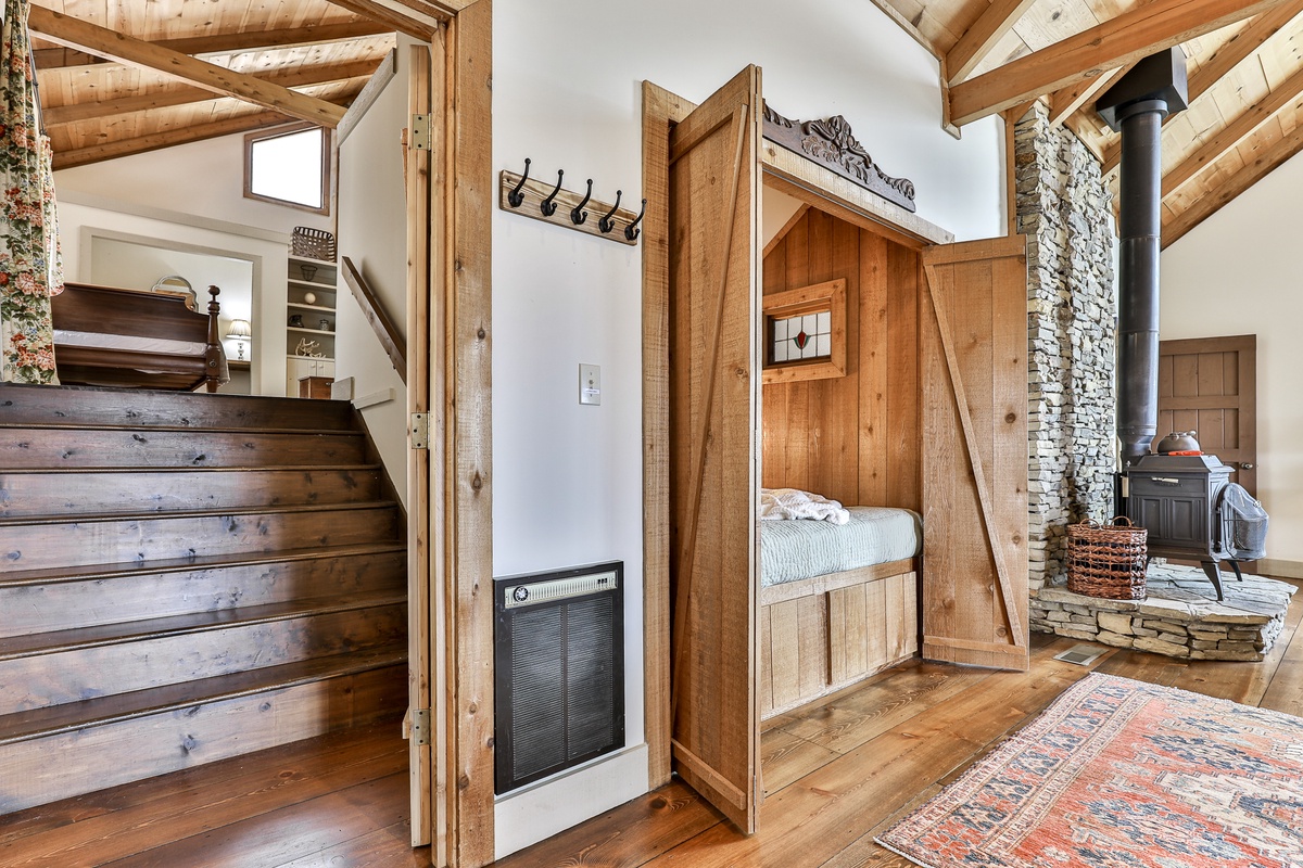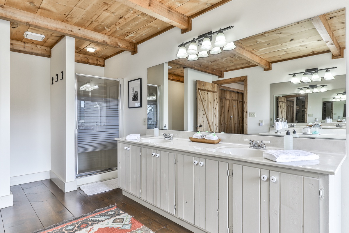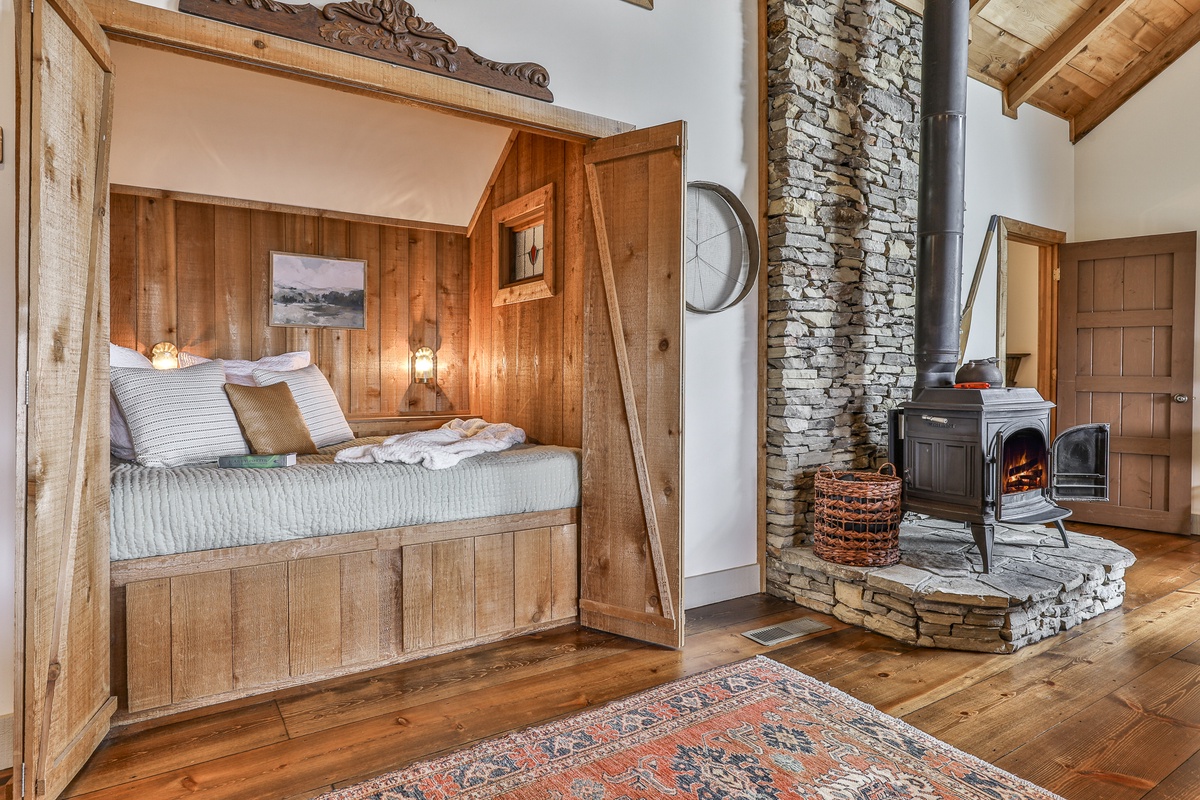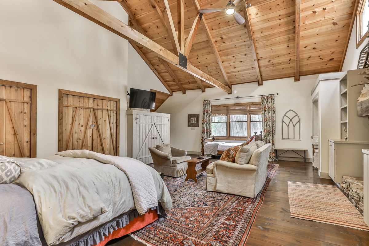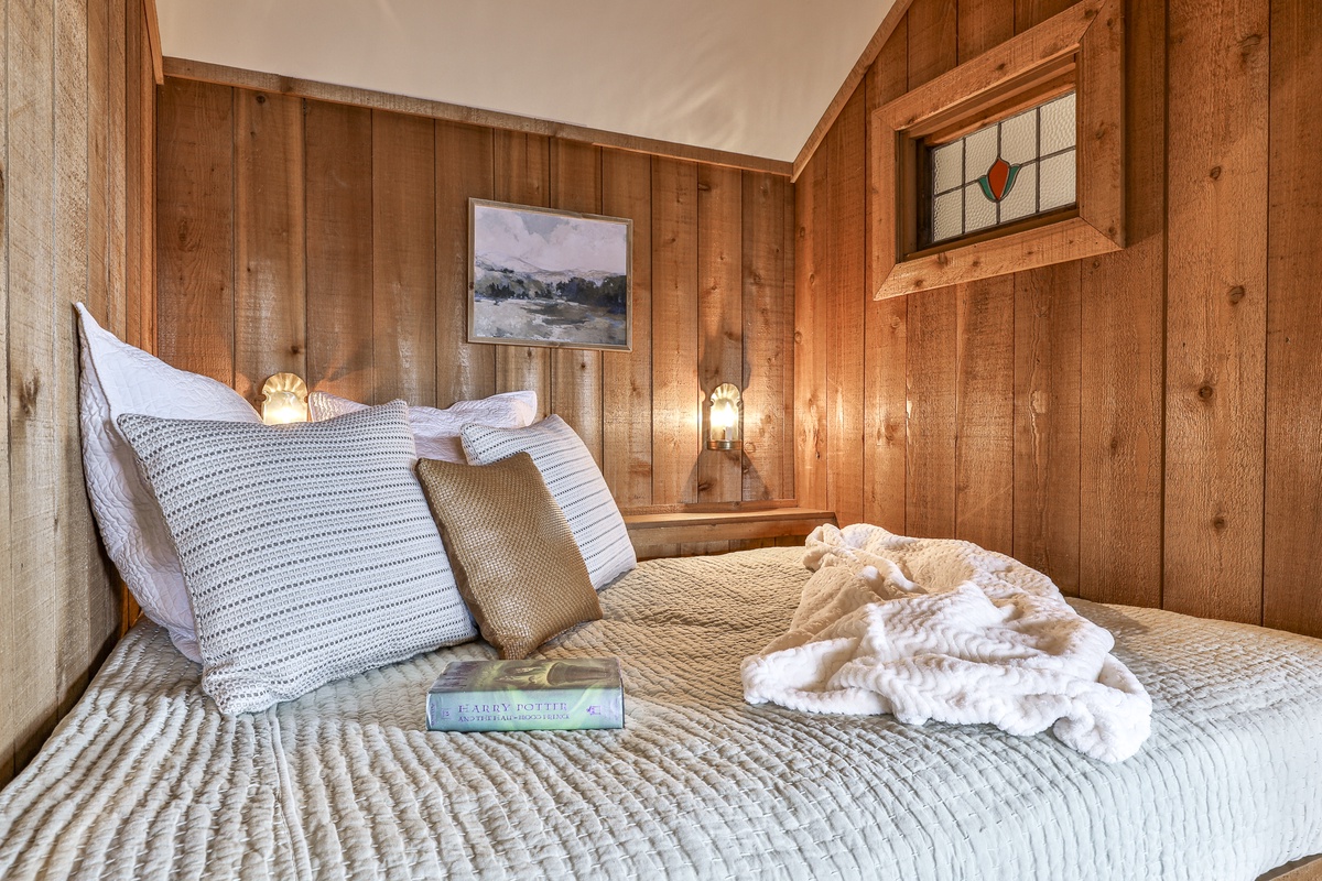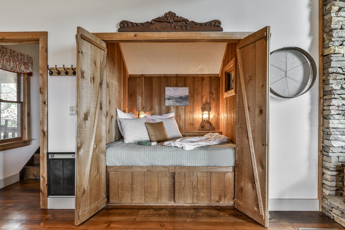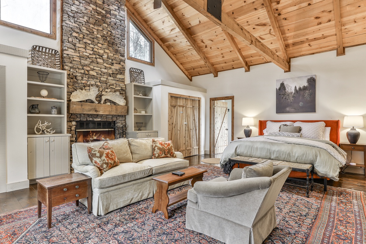 The expansive primary suite on the main level has a king bed, a private stacked stone hearth fireplace, an attached bathroom with a jetted tub, double vanities, and stunning views. This suite also includes a twin bed and a stylish desk. A second main-level guest room has a king bed and an attached bathroom. Upstairs, an inviting loft retreat with two queen beds is perfect for friends and children. Off the living room, a children's nook features wall bunk beds, an arcade game table, and books. A cozy bed built into the wall in the living room is perfect for naps or a quiet break with a book.
