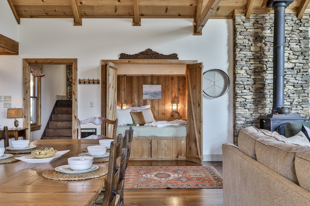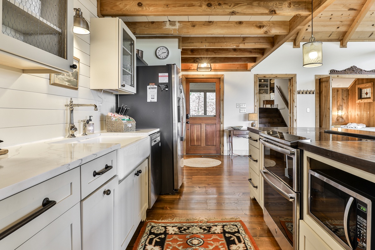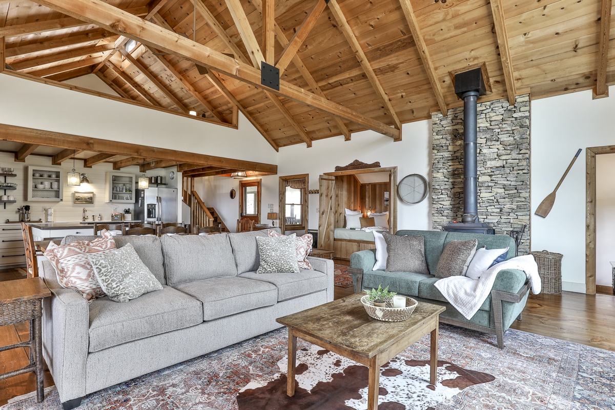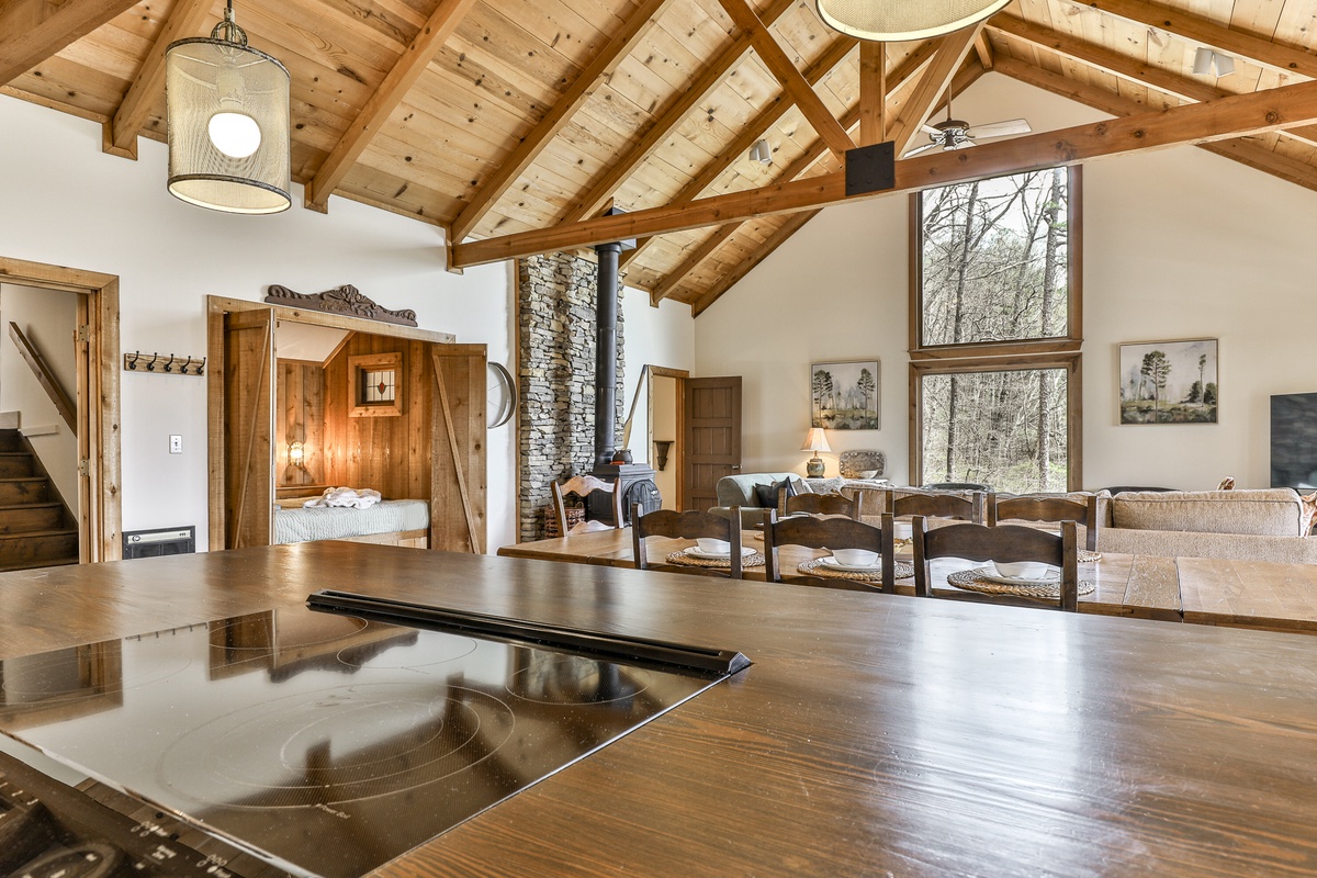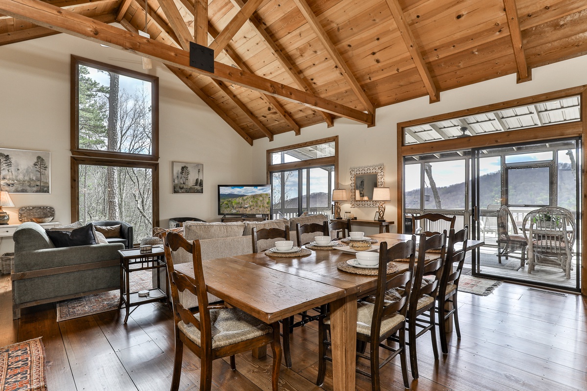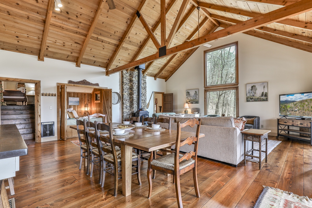 This open-plan Mountain Lodge boasts a well-appointed country kitchen, perfect for preparing meals, coffee, or snacks. The kitchen features Keurig and drip coffee makers and open shelves for easy access. The dining table seats six, with additional seating for three at the kitchen counter, offering stunning mealtime views. Additional dining and seating are available on the outdoor deck and screened porch with a cozy fire table.