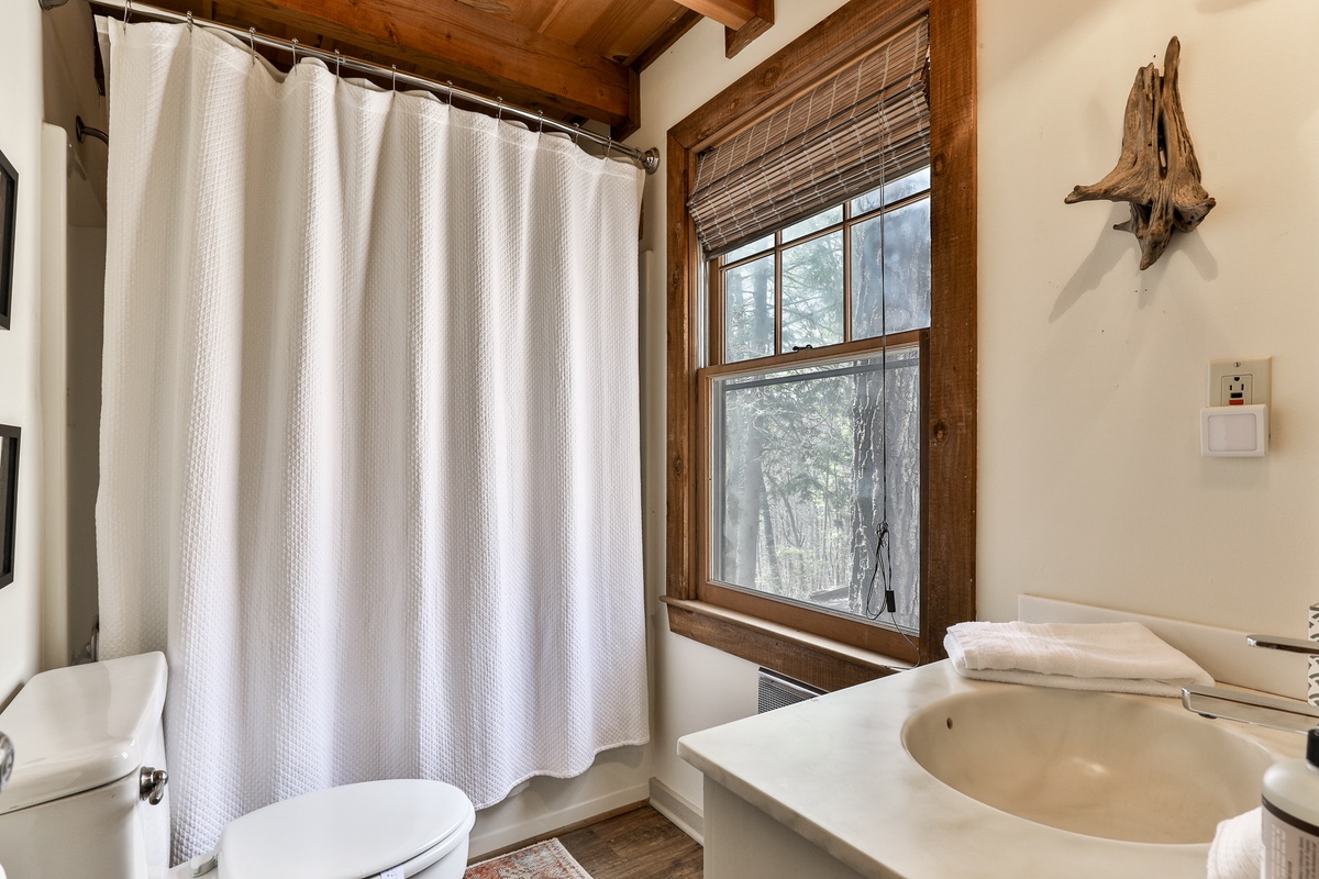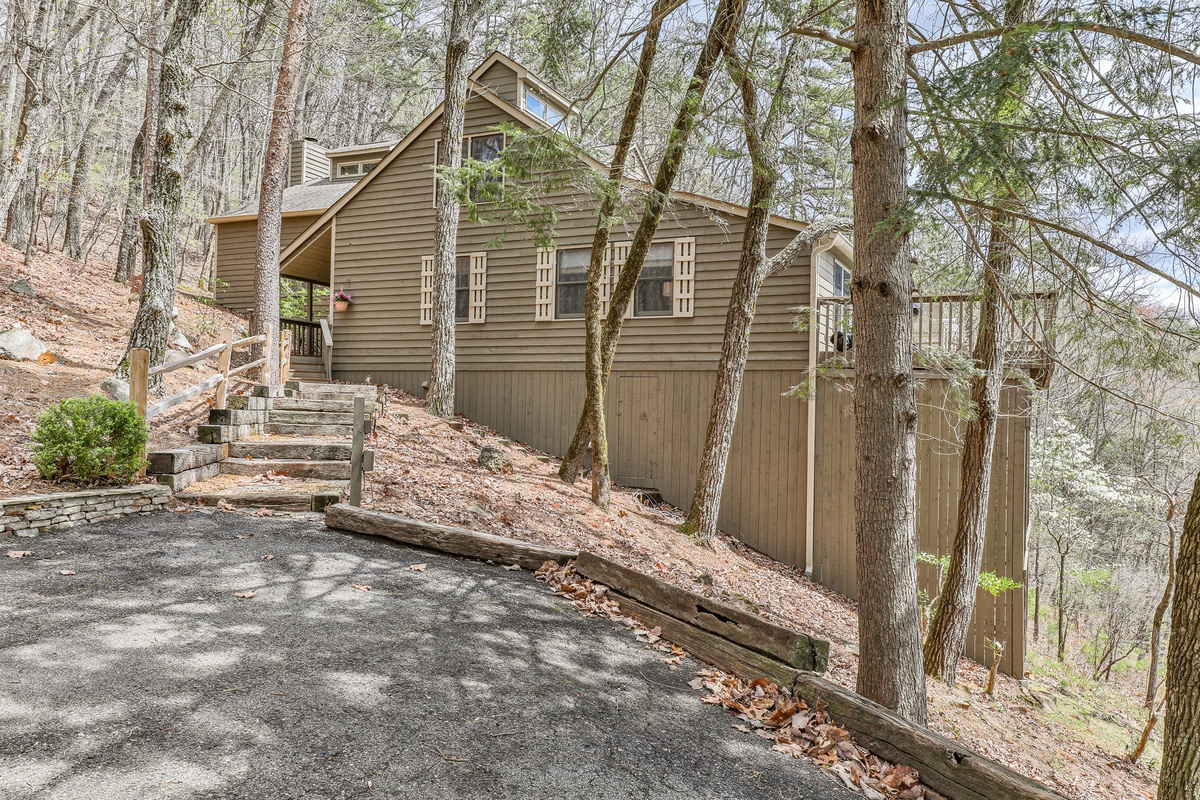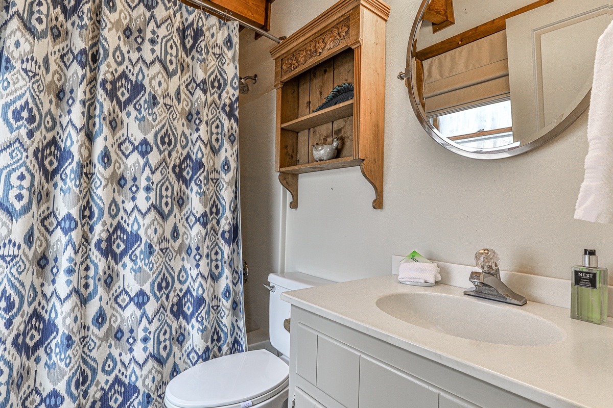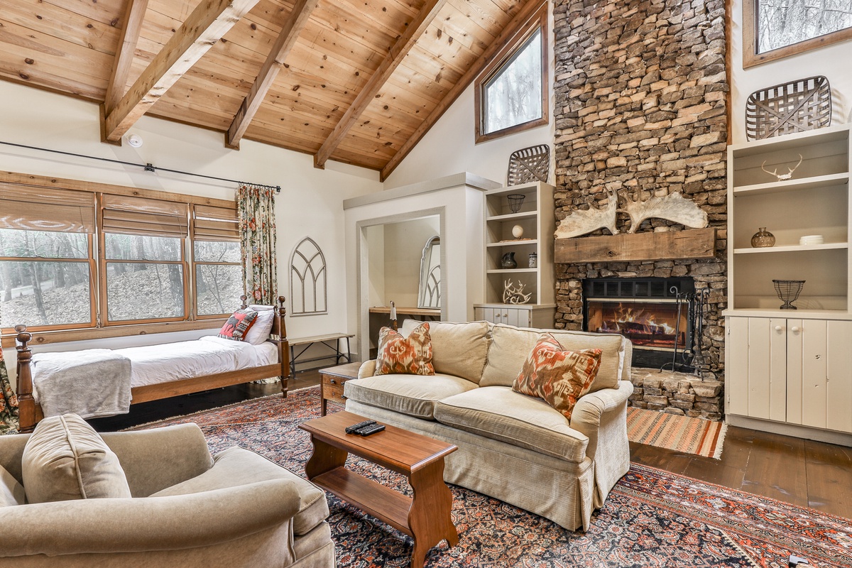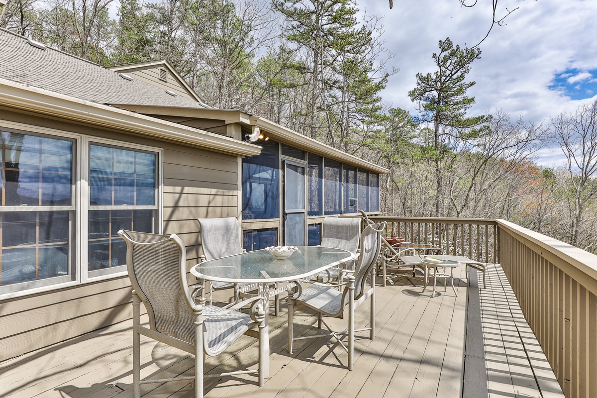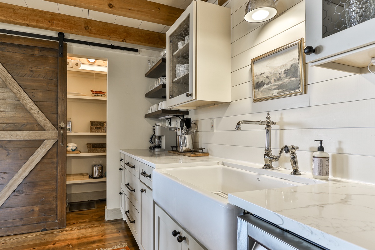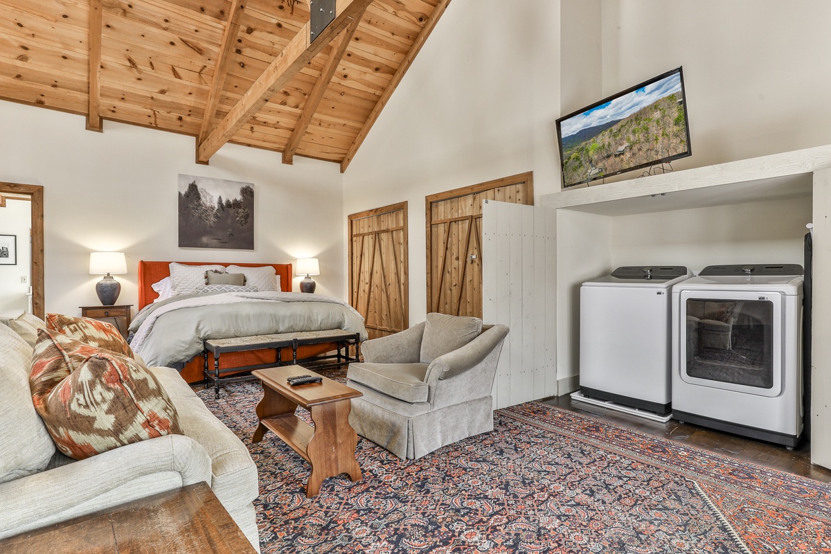 This open-plan Mountain Lodge boasts a well-appointed country kitchen, perfect for preparing meals, coffee, or snacks. The kitchen features Keurig and drip coffee makers and open shelves for easy access. The dining table seats six, with additional seating for three at the kitchen counter, offering stunning mealtime views. Additional dining and seating are available on the outdoor deck and screened porch with a cozy fire table.