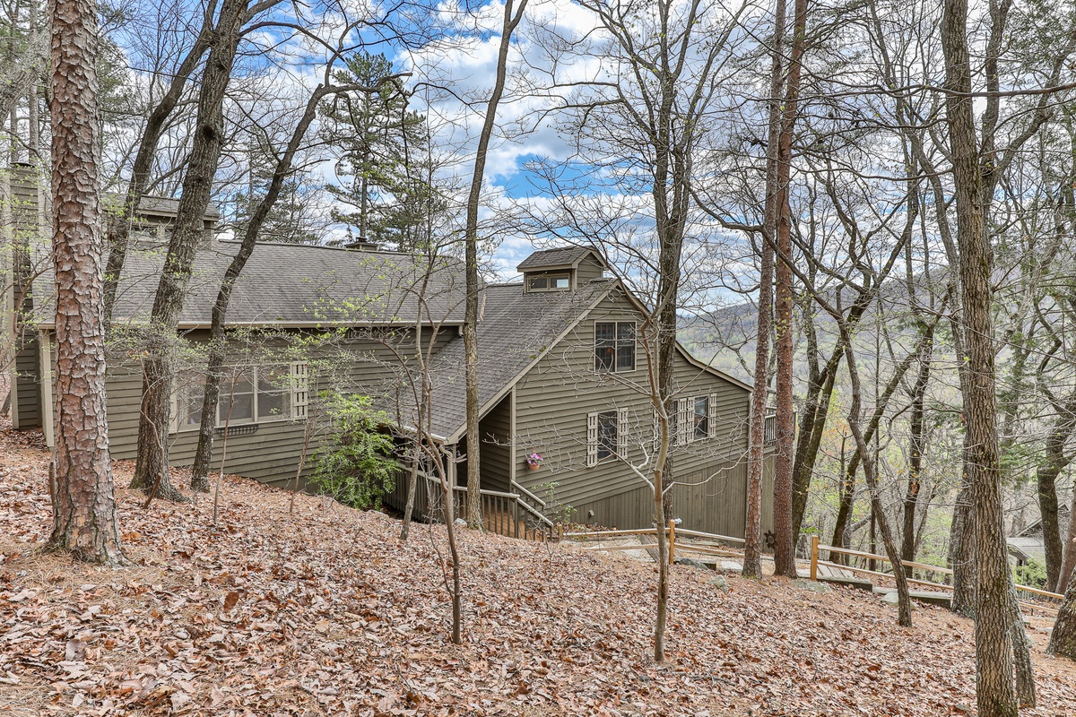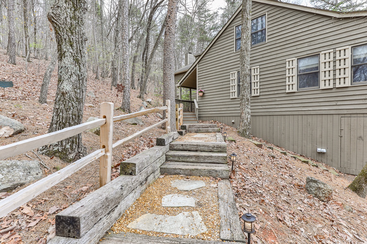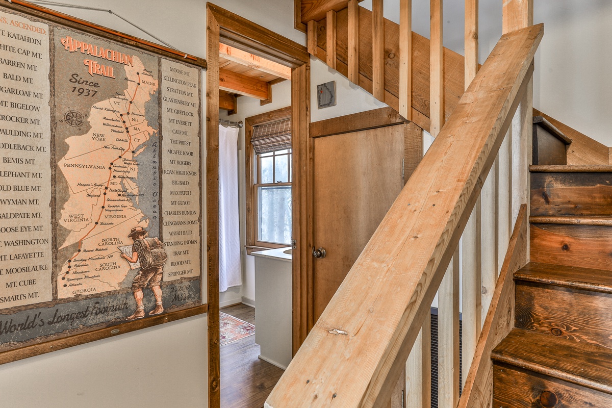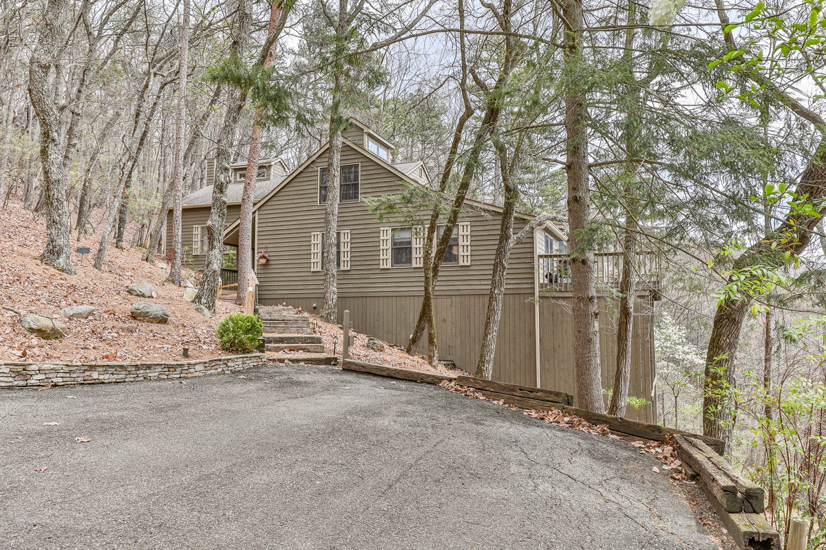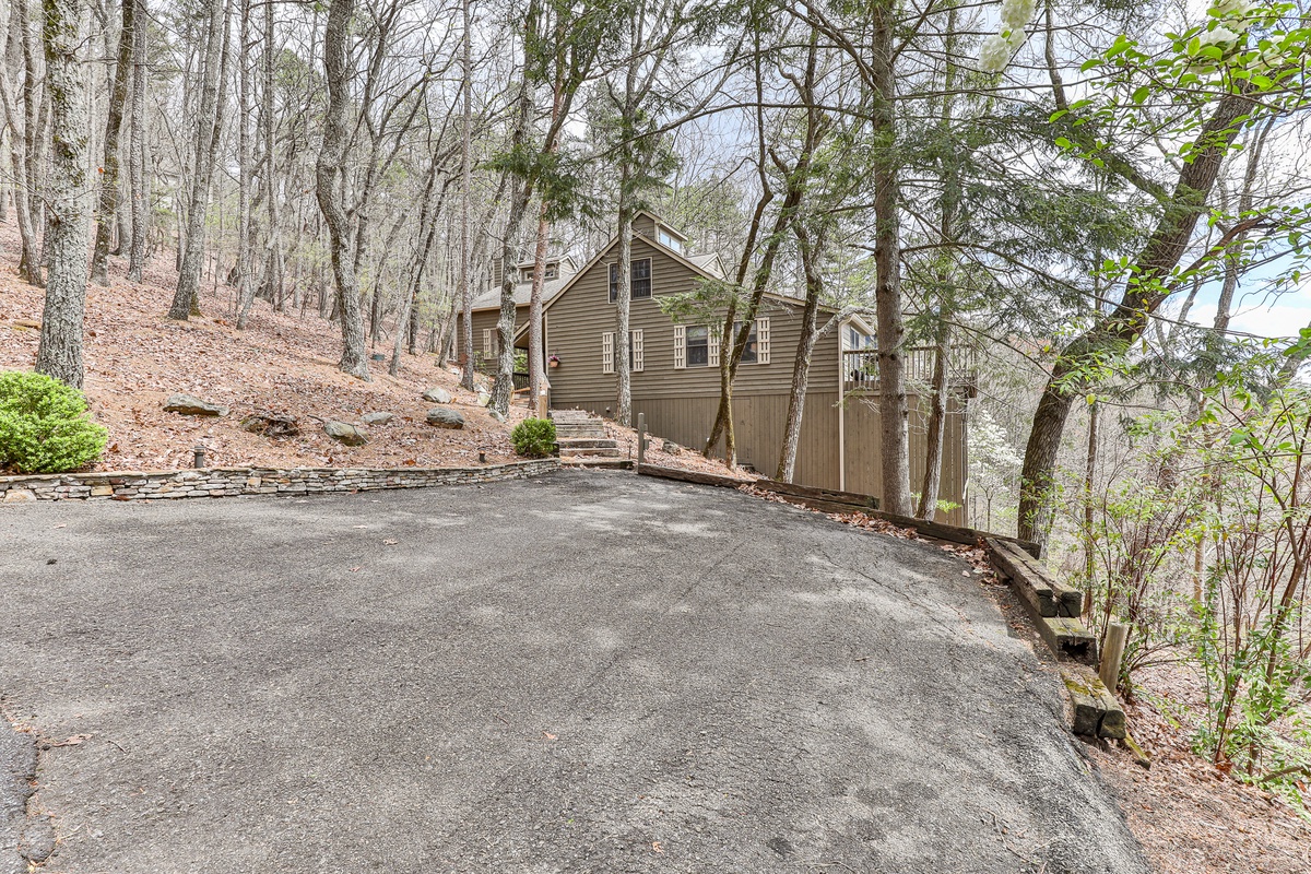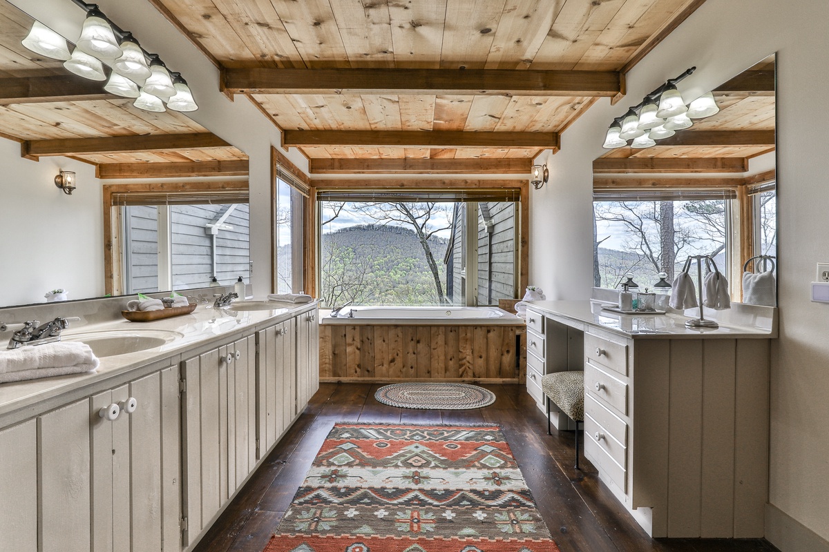 This open-plan Mountain Lodge boasts a well-appointed country kitchen, perfect for preparing meals, coffee, or snacks. The kitchen features Keurig and drip coffee makers and open shelves for easy access. The dining table seats six, with additional seating for three at the kitchen counter, offering stunning mealtime views. Additional dining and seating are available on the outdoor deck and screened porch with a cozy fire table.