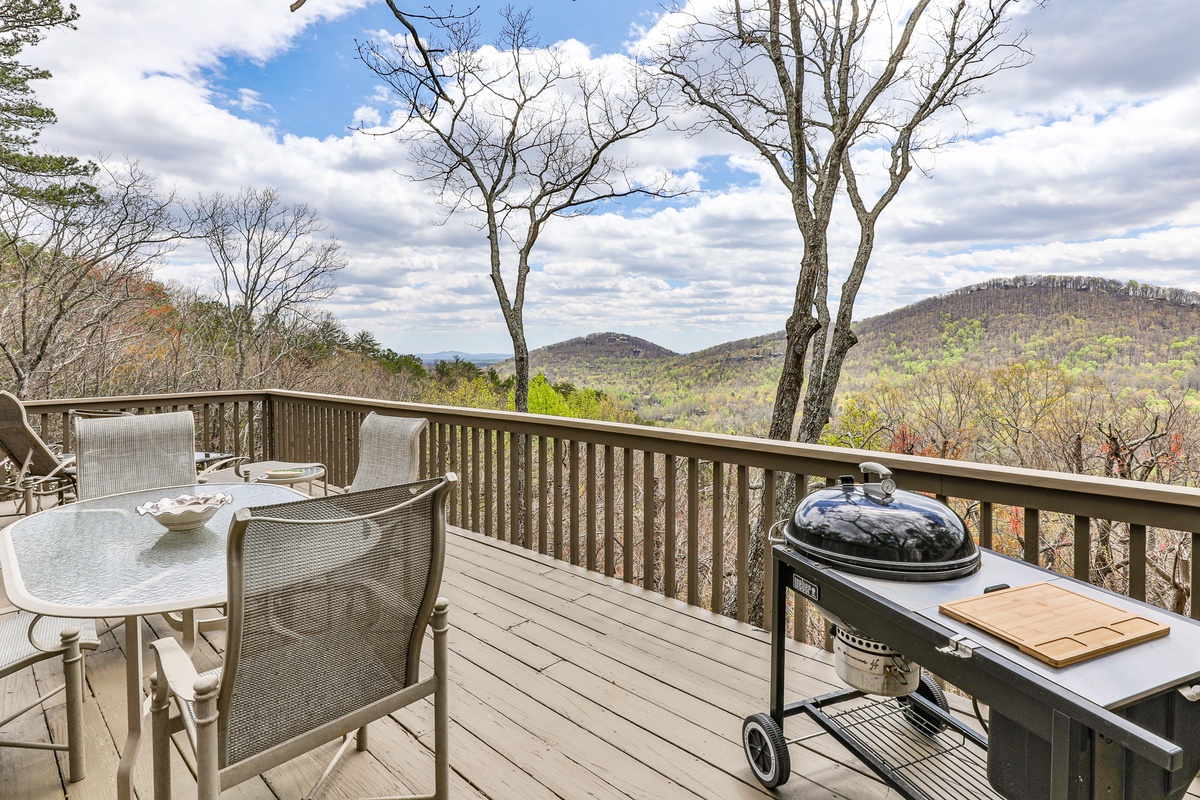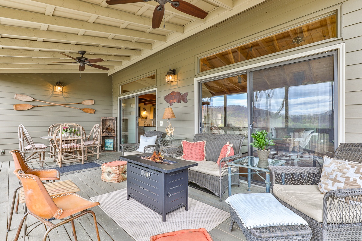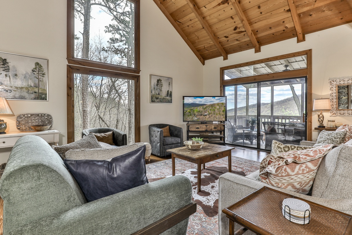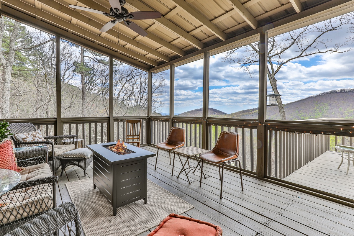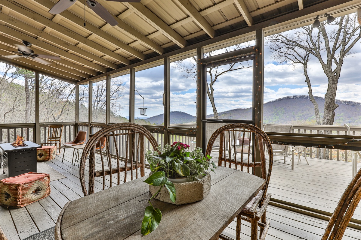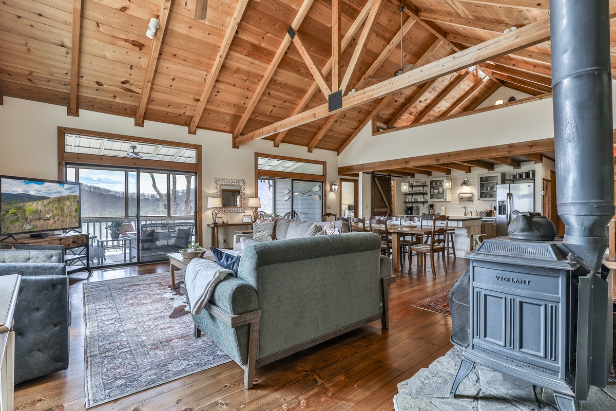 The open-plan living area features large windows with big sky mountain and wooded views. Comfortable seating, a cozy wood stove, and a large flat-screen TV make this space perfect for entertaining. The outdoor deck offers relaxation chairs, a dining table, and a large gas grill with gorgeous mountain views. The screened porch with an outdoor fire table and twinkle lights is a fun and inviting gathering area.