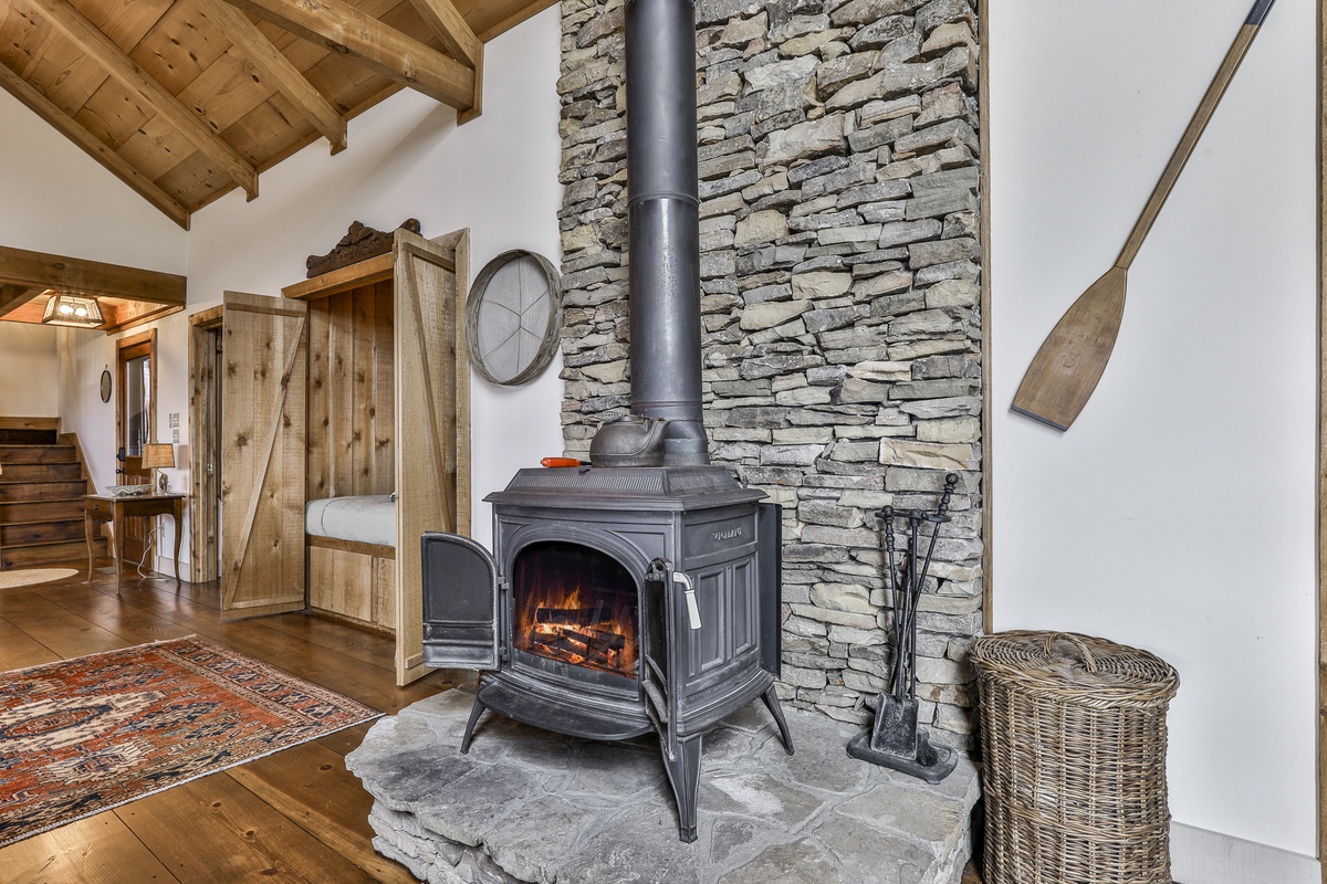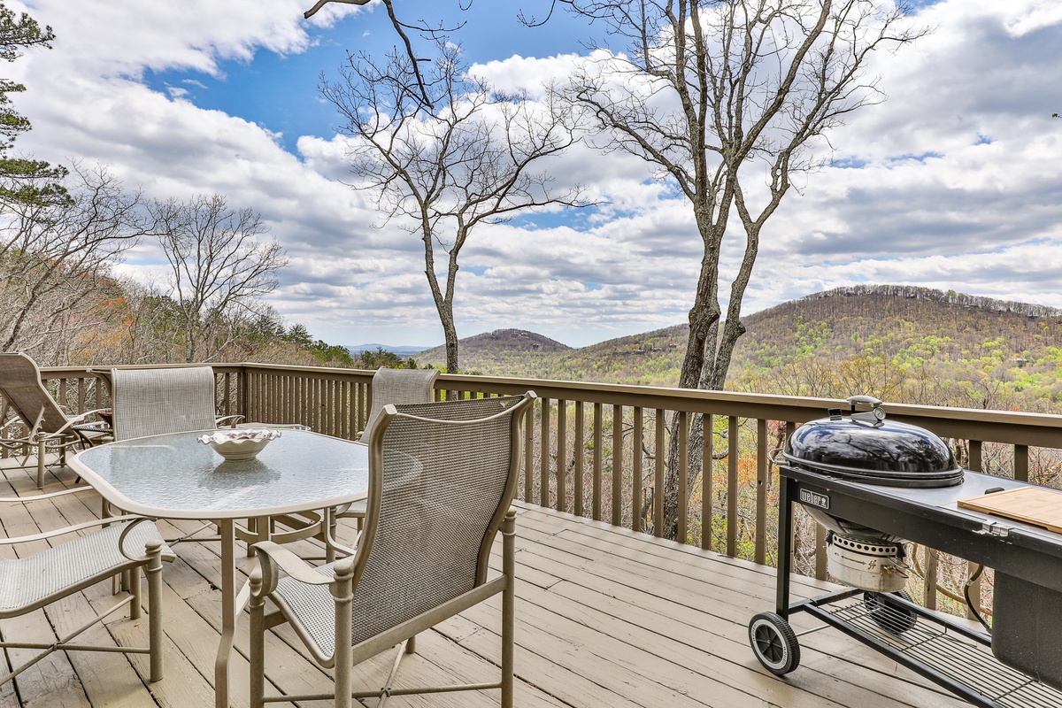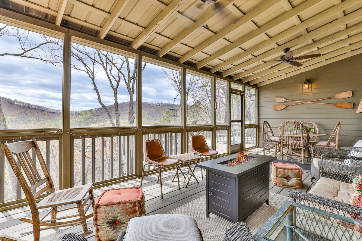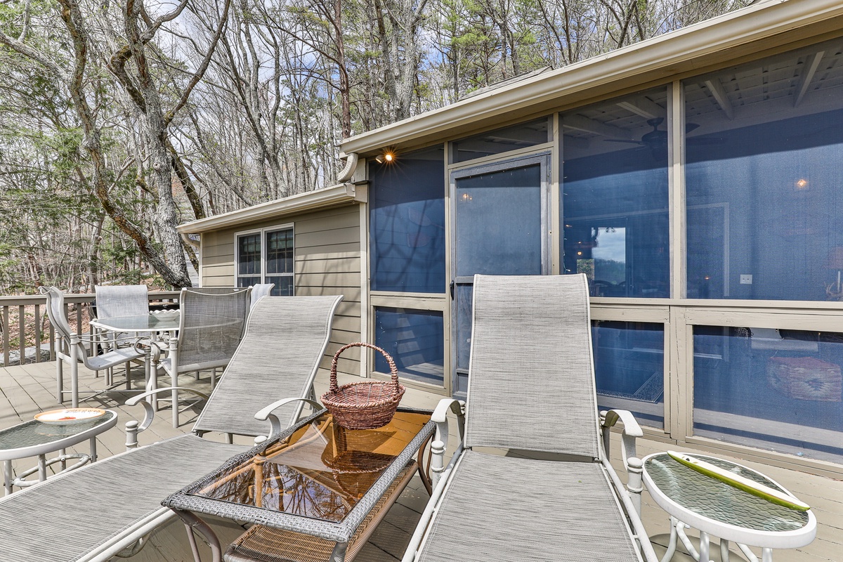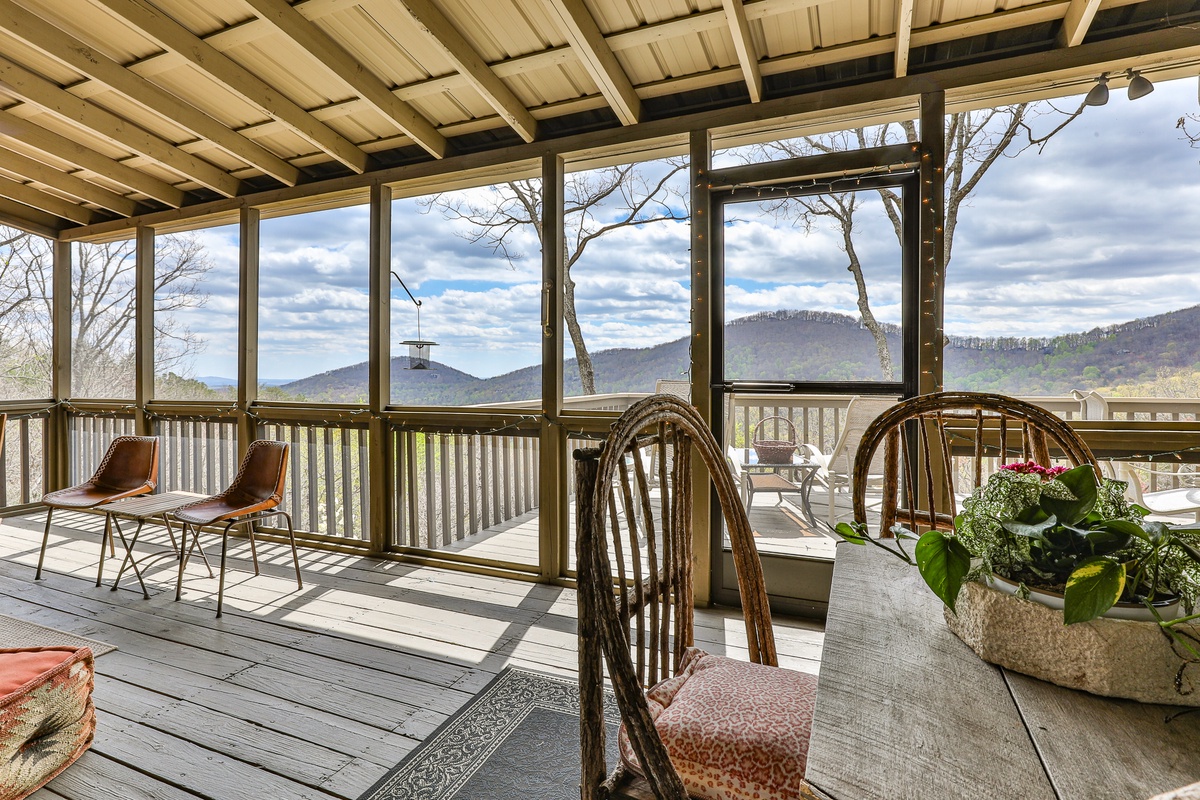 The open-plan living area features large windows with big sky mountain and wooded views. Comfortable seating, a cozy wood stove, and a large flat-screen TV make this space perfect for entertaining. The outdoor deck offers relaxation chairs, a dining table, and a large gas grill with gorgeous mountain views. The screened porch with an outdoor fire table and twinkle lights is a fun and inviting gathering area.