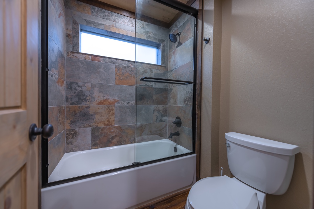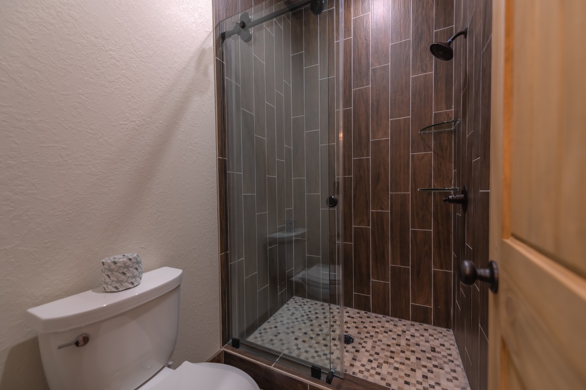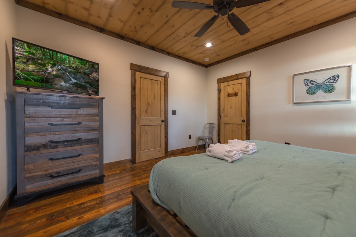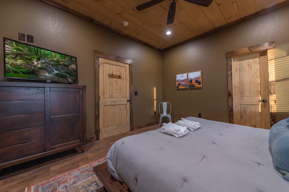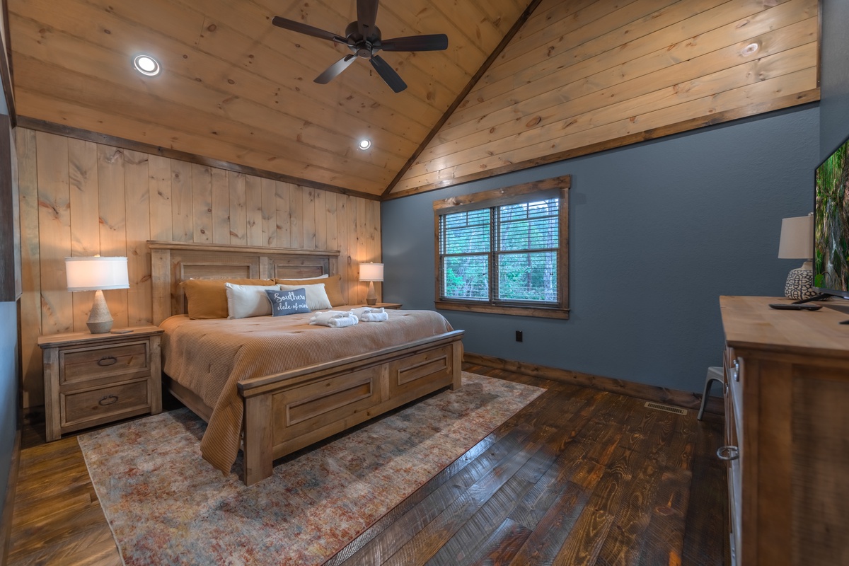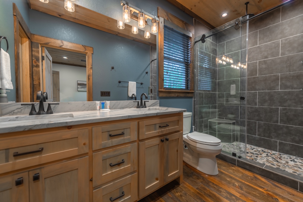 - Master King Bedroom with 42" TV, Deck Access, and Full Bathroom with Double Vanities, Stand Up Rainfall Shower, and