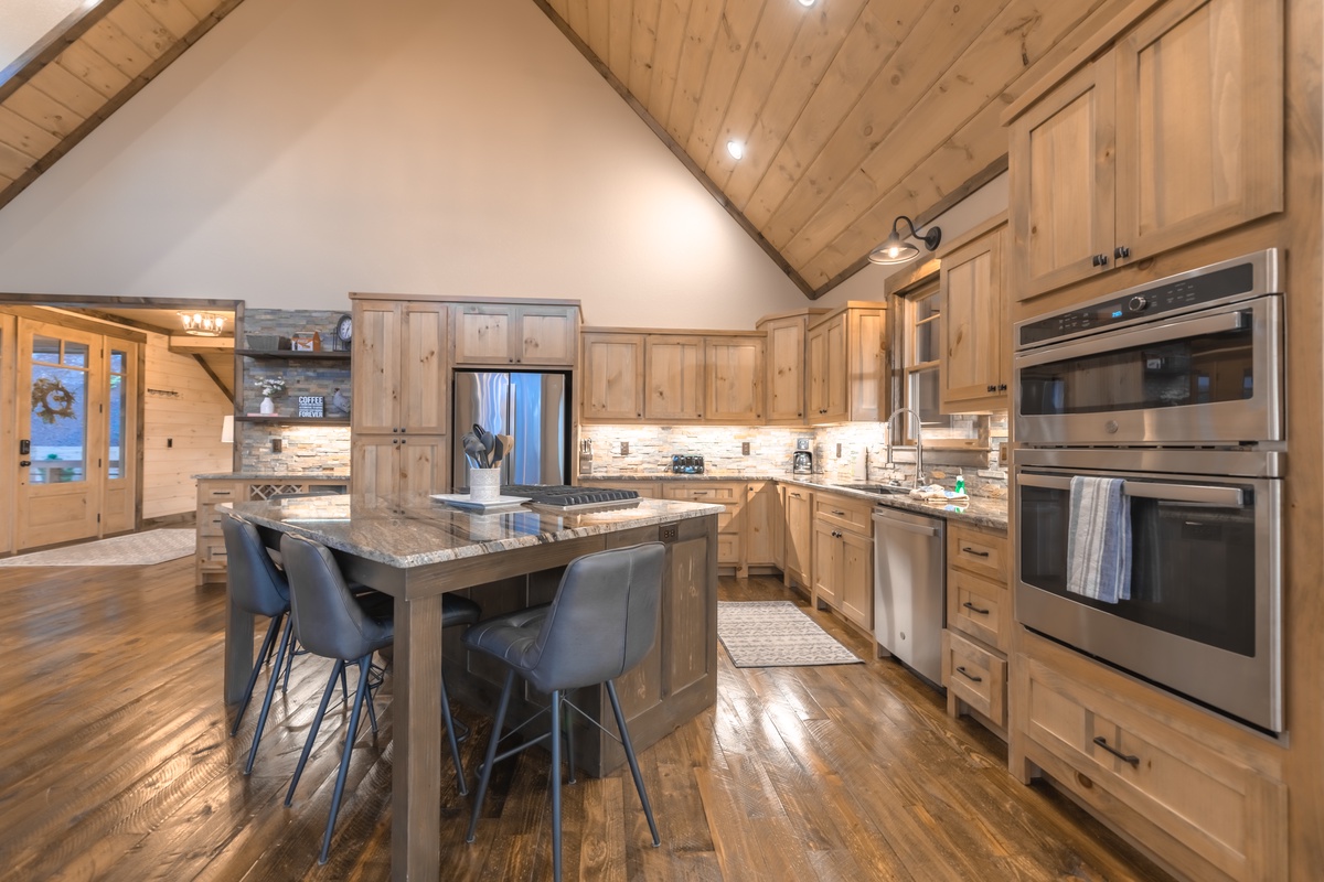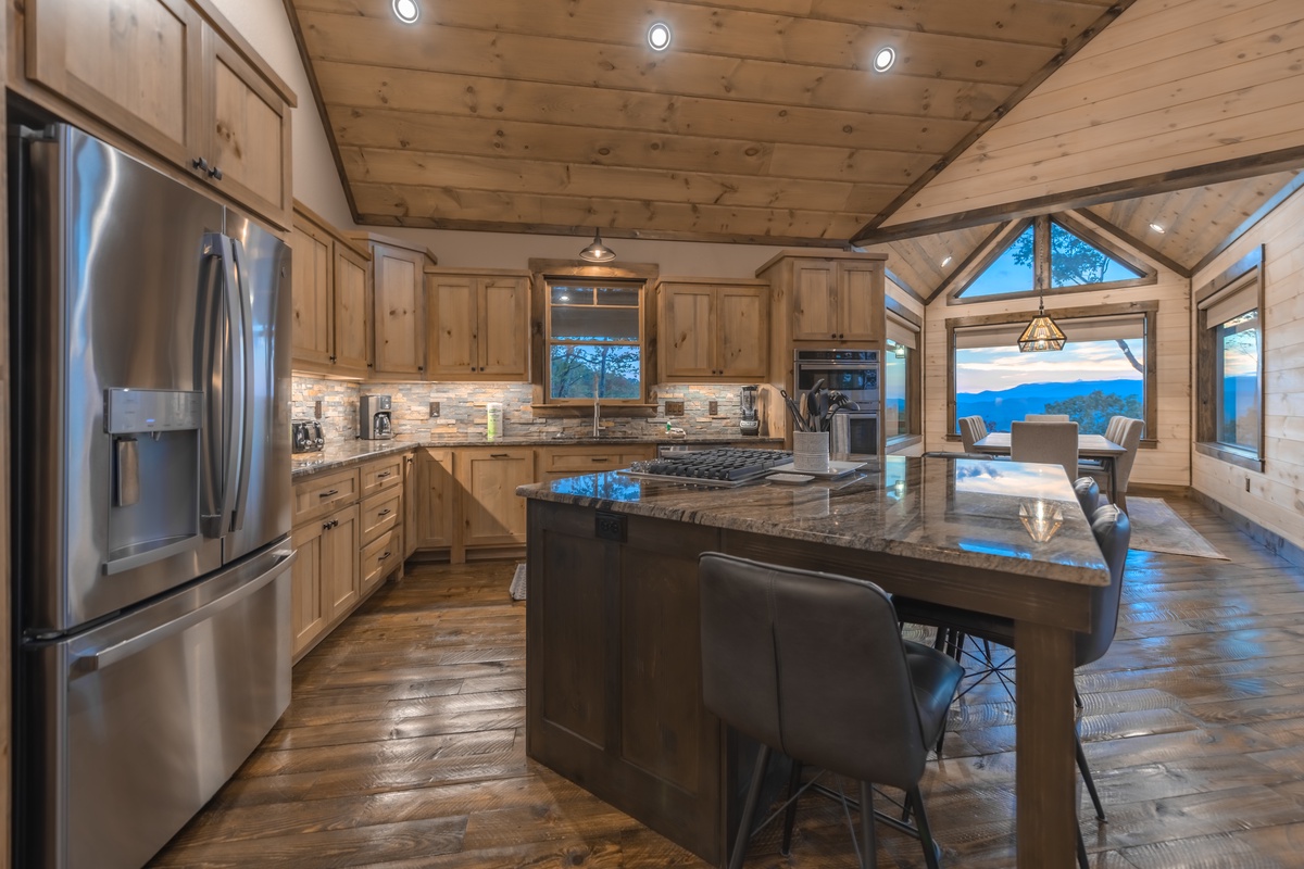 Dining for 8 in the unique mountain view dining room, sets the tone for formal or family fun. Enjoy your breakfast watching the sunrise and talk about the plans for the day as everyone wakes up. The kids can snack throughout the day at the granite countertop kitchen island and play their videogames as they tell their friends what a great time they are having with their family. Stainless steel appliances and a gas range will make it all too convenient to stay in and prepare healthy and delicious meals for everyone.