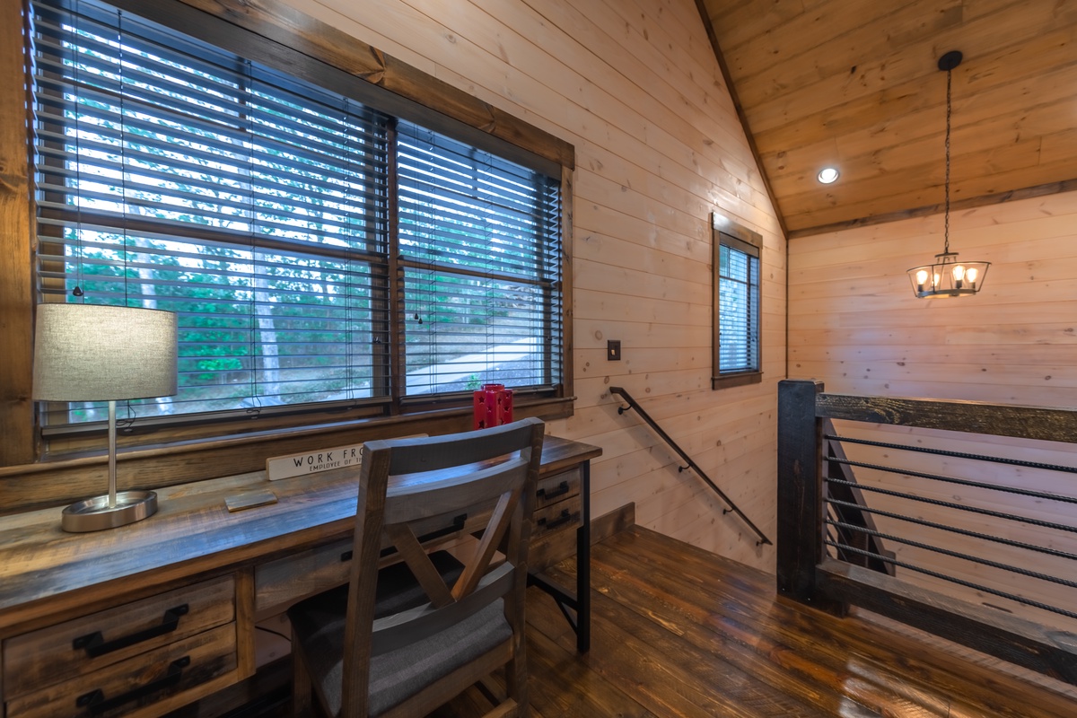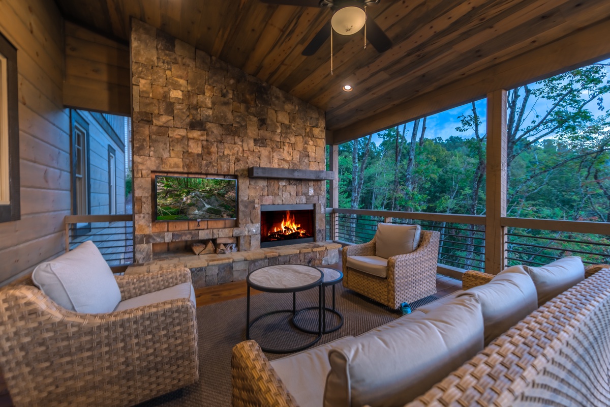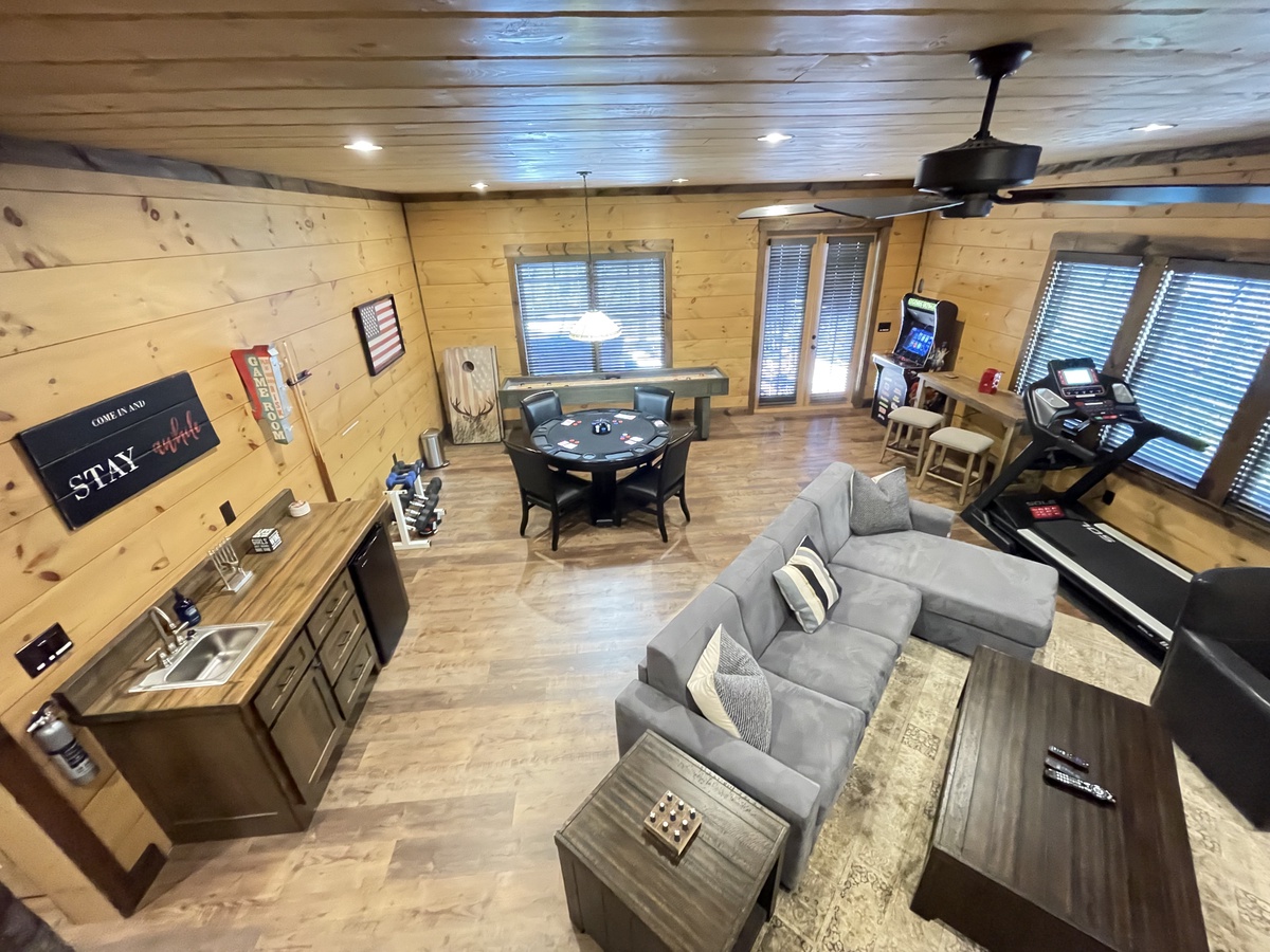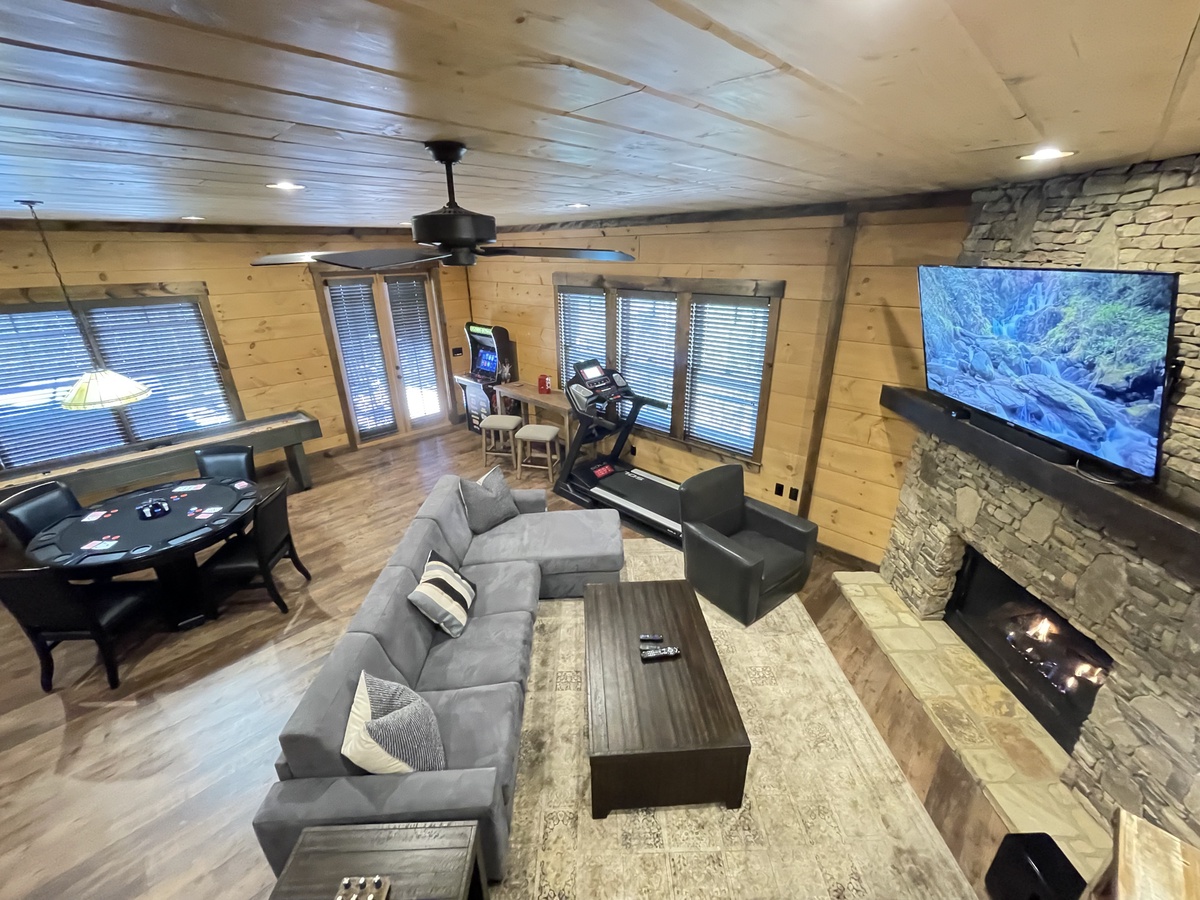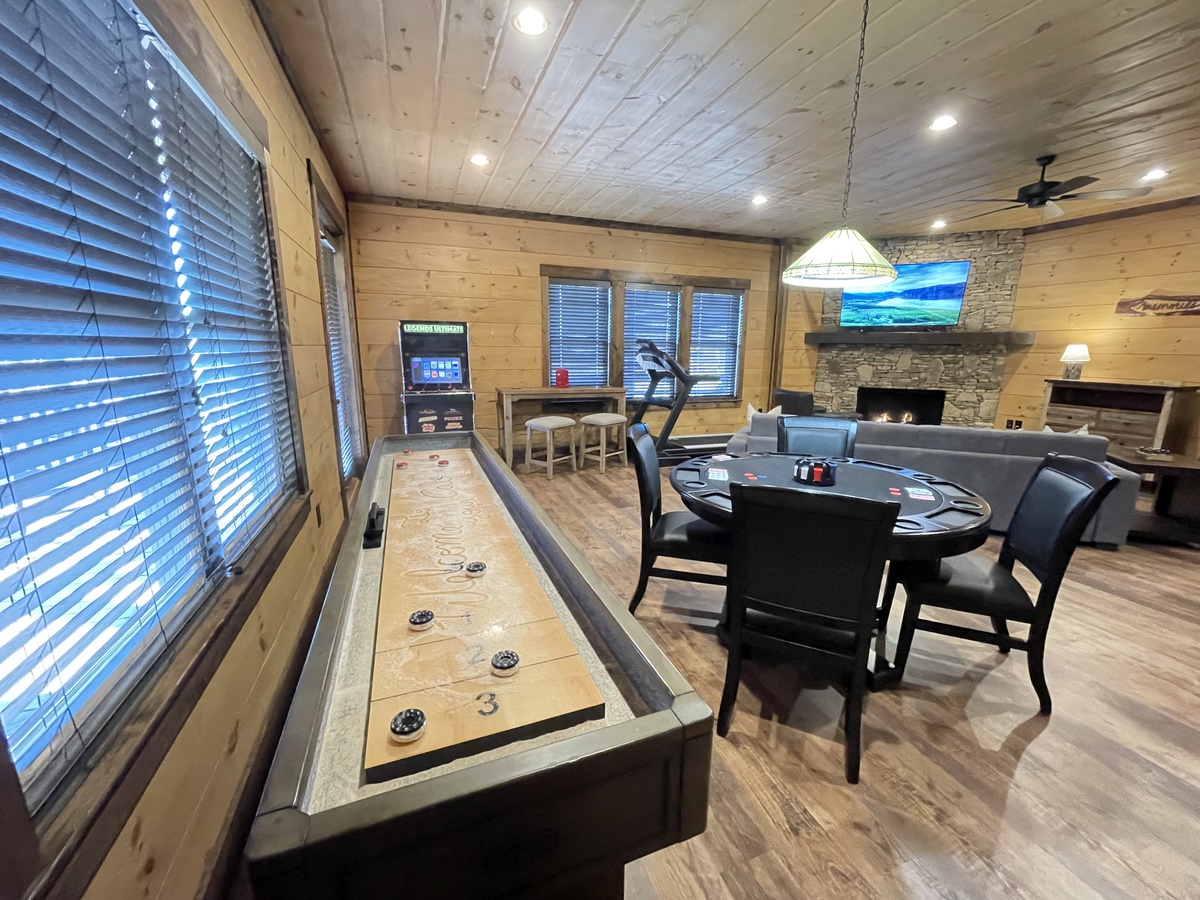 The fireplaces inside and out, creates and ambiance of warmth and romance for those Fall and Winter months. De-stress and decompress while taking in the view and sipping on your favorite chardonnay in the secluded hot tub. Enjoy a movie, play a game of shuffle board or your favorite card game in the massive man cave downstairs.