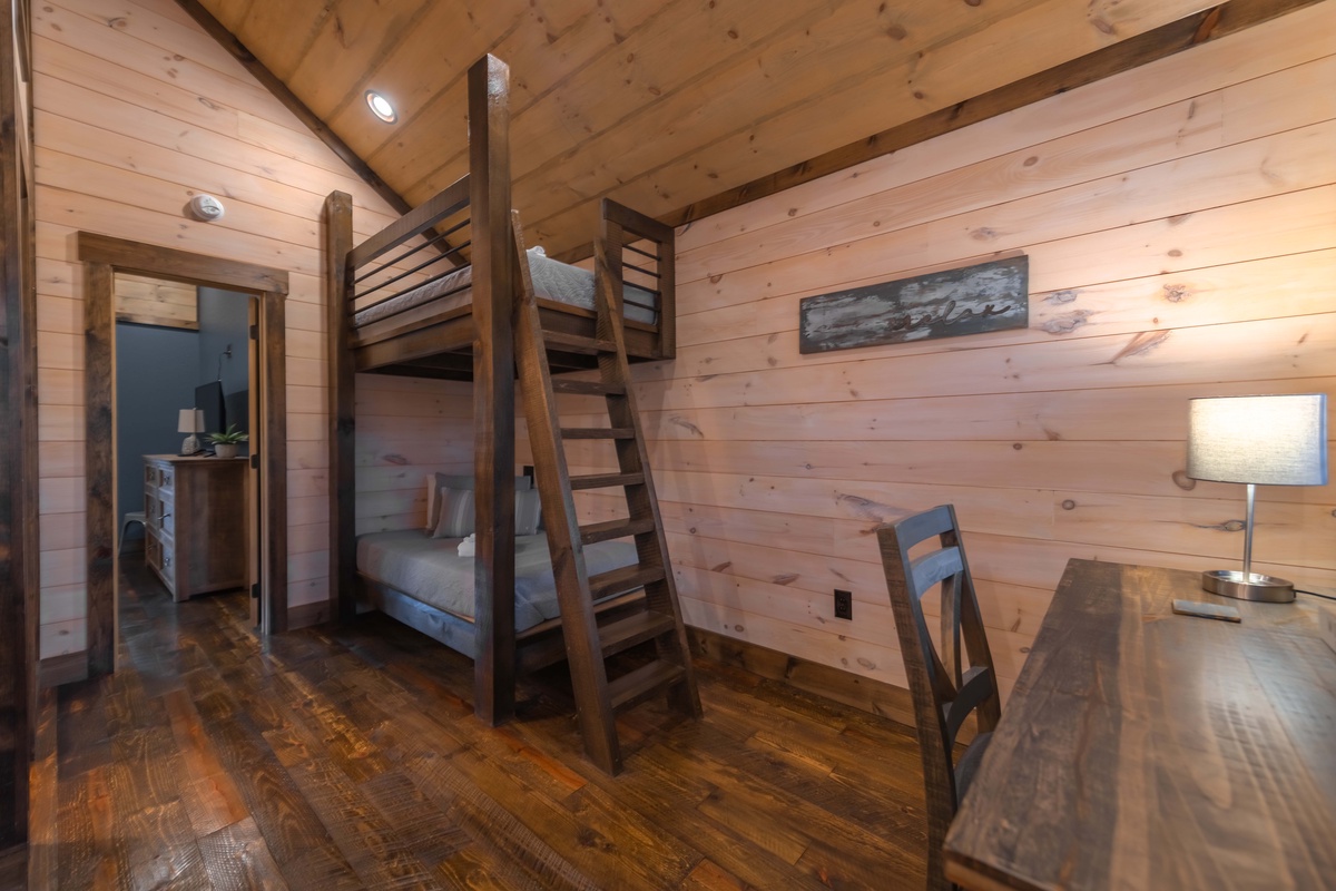 This cabin sleeps 10 guests with 3 King beds, 2 sets of bunk beds and 3.5 baths. Â