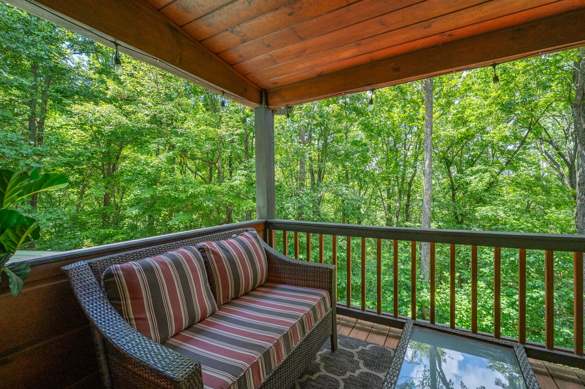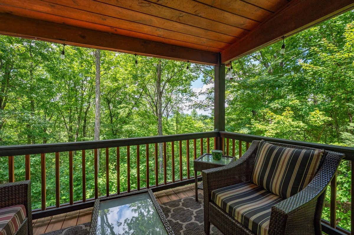 Outside is where Highlands Hideaway really shines. There is cornhole and a large Connect Four game for everyone to enjoy. There are three separate decks, each with its own vibe. Grill and dine under the trees on the main level. Sneak away with a good book to the upper balcony. On the lower level, soak in the hot tub, or with seating for a crowd, gather with friends and family under the Edison string lights overhead. After sunset, gather around the firepit for stories and s’mores under the stars. At Highlands Hideaway, your evenings are set.