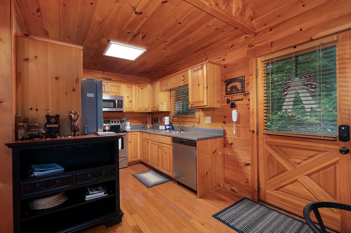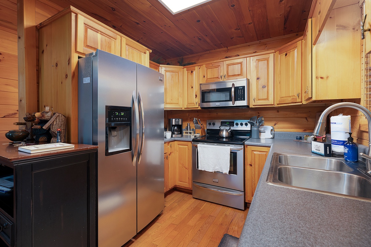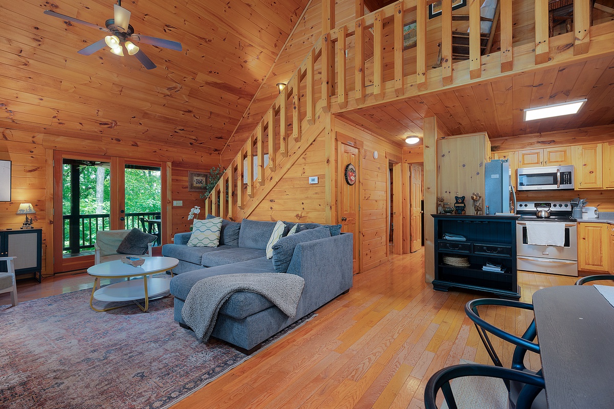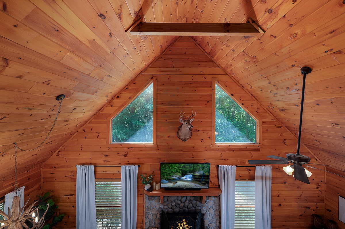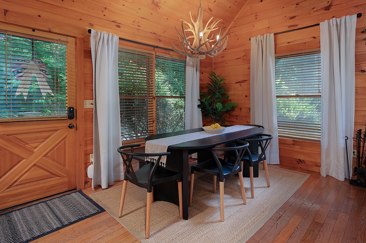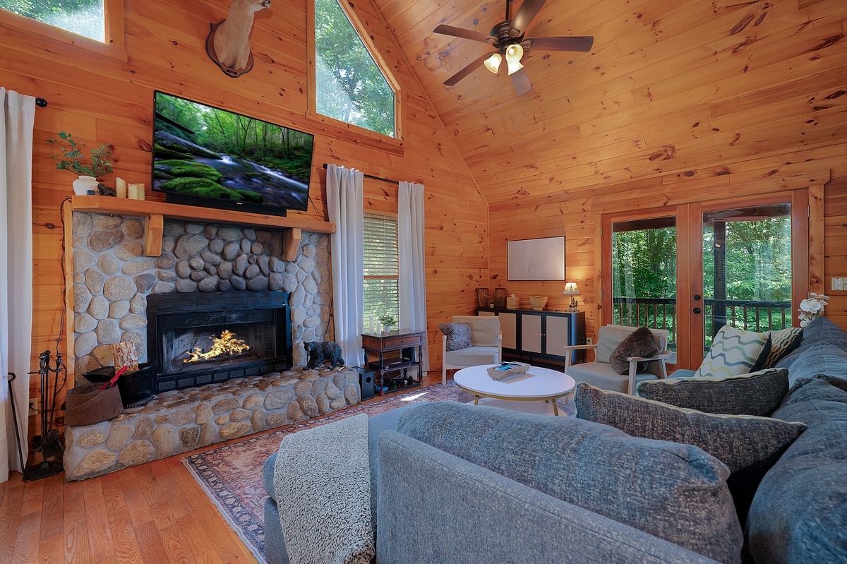 Inside, the main living area welcomes you with warm wood-paneled walls, a cozy stone fireplace, and a cushy sectional perfect for movie nights or morning coffee chats. The open dining area glows under an antler chandelier, and the kitchen is fully equipped for all of your culinary needs. The main-level queen bedroom opens onto the deck, offering a calming setting infused with the crisp scents of nature and the gentle symphony of rustling leaves and birdsong.